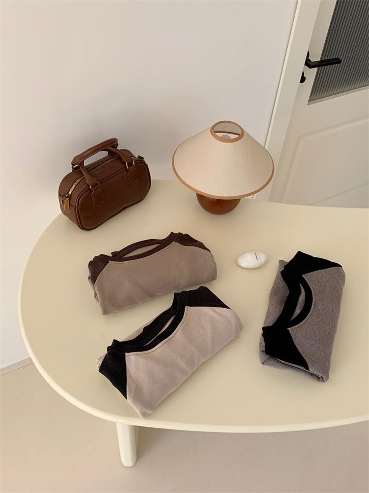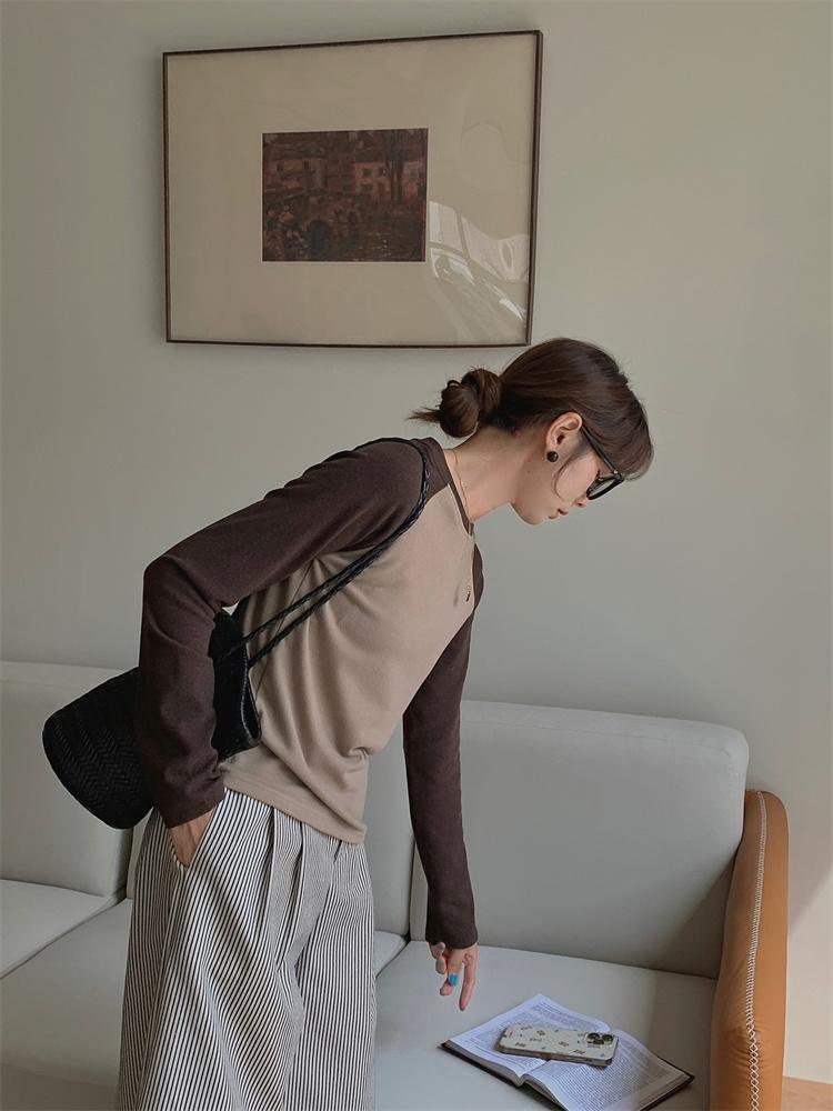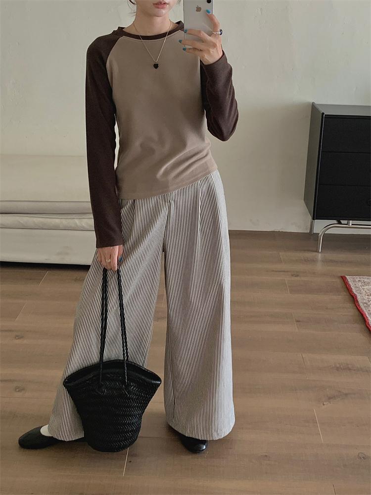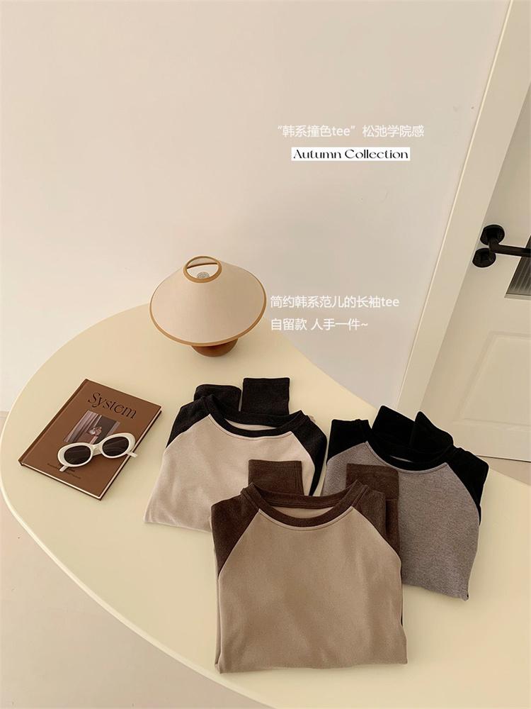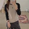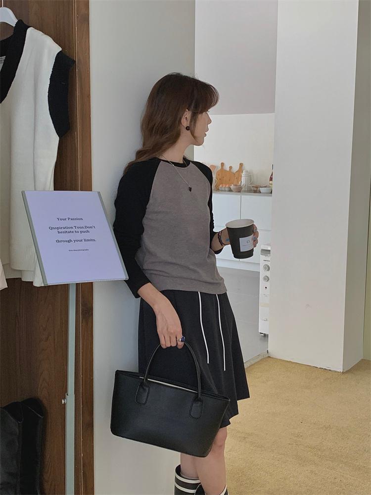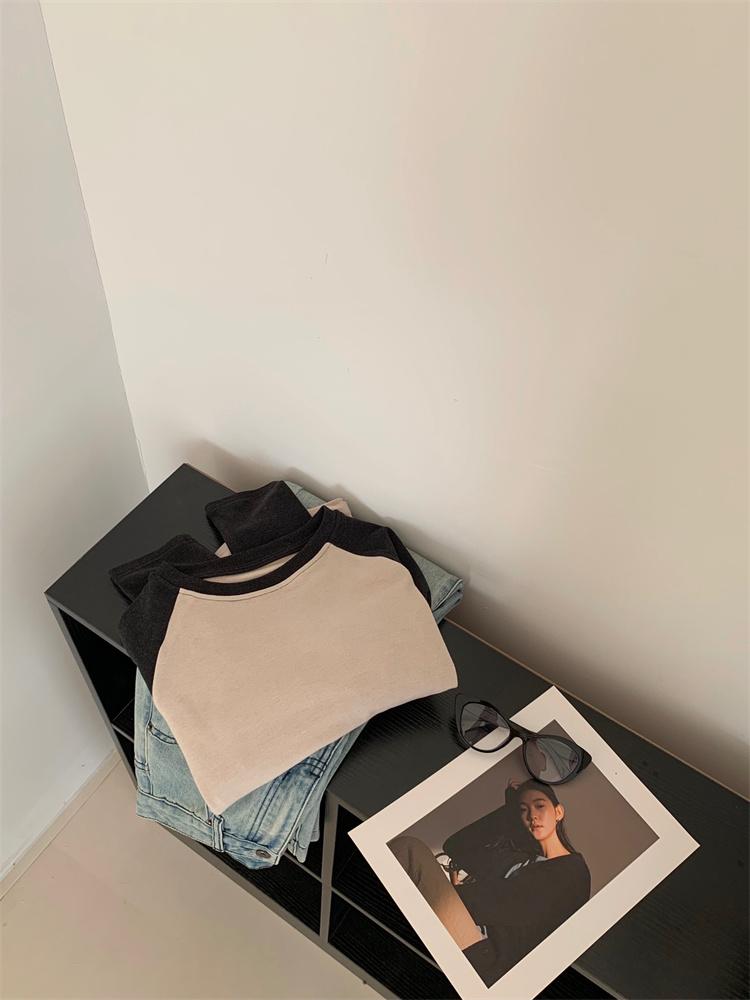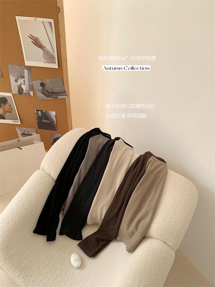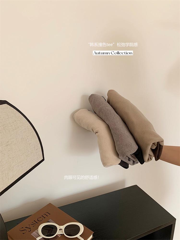 Camiseta Coreana de Cuello Redondo con Manga Raglán y Combinación de Colores para Mujer, Otoño e Invierno, Holgada, Adelgazante, Interior, Manga Larga, Camiseta Básica