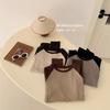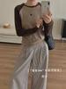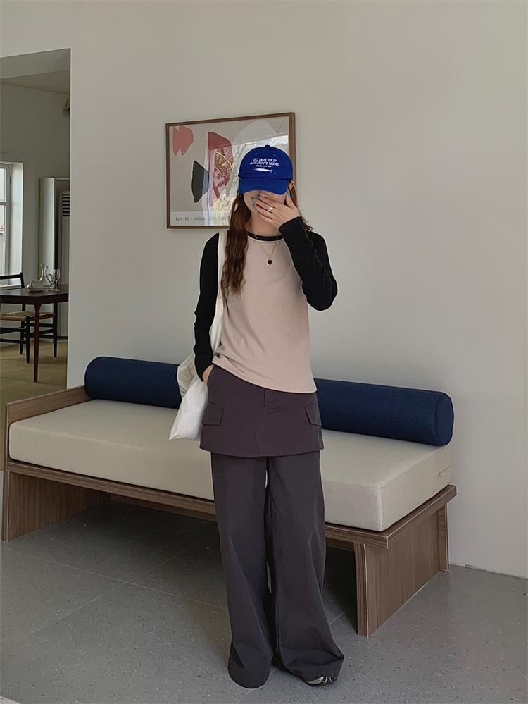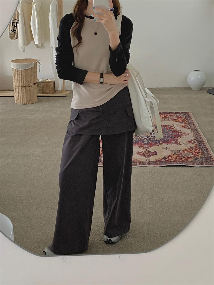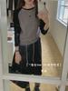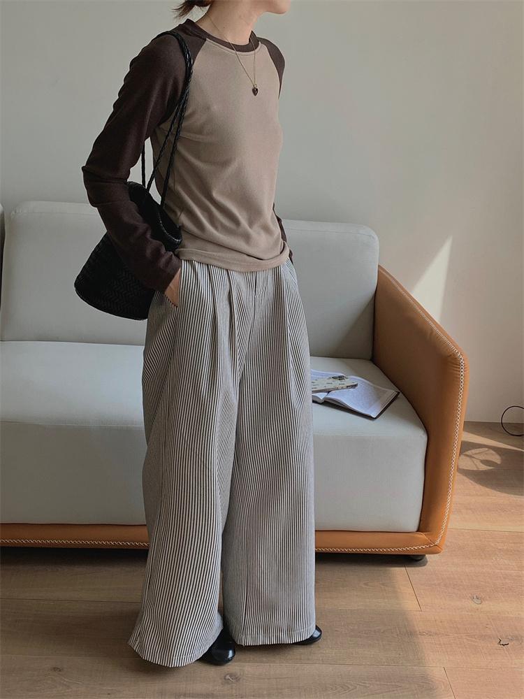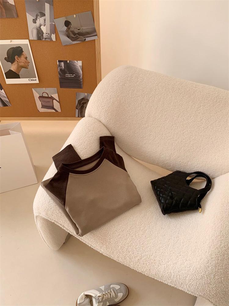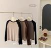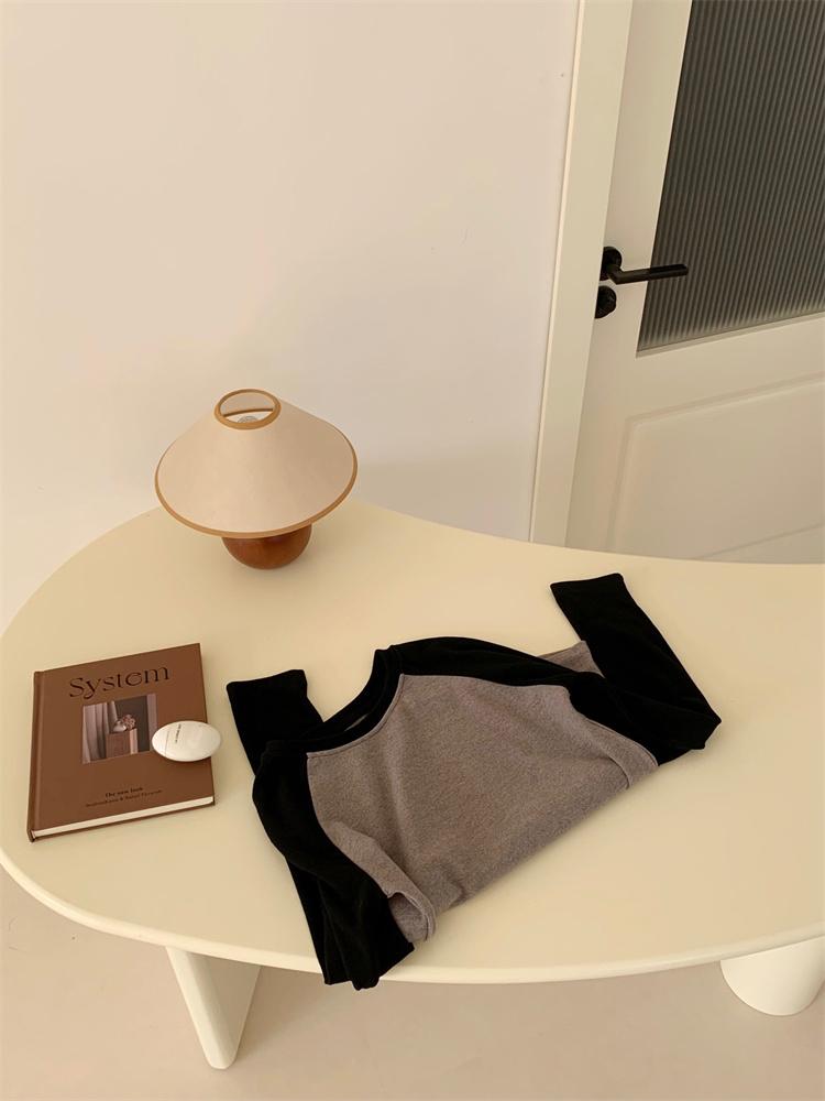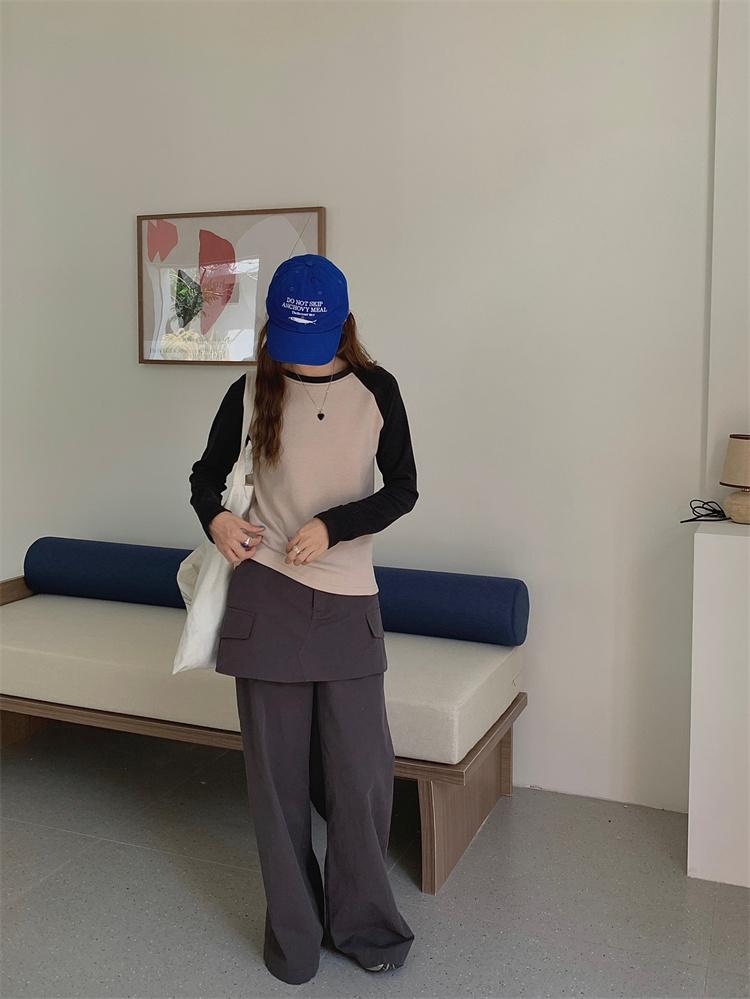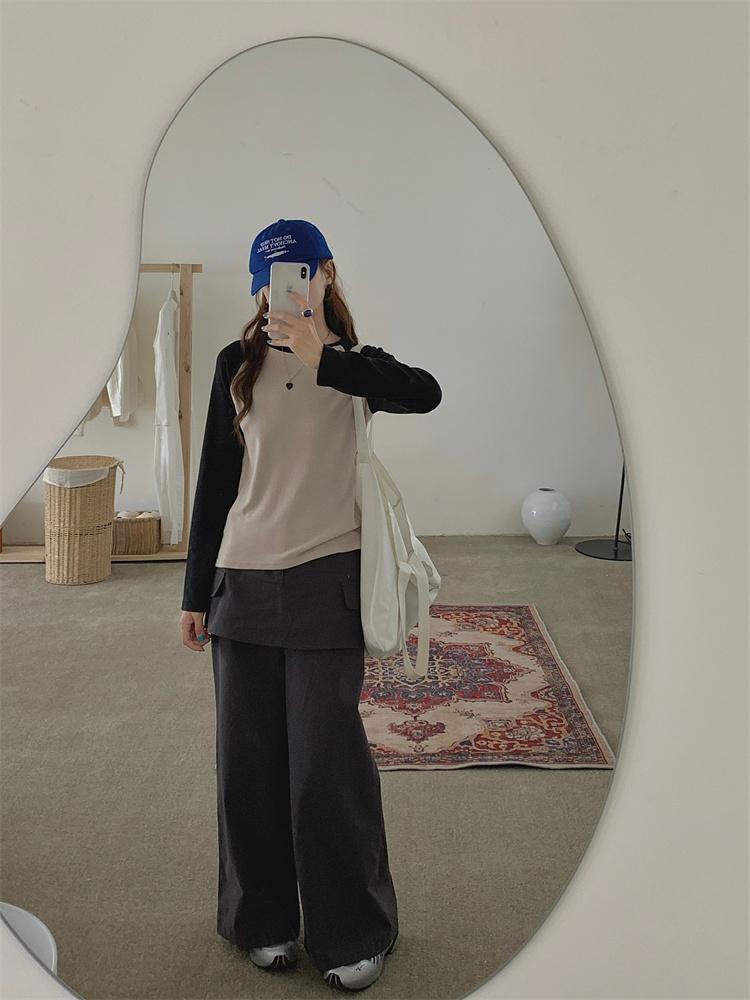 Camiseta Coreana de Cuello Redondo con Manga Raglán y Combinación de Colores para Mujer, Otoño e Invierno, Holgada, Adelgazante, Interior, Manga Larga, Camiseta Básica