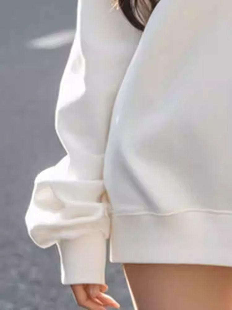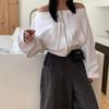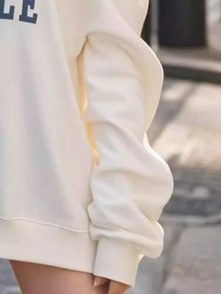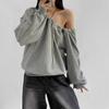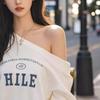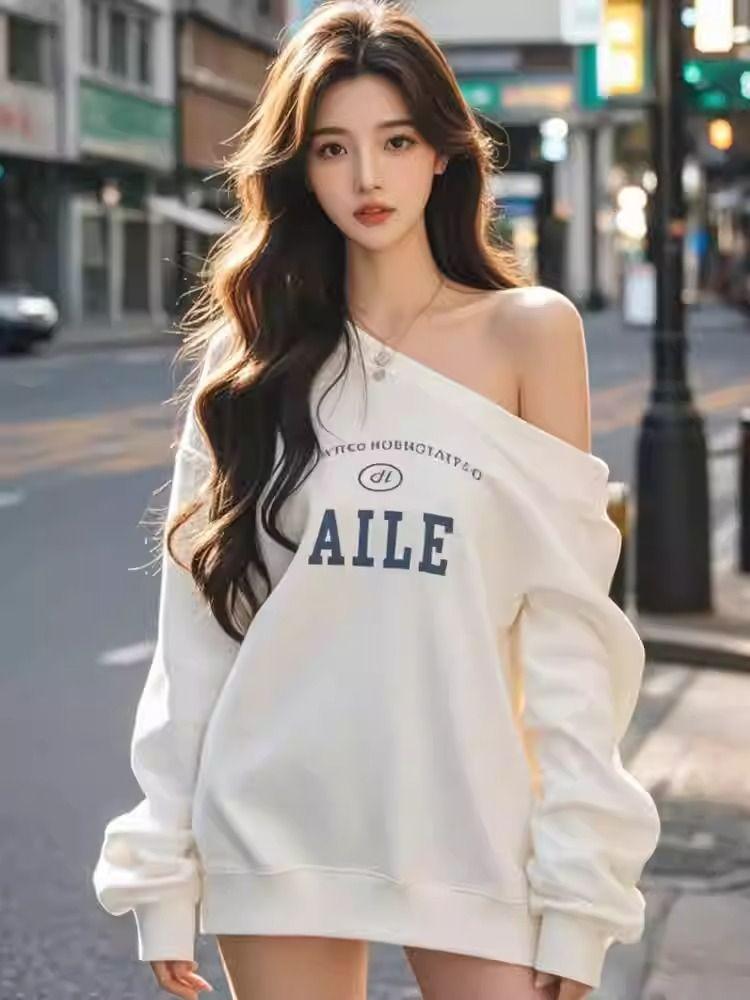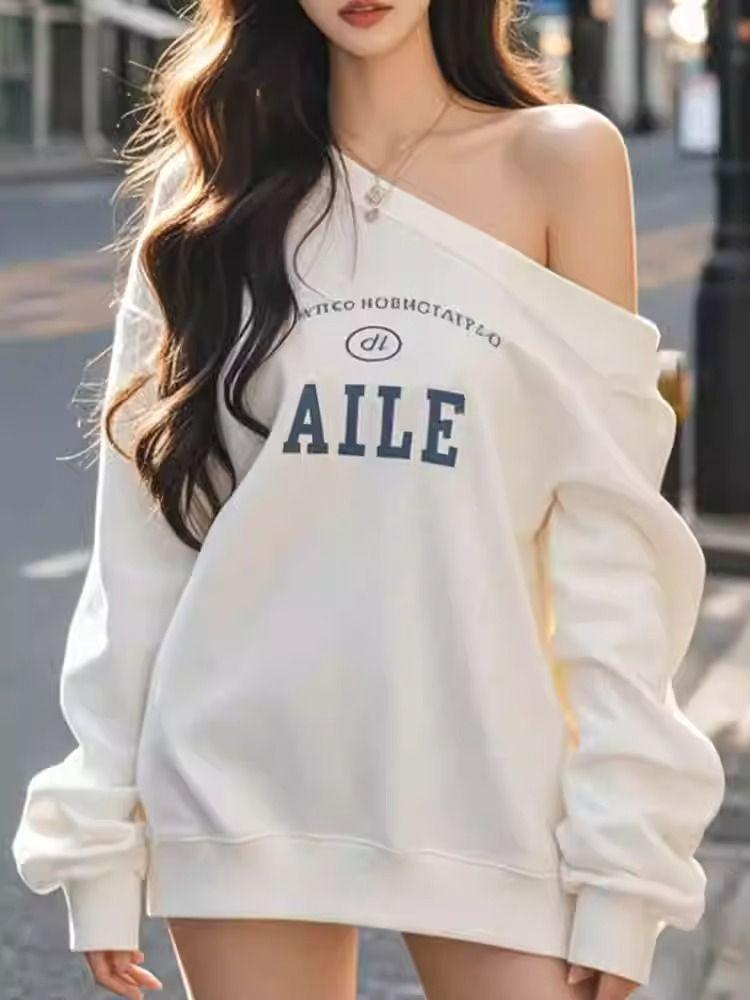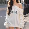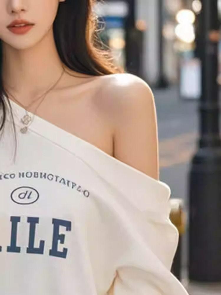 Otoño e invierno único perezoso hombro descubierto estampado de letras sudadera suelta mujeres sentido del diseño nicho manga larga top absolutamente hermoso
