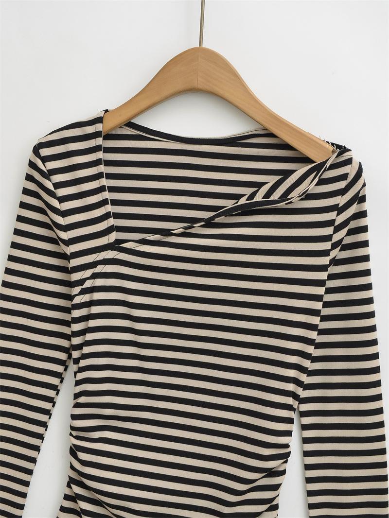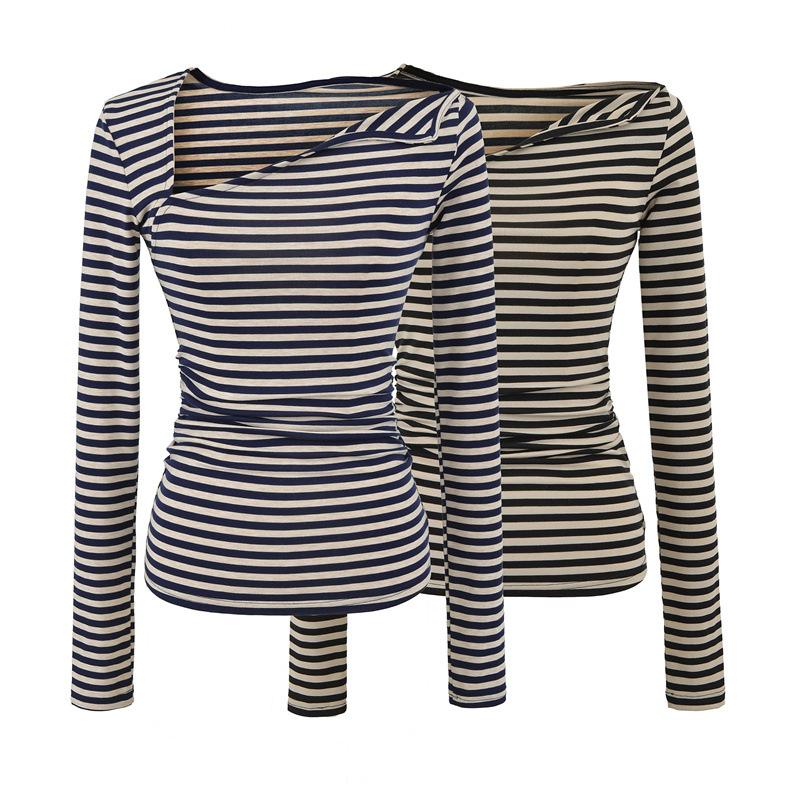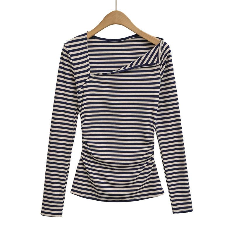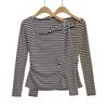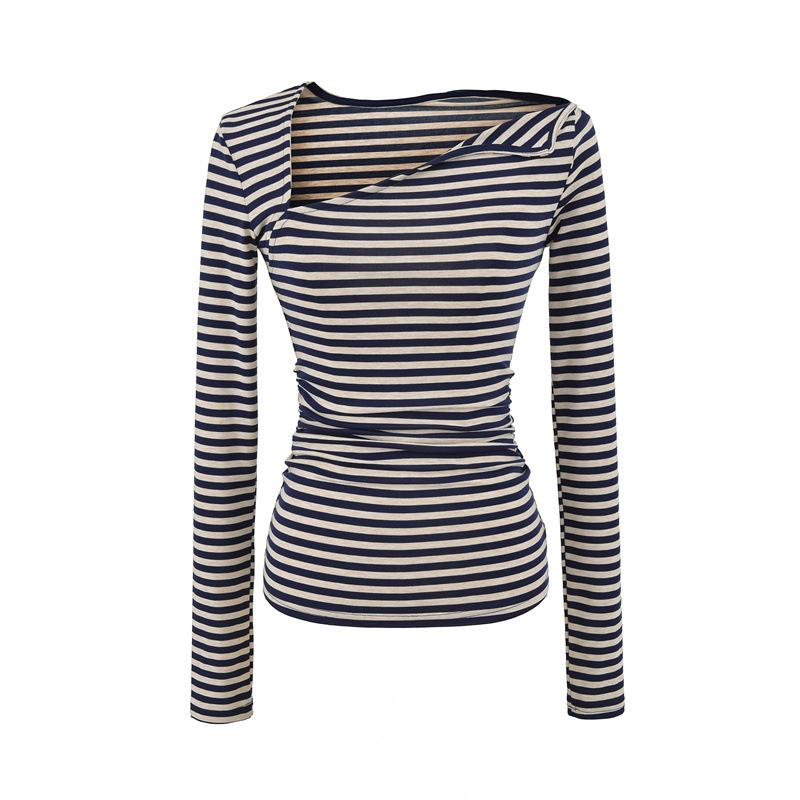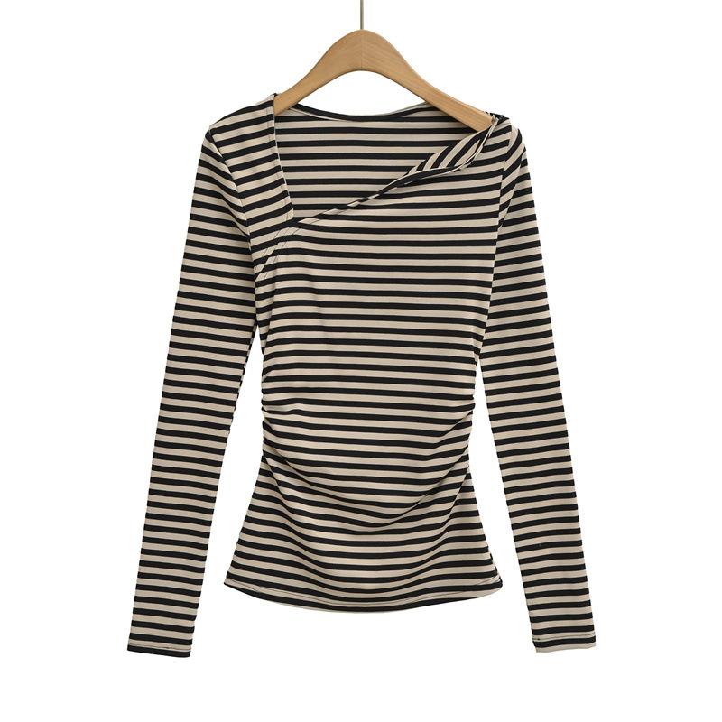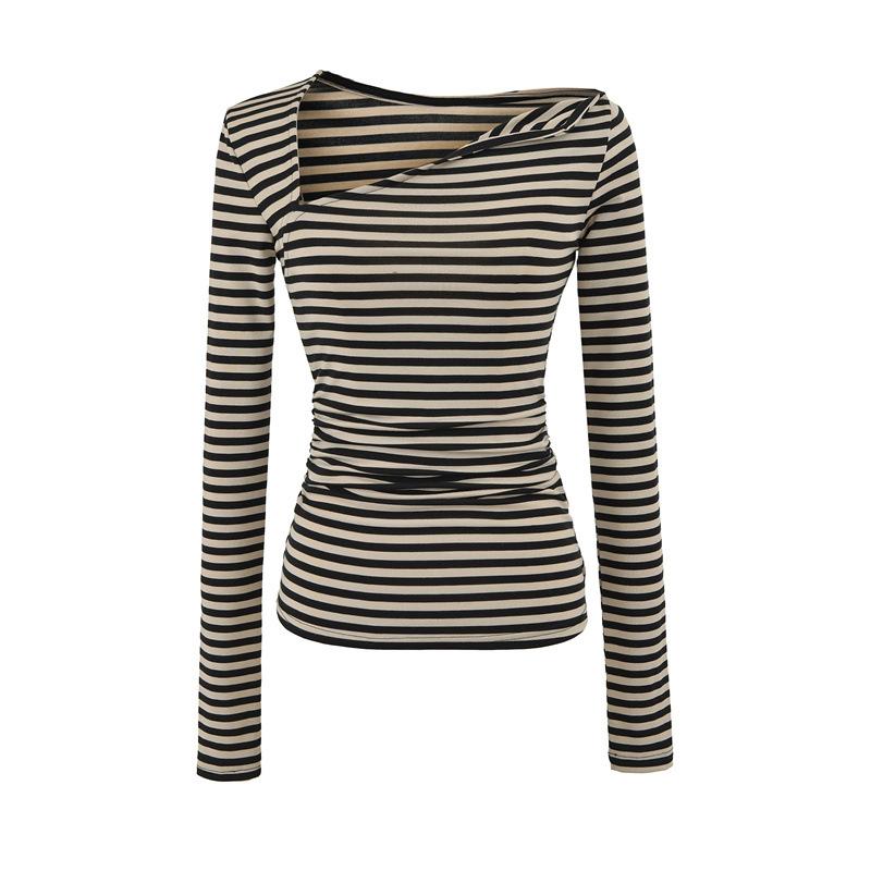 Sentido del Diseño Escote Asimétrico Irregular Cintura Fruncida Camiseta de Manga Larga a Rayas Otoño Nuevo Top Básico para Chica Hot Slim