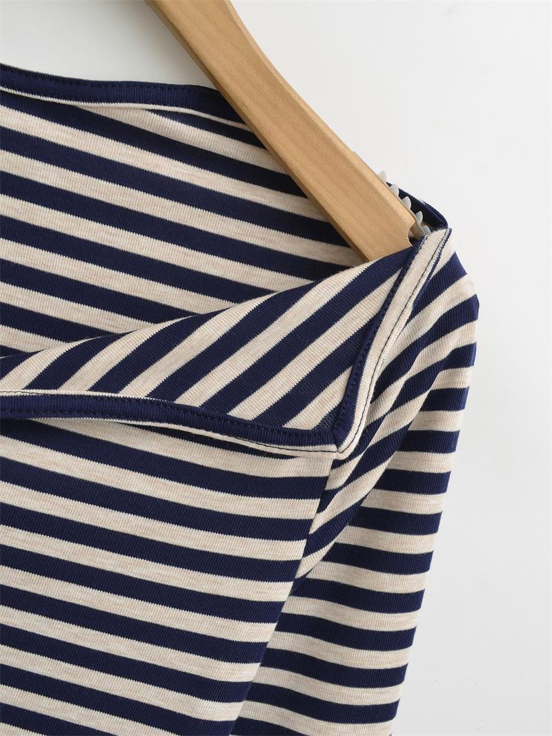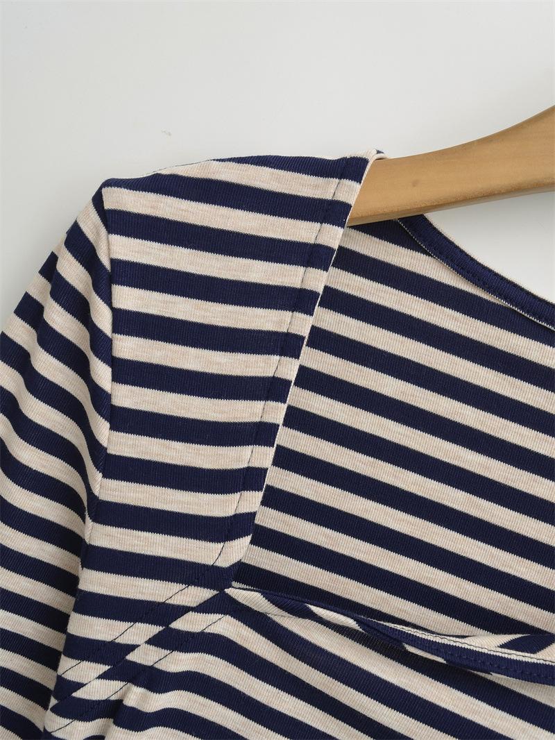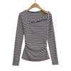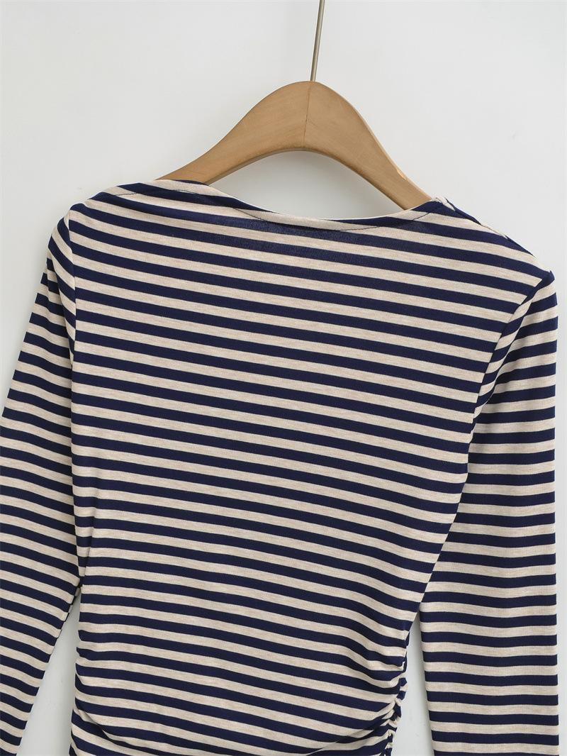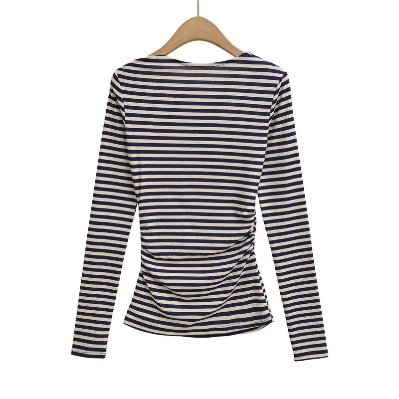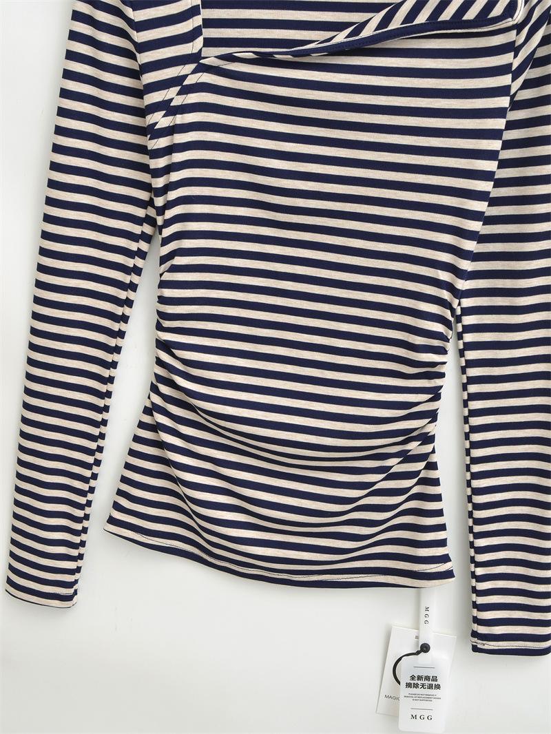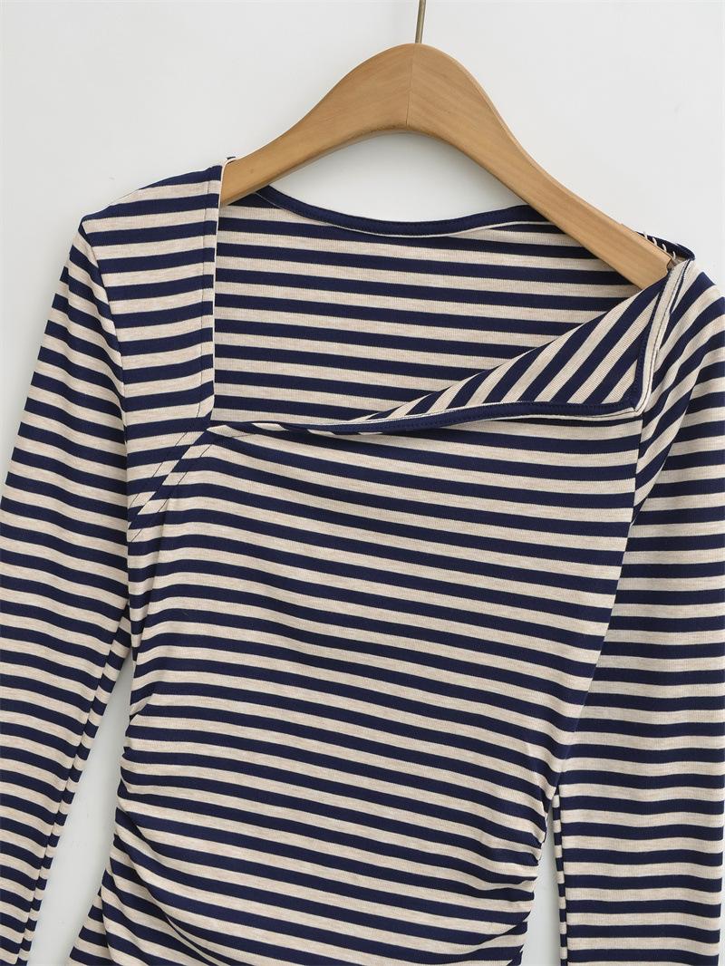 Sentido del Diseño Escote Asimétrico Irregular Cintura Fruncida Camiseta de Manga Larga a Rayas Otoño Nuevo Top Básico para Chica Hot Slim