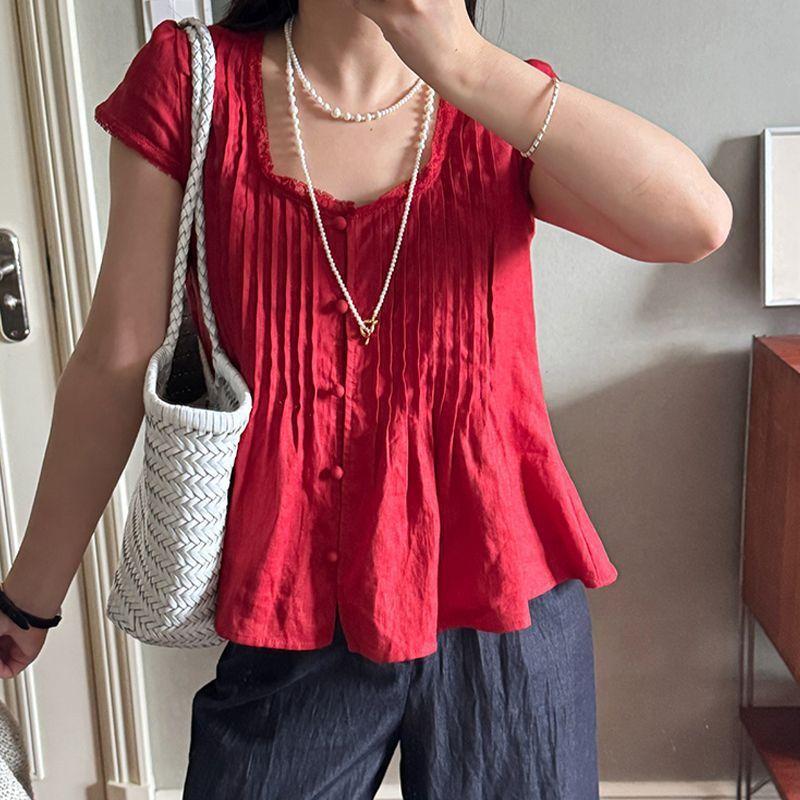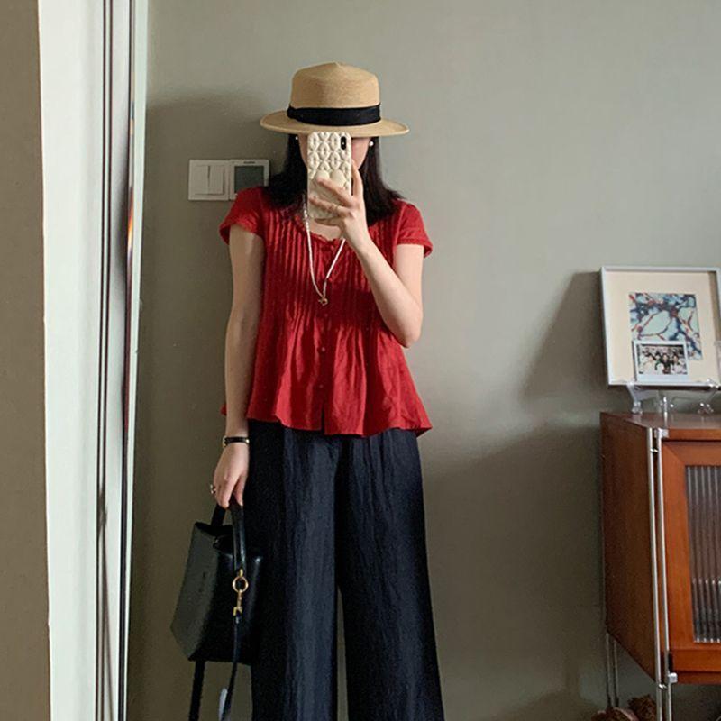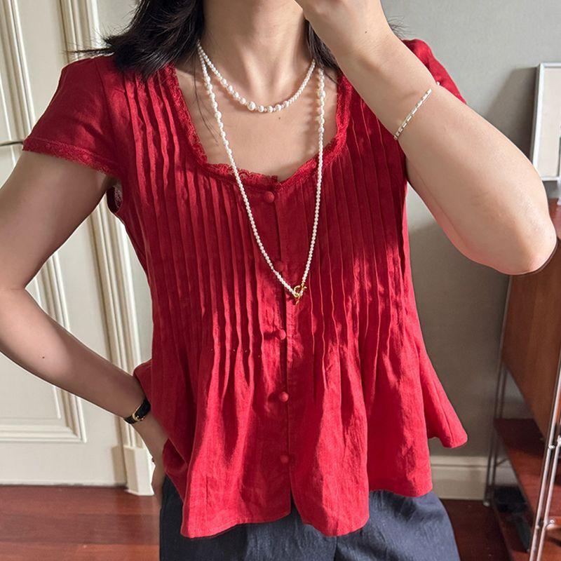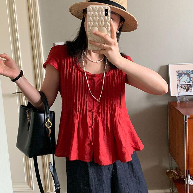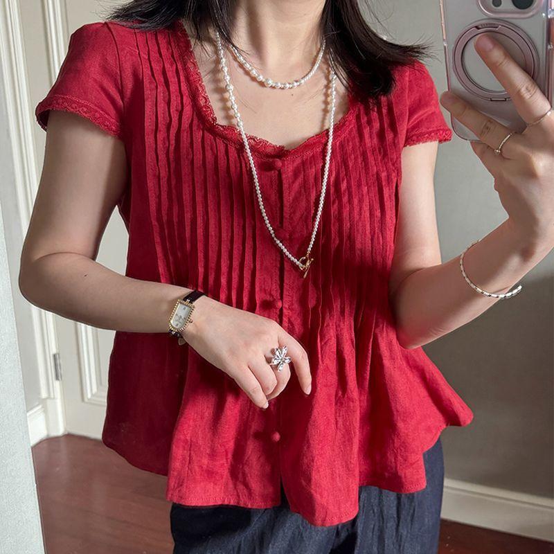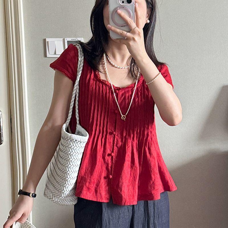 Camiseta de manga corta con cuello redondo y diseño plisado de estilo nuevo, camiseta de manga corta para mujer con diseño de nicho y estilo extranjero, top de manga corta rojo