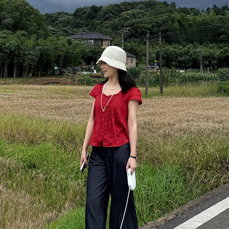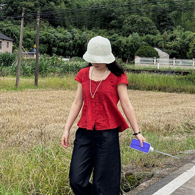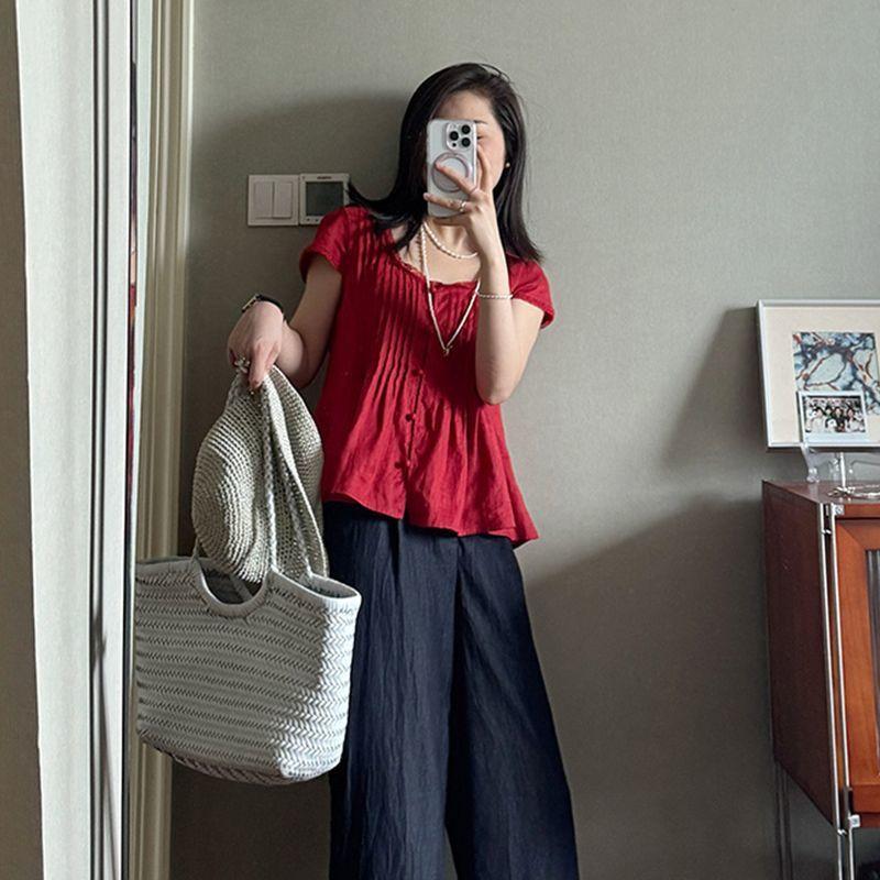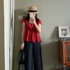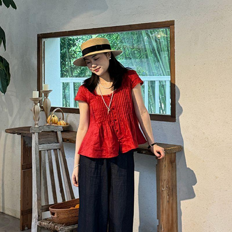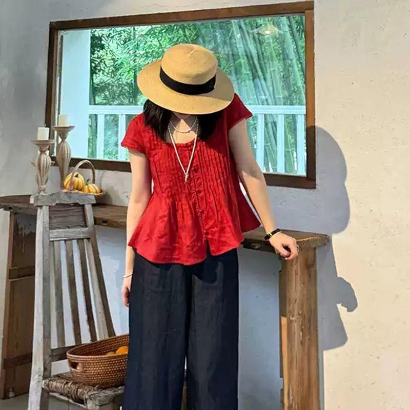 Camiseta de manga corta con cuello redondo y diseño plisado de estilo nuevo, camiseta de manga corta para mujer con diseño de nicho y estilo extranjero, top de manga corta rojo