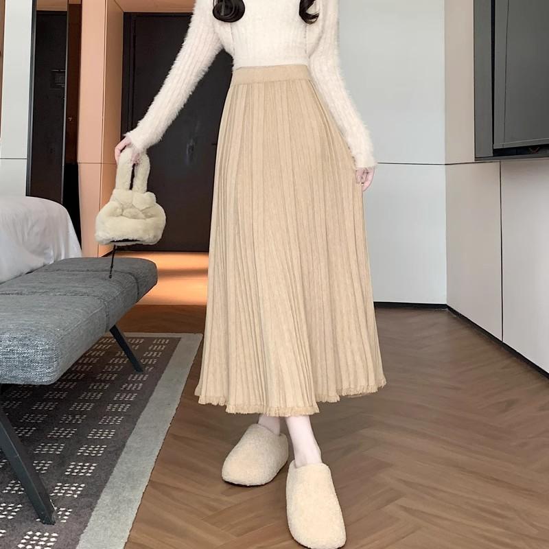 Falda Midi Plisada de Punto con Borlas Estilo Coreano Mujer 25 Otoño/Invierno Retro Cintura Alta Adelgazante A-line Falda Larga