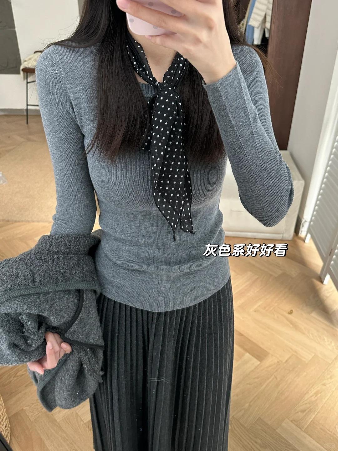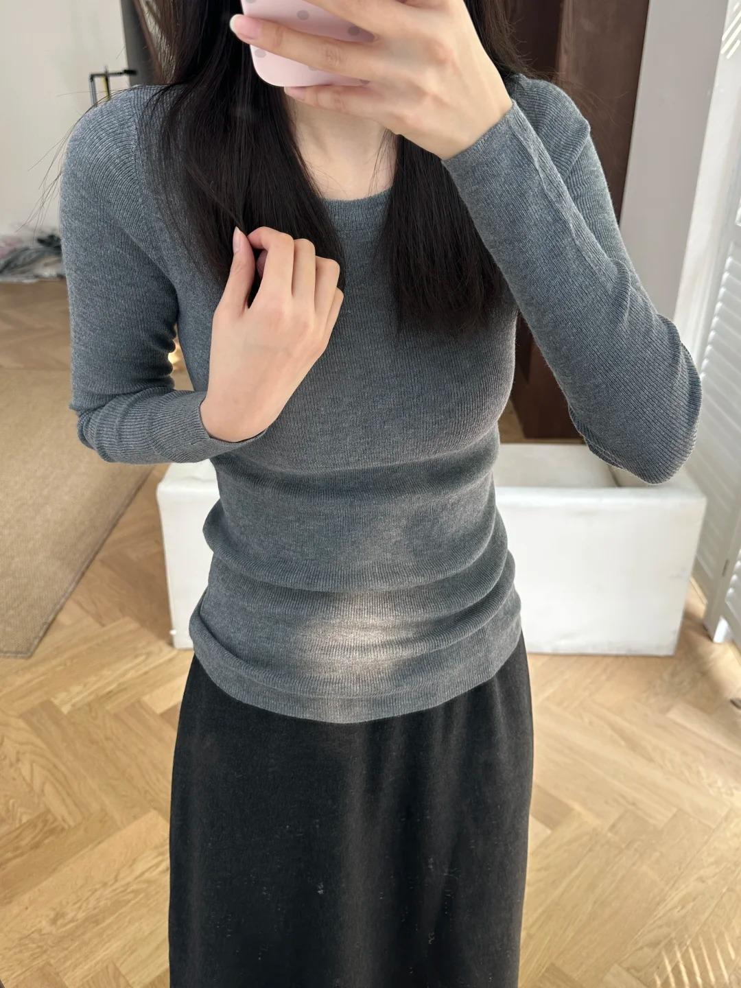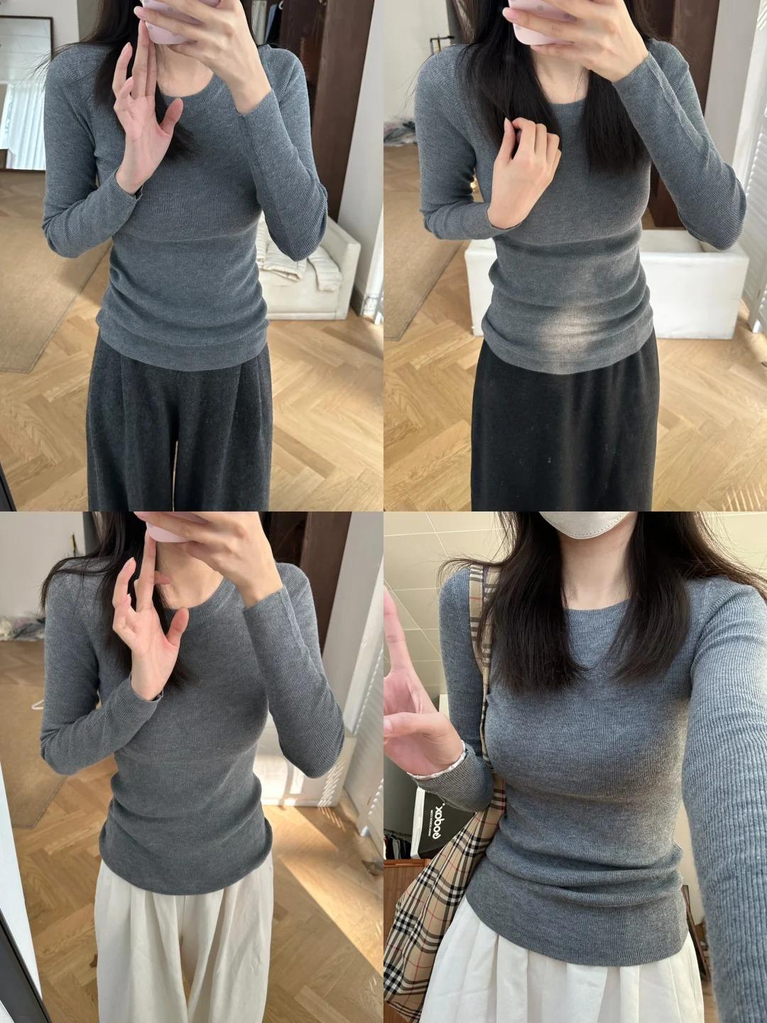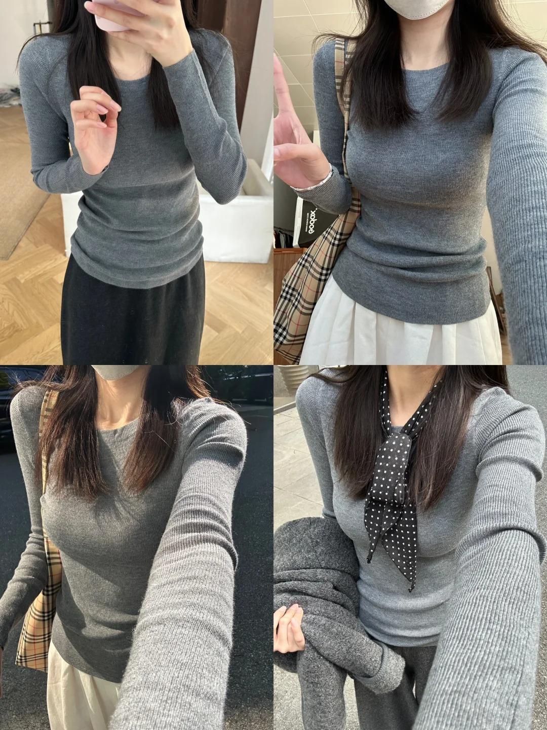 Suéter de Punto Gris de Alta Gama para Mujer, Adecuado para Primavera, Otoño e Invierno, Top de Capa Base Adelgazante, Estilo Coreano, Suave y Elegante, Prenda Interior de Manga Larga