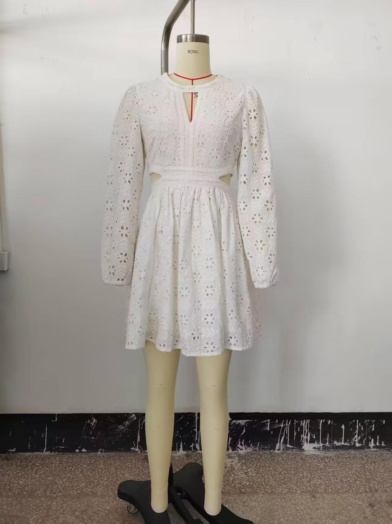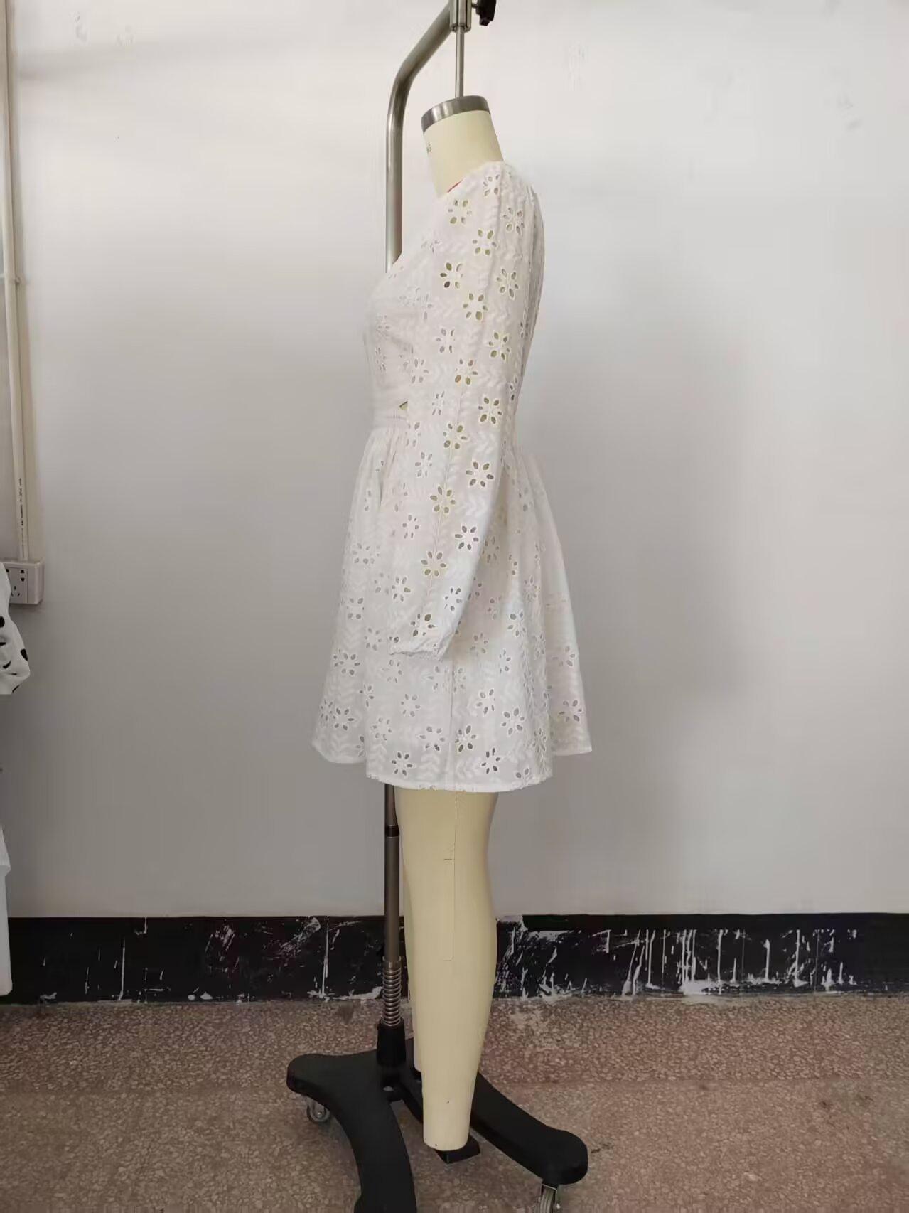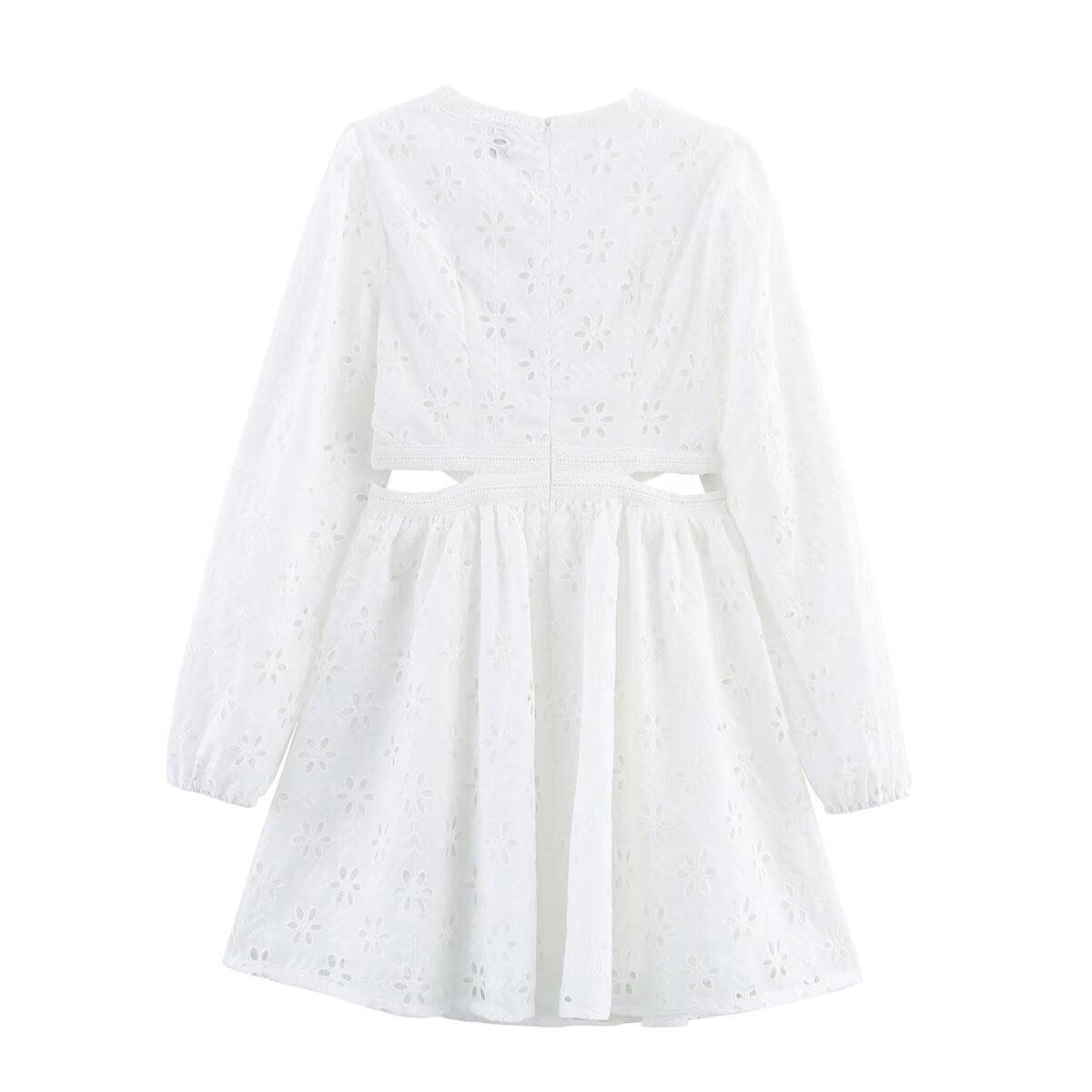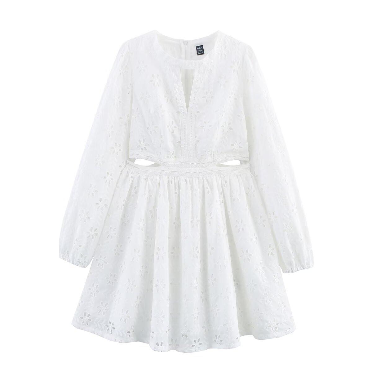 Vestido de mujer de moda nueva de otoño 2025 transfronterizo europeo y americano, temperamento, cuello en V, encaje en la cintura, calado, estilo ins, para mujer