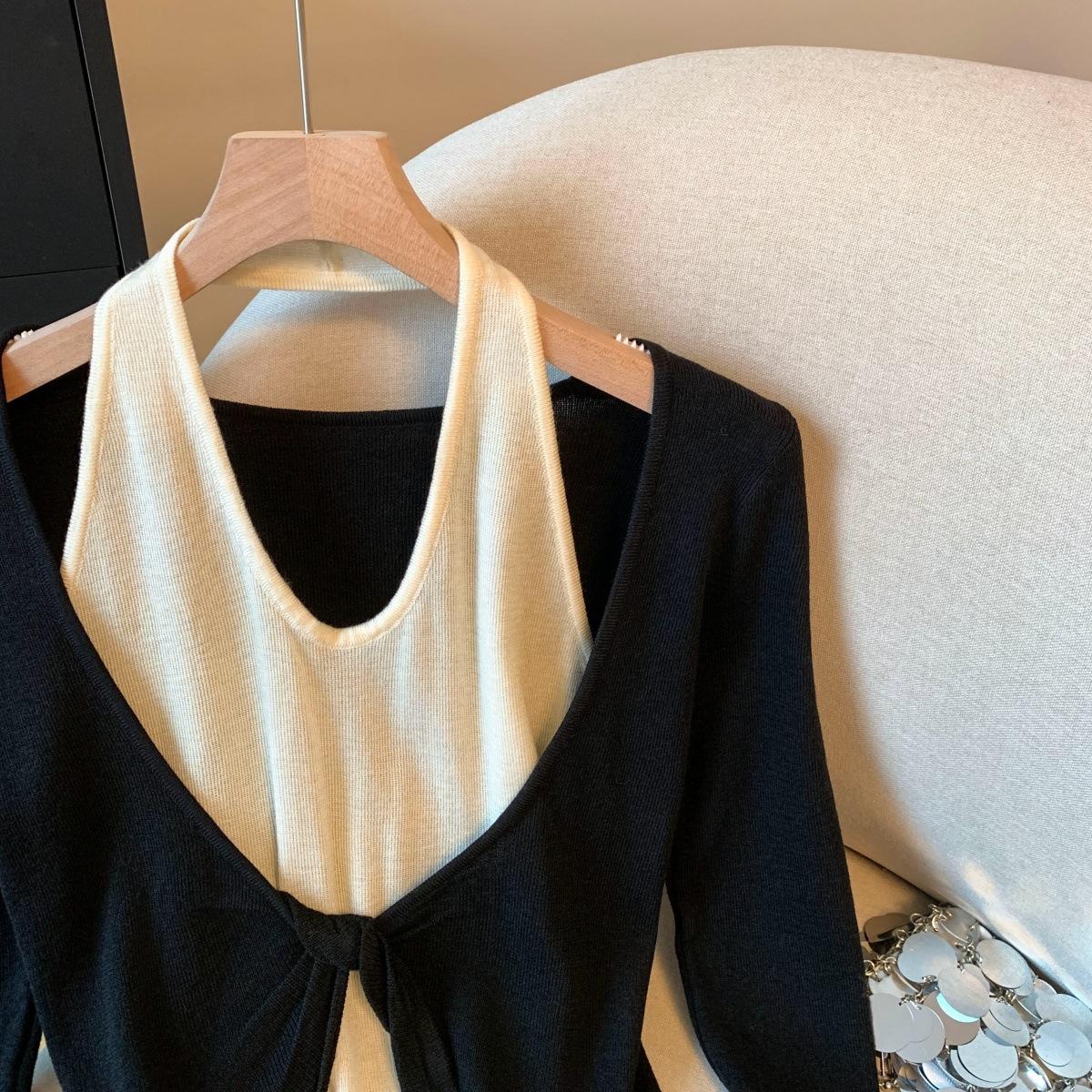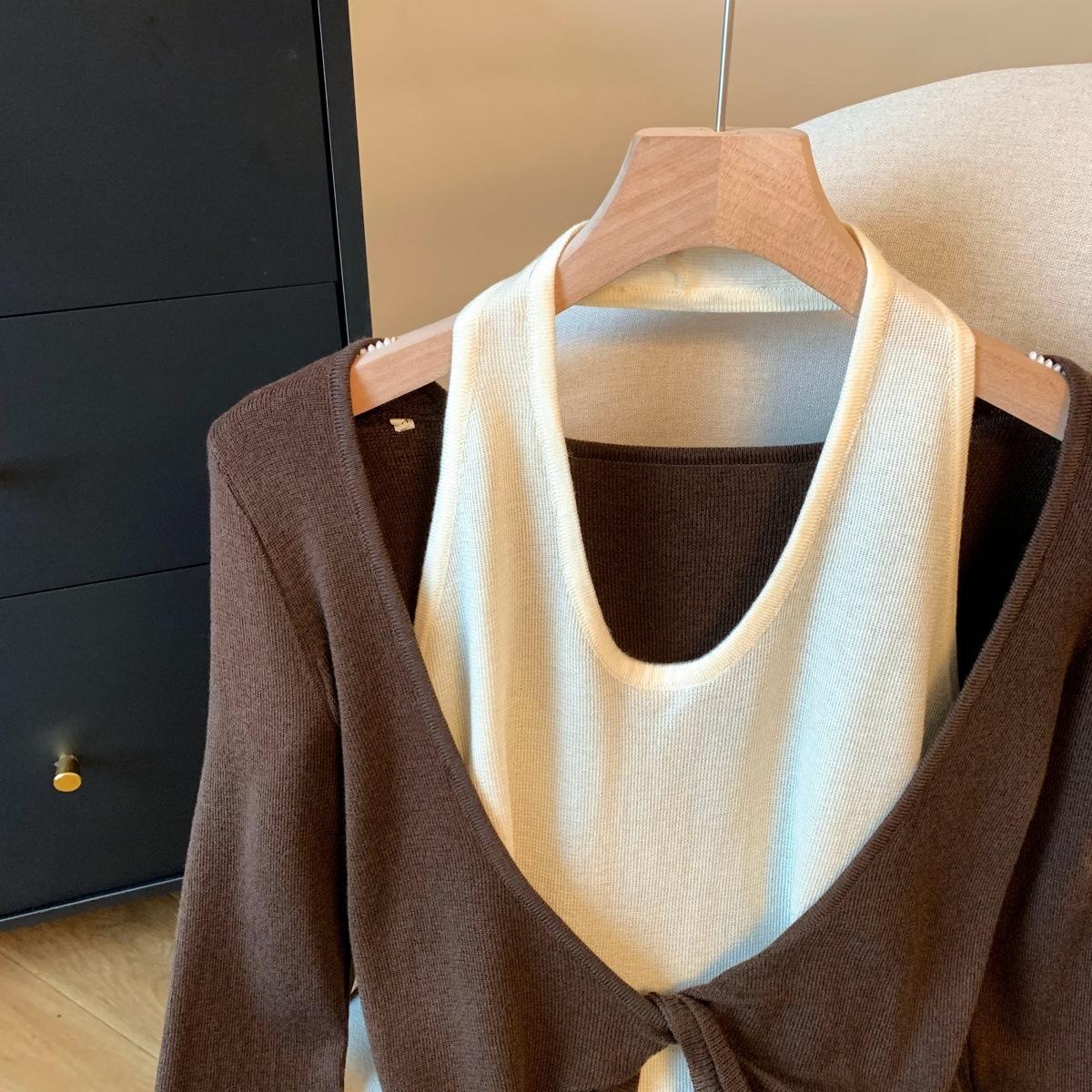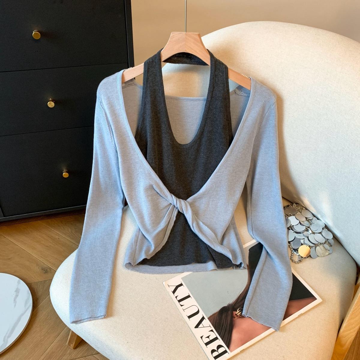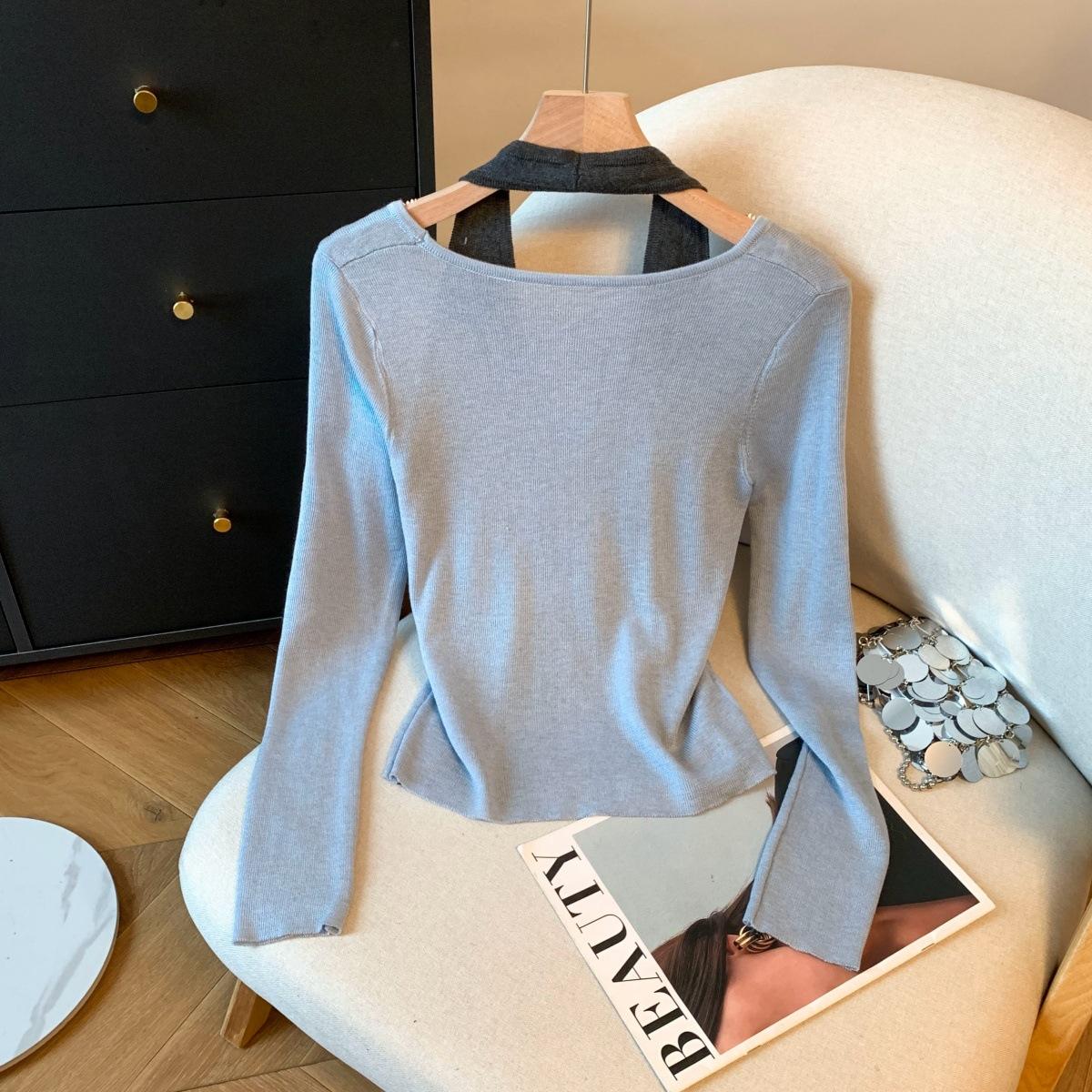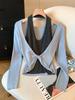 Otoño 2025 Ropa Nueva para Mujer Estilo Coreano Falso Dos Piezas Suéter Tejido para Dama Adelgazante Nicho Bloque de Color Top Mujer A7477