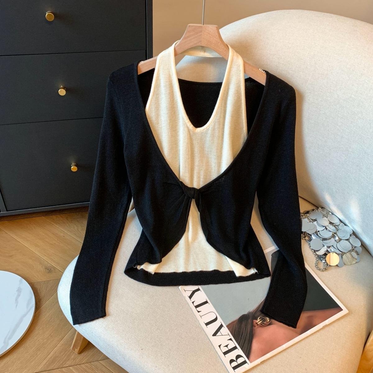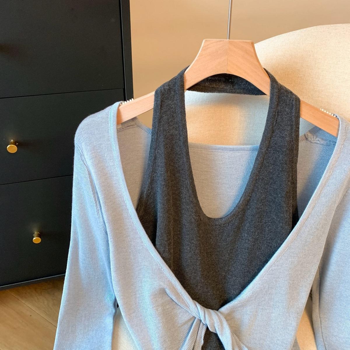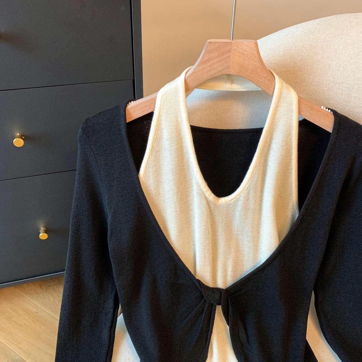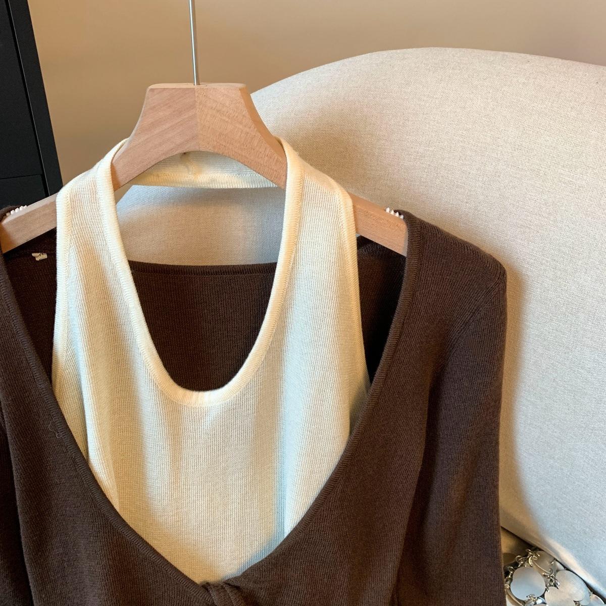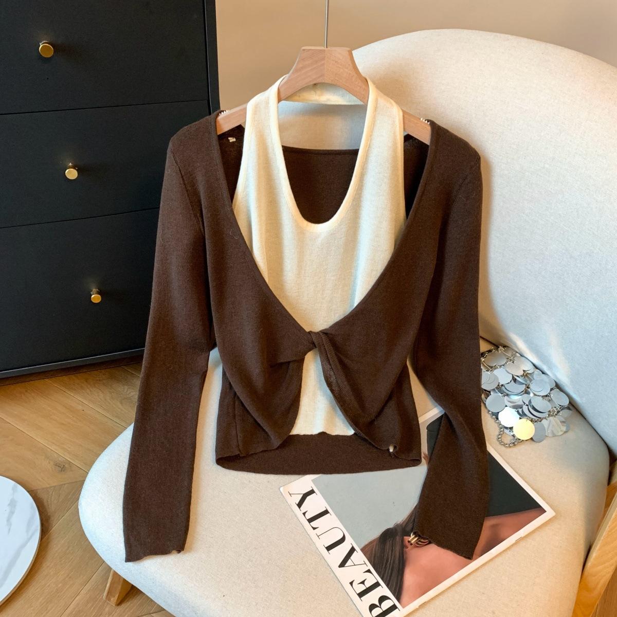 Otoño 2025 Ropa Nueva para Mujer Estilo Coreano Falso Dos Piezas Suéter Tejido para Dama Adelgazante Nicho Bloque de Color Top Mujer A7477