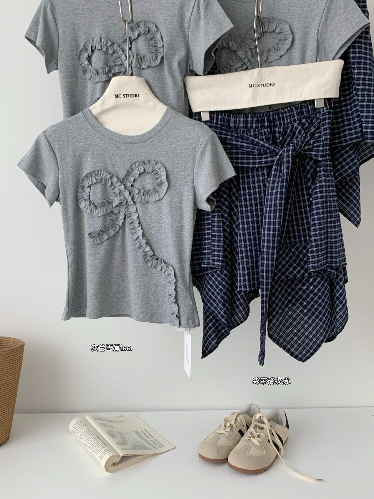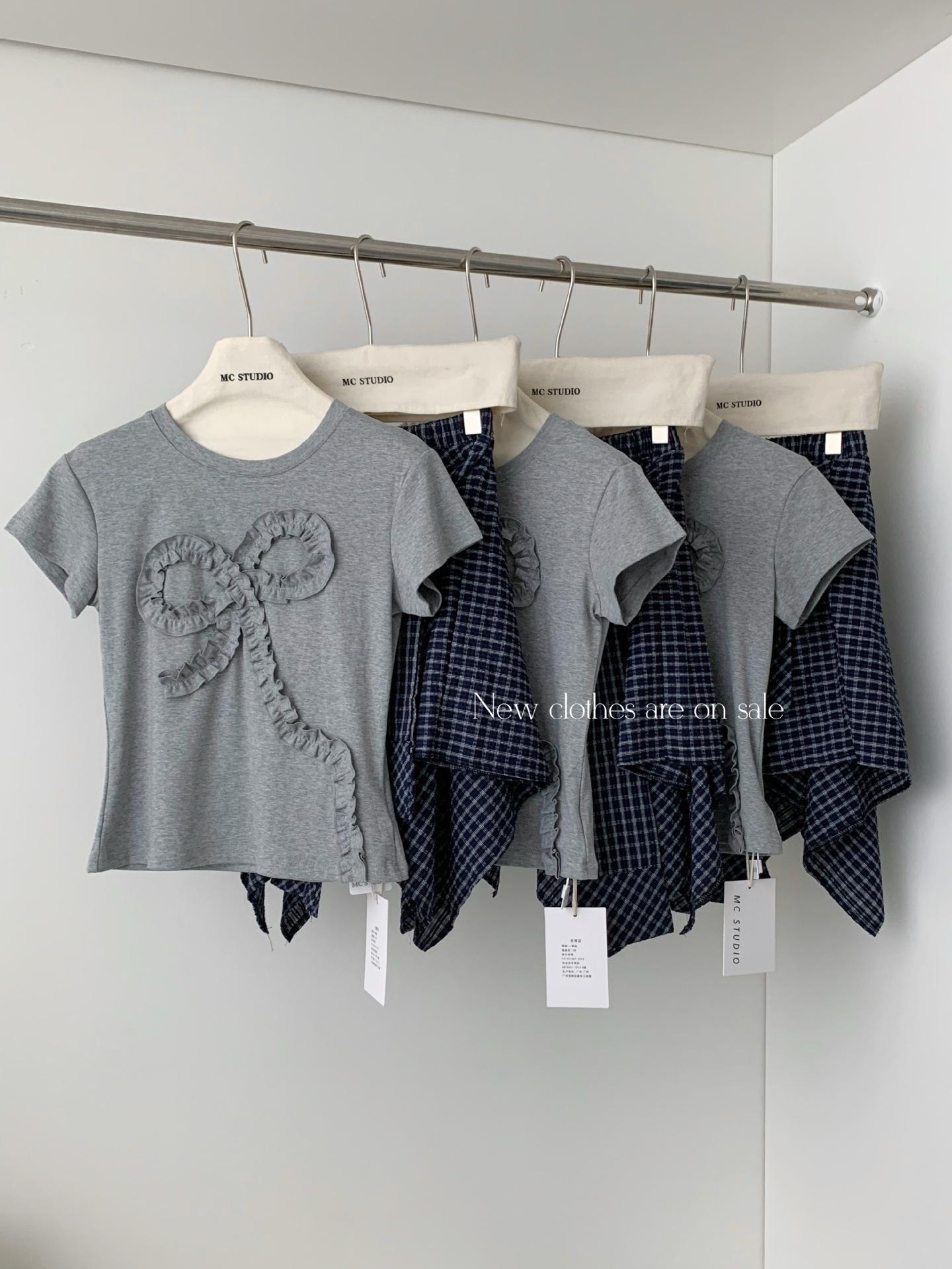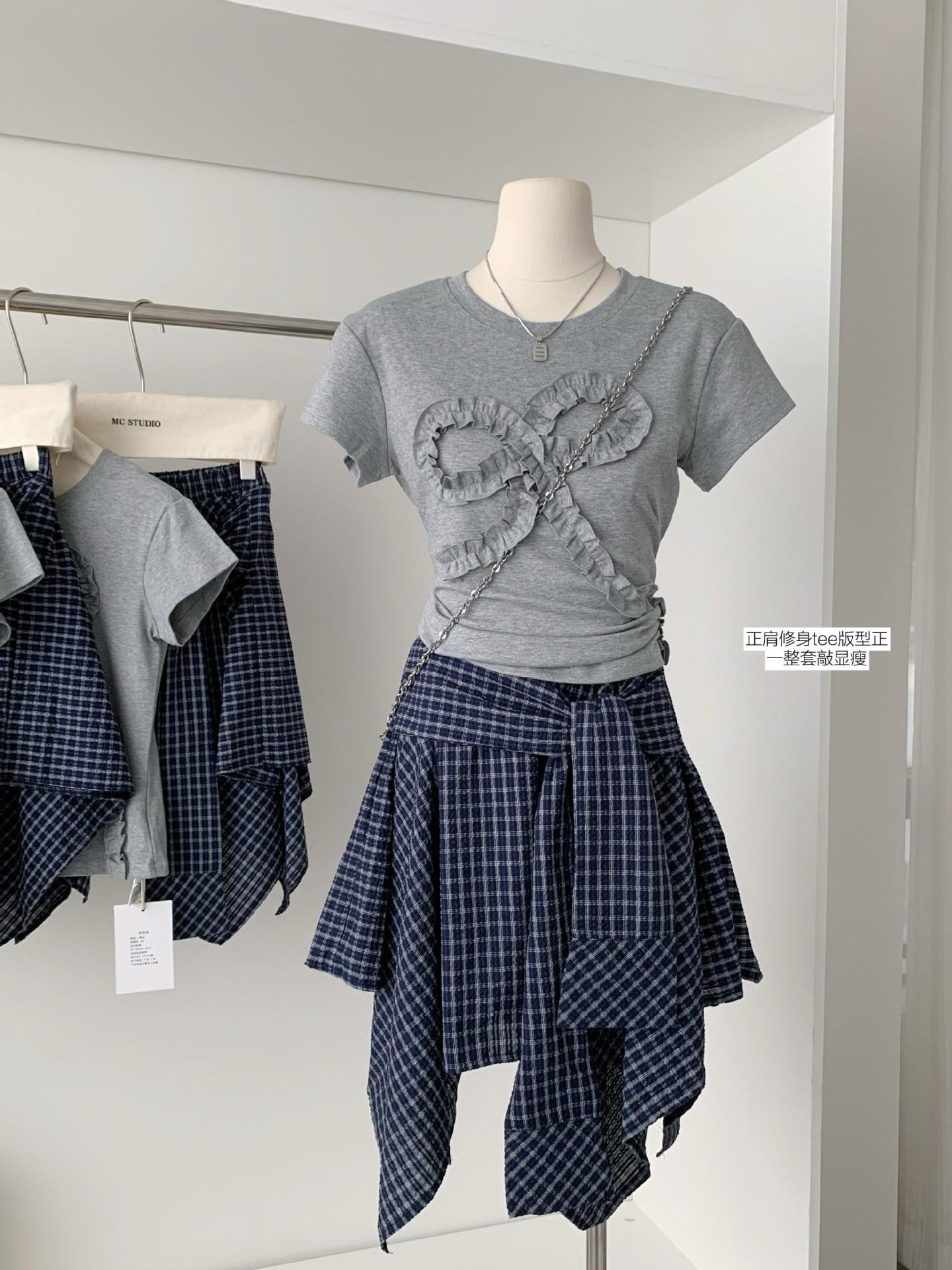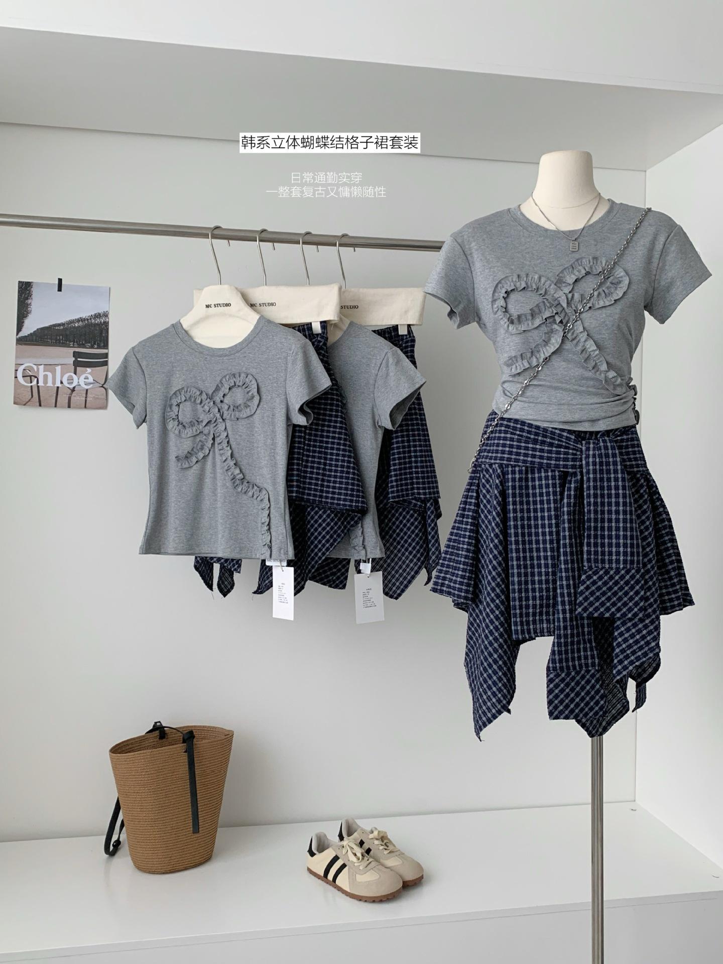 Traje Estilo Dulce Gris Manga Corta Cuello Redondo Camiseta Lazo Falda con Tirantes Irregulares de Verano para Mujer Set de Dos Piezas