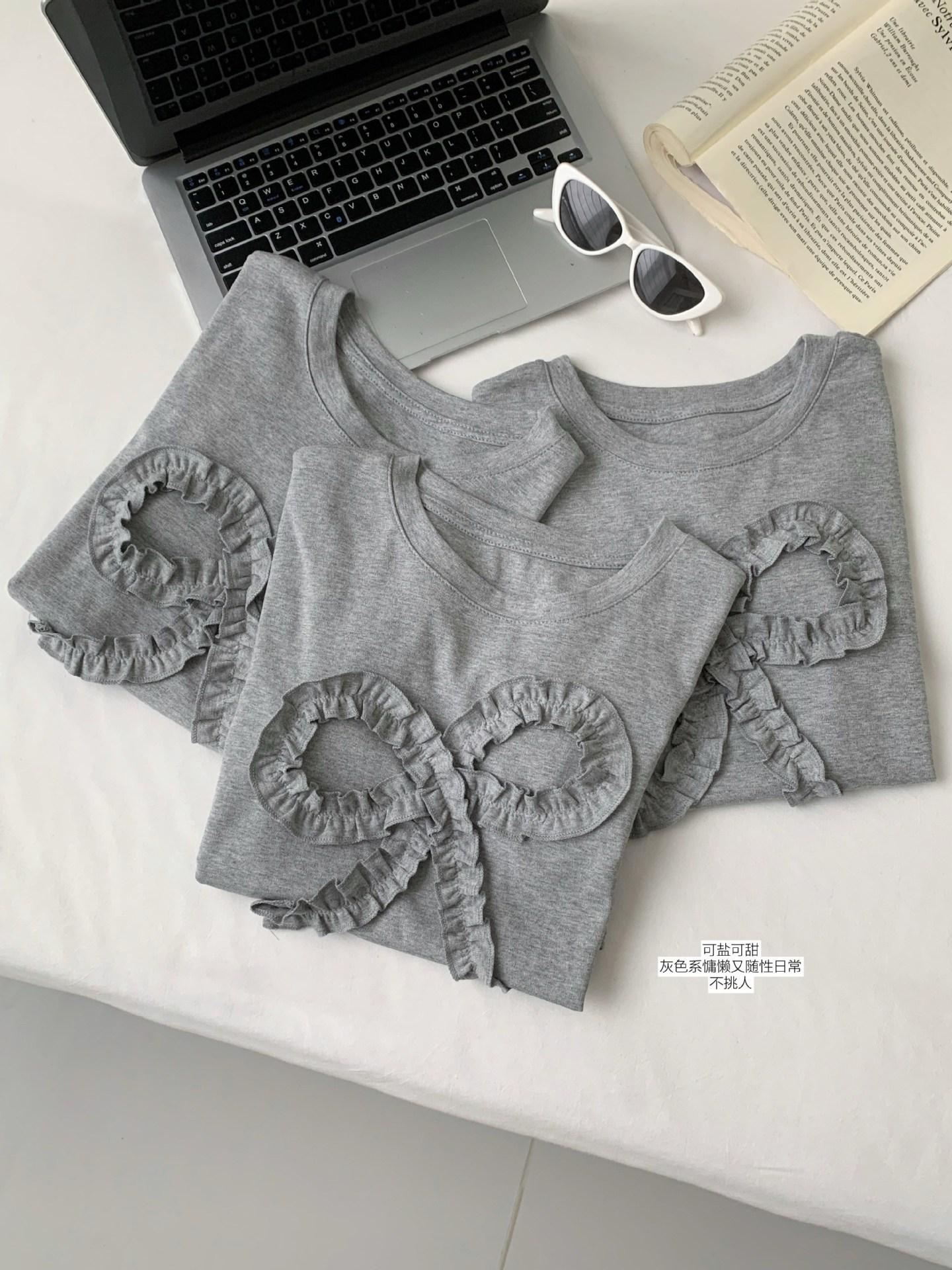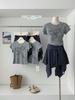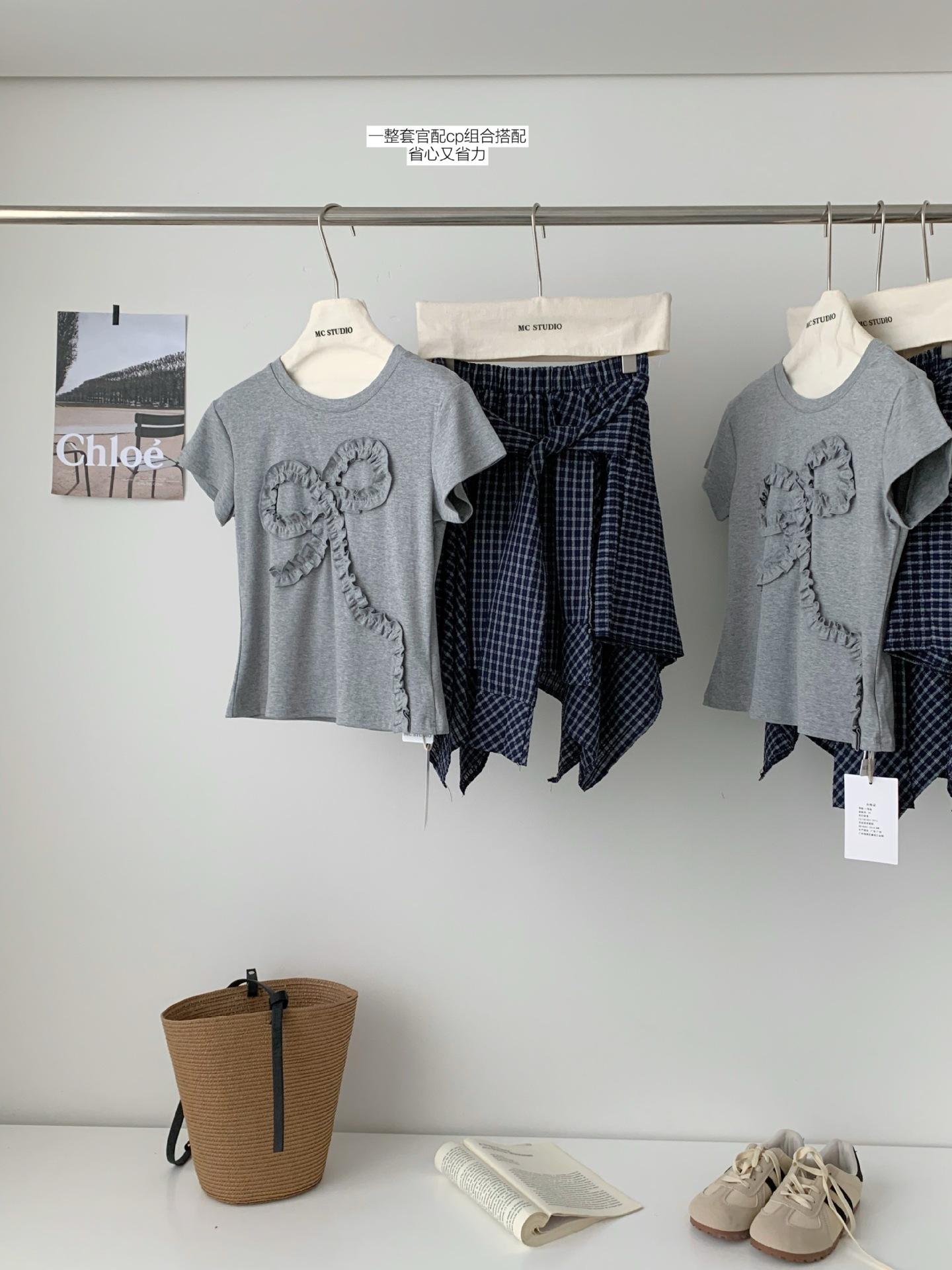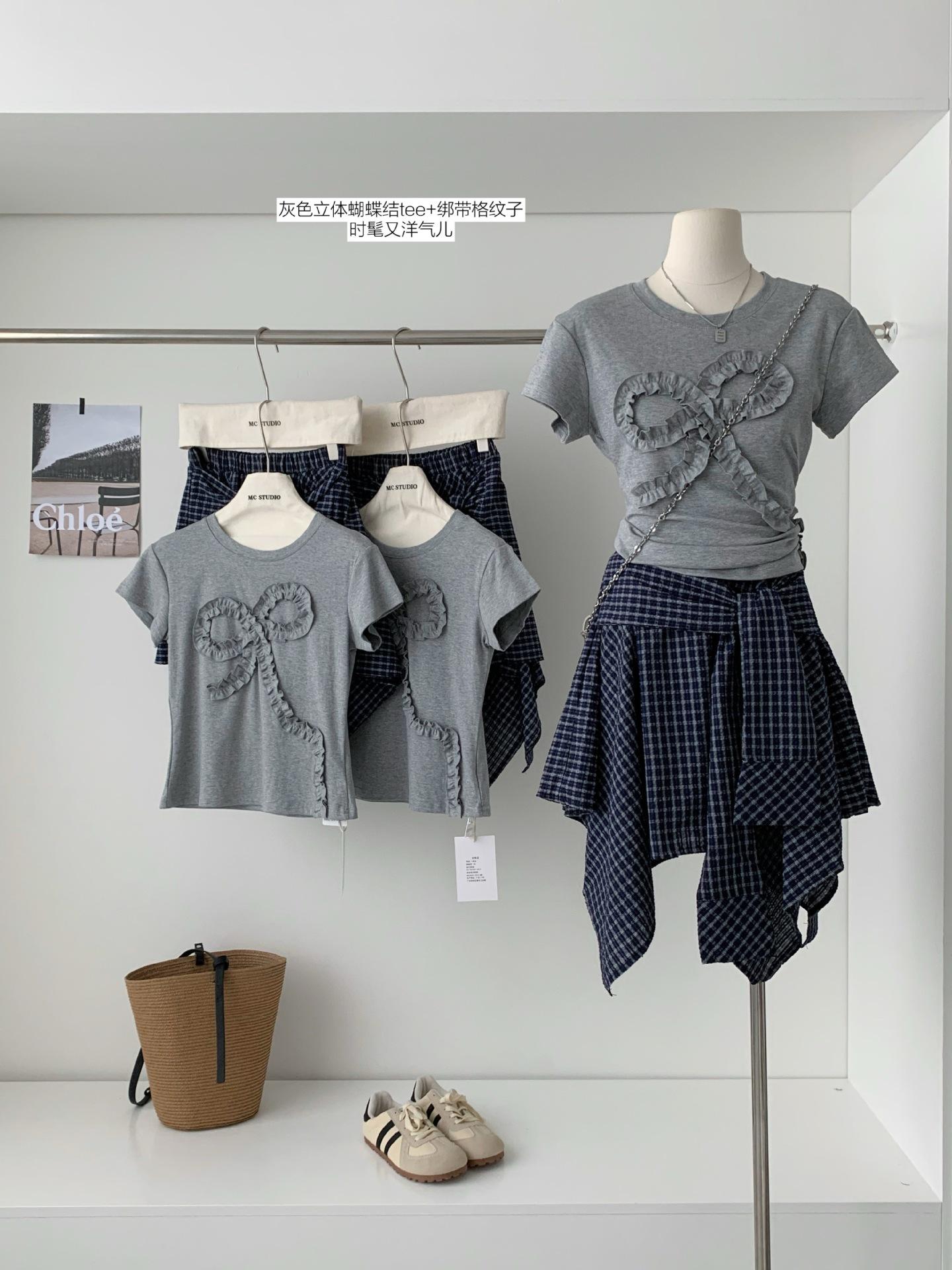 Traje Estilo Dulce Gris Manga Corta Cuello Redondo Camiseta Lazo Falda con Tirantes Irregulares de Verano para Mujer Set de Dos Piezas