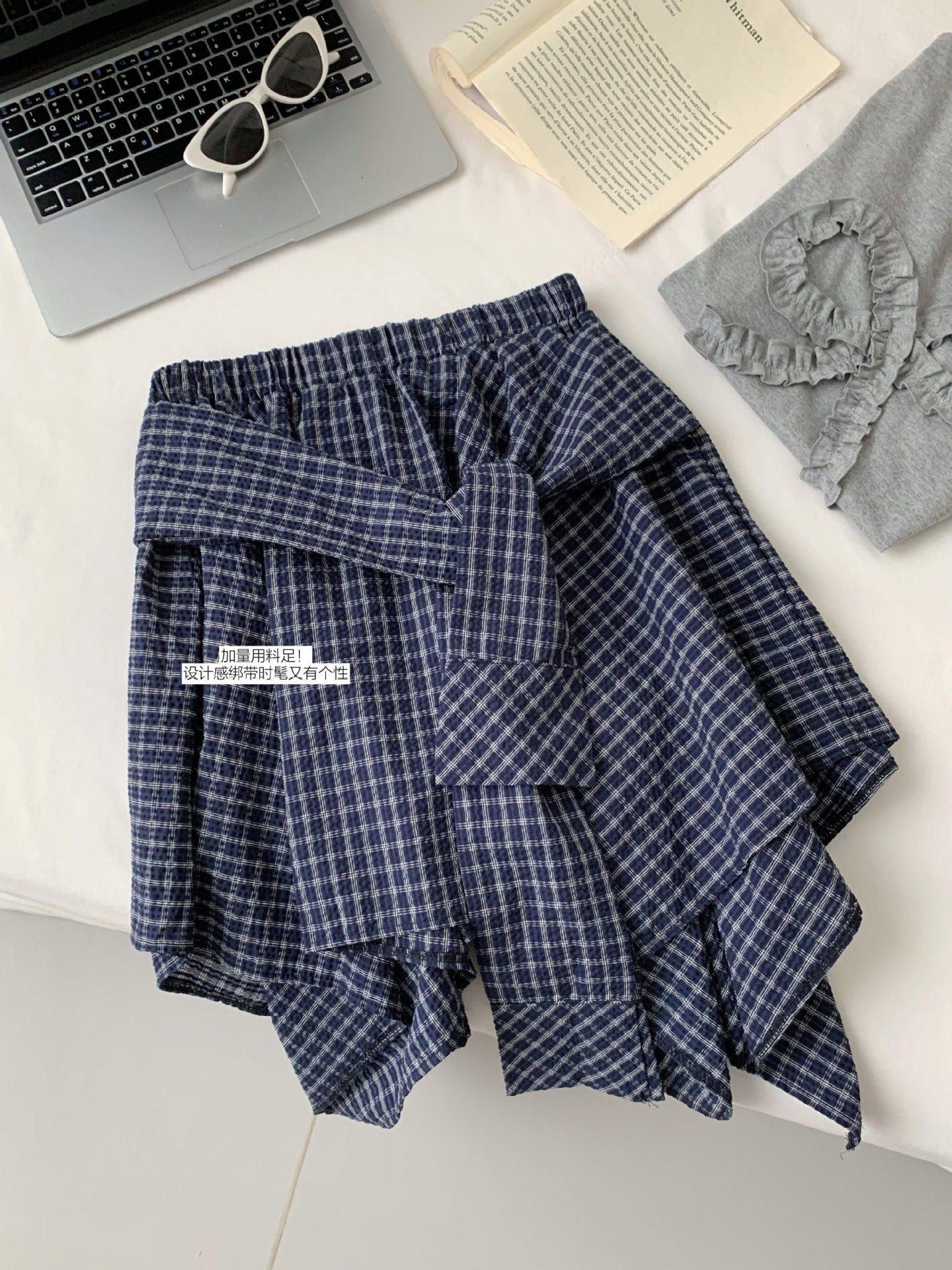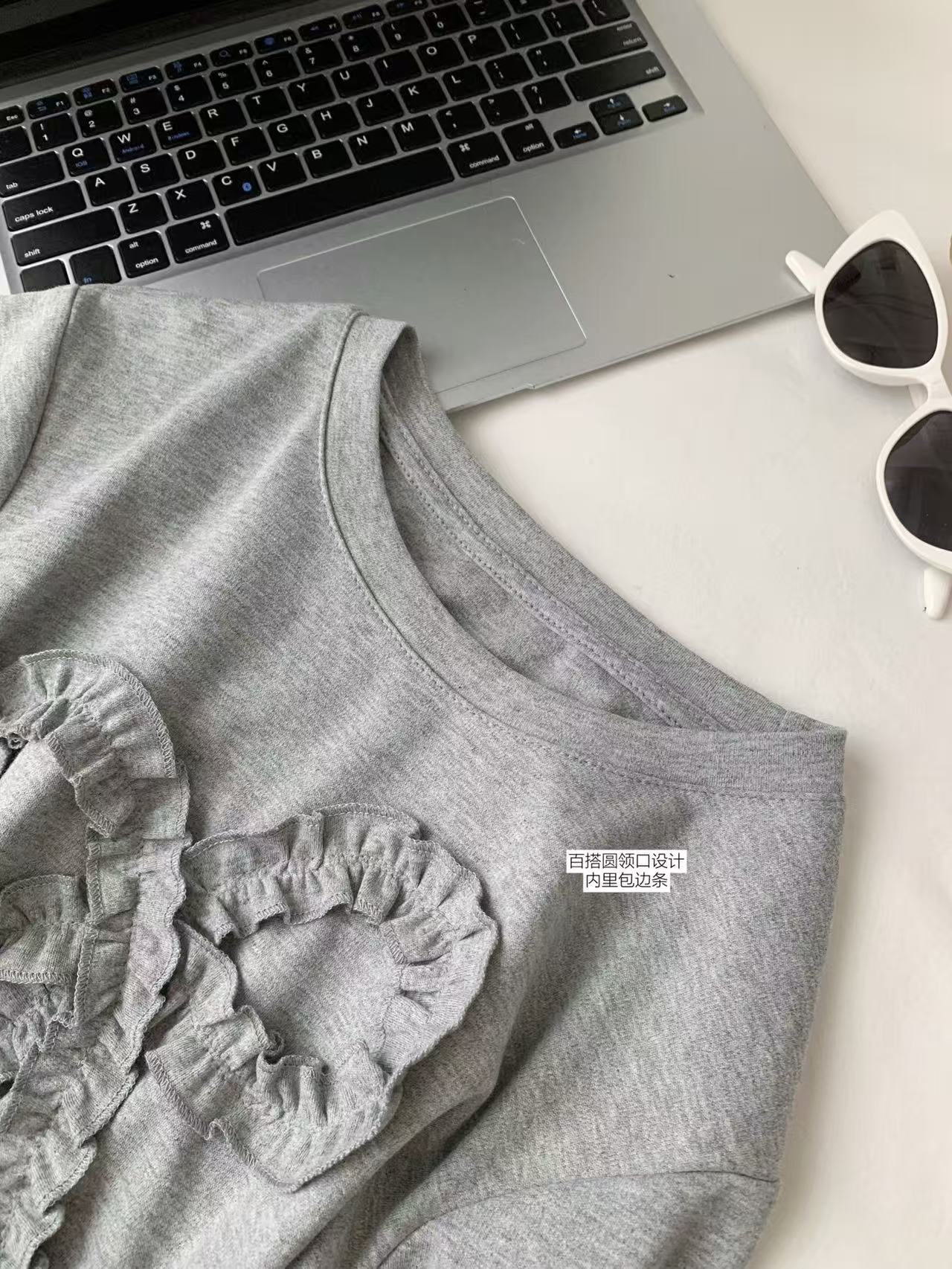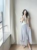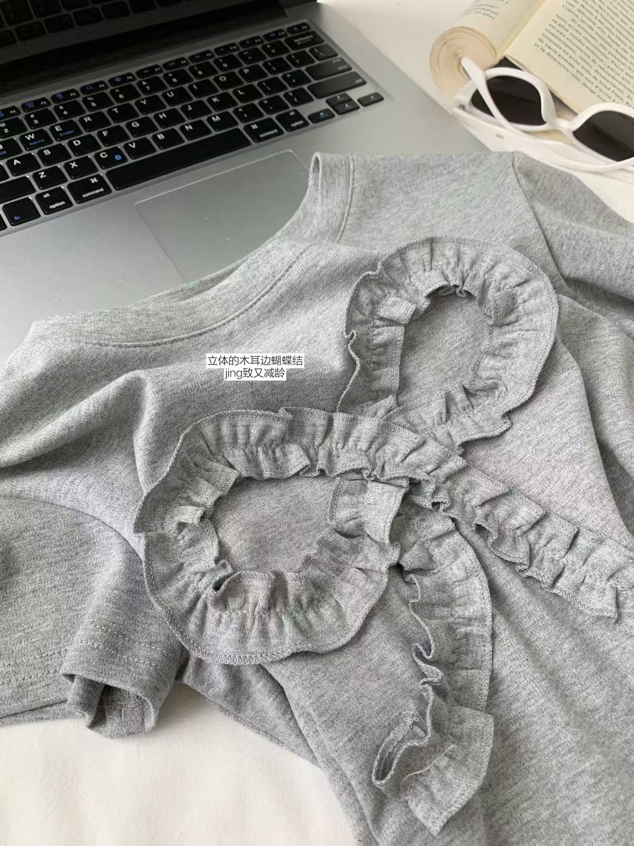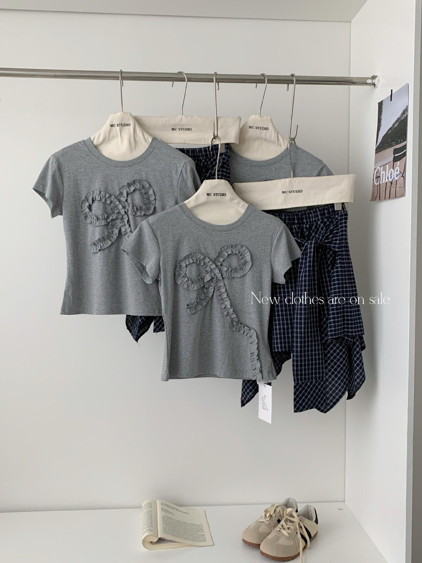 Traje Estilo Dulce Gris Manga Corta Cuello Redondo Camiseta Lazo Falda con Tirantes Irregulares de Verano para Mujer Set de Dos Piezas