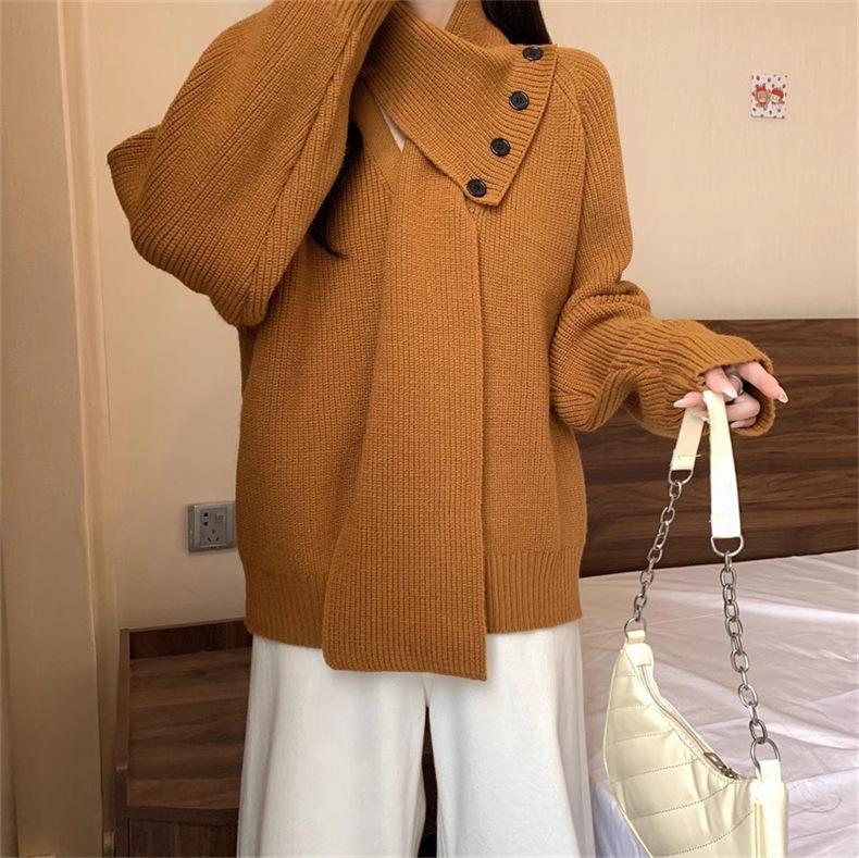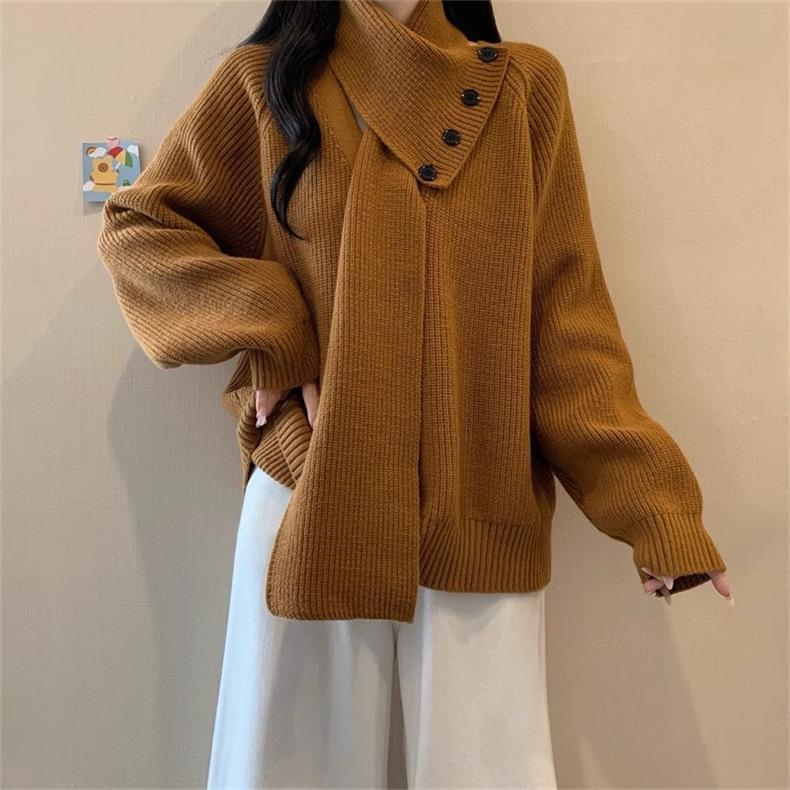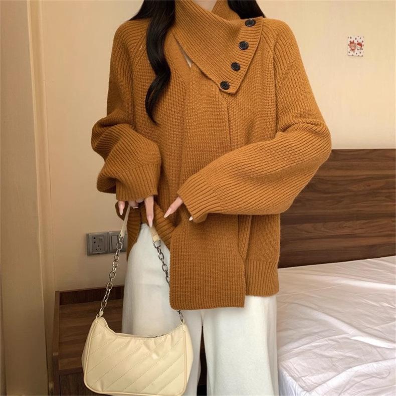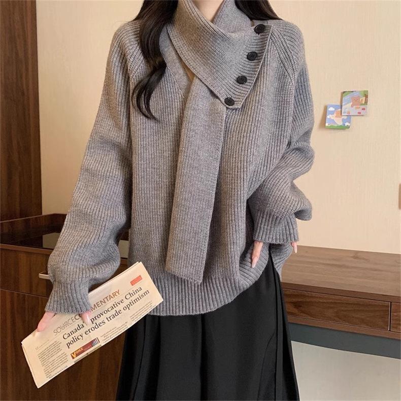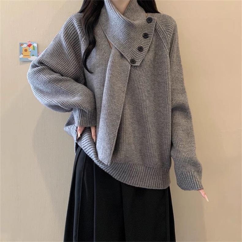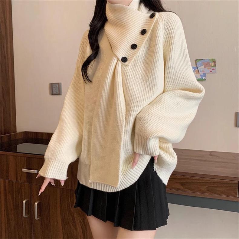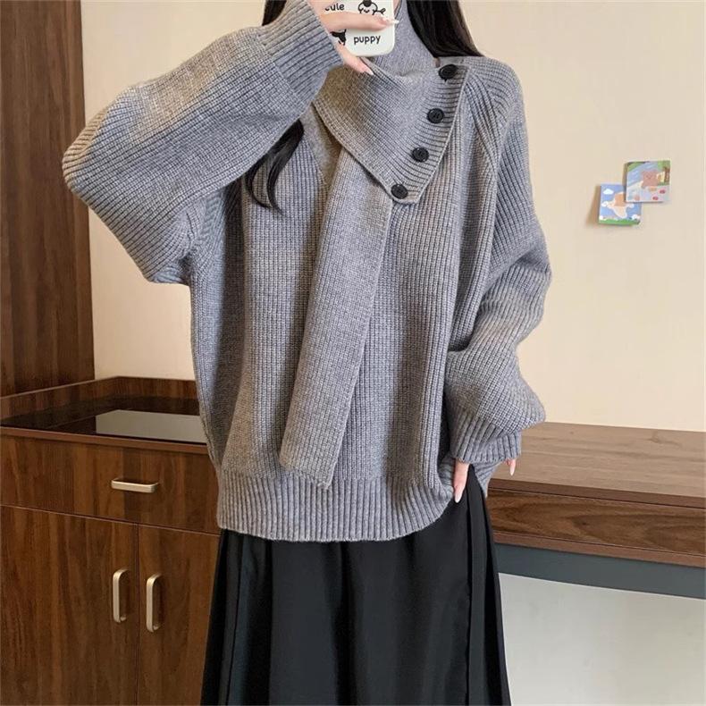 Estilo Coreano Estilo Perezoso Tejido de Punto Look Adelgazante Holgado Cuello Bufanda Tejido de Punto para Mujer Otoño e Invierno 2025 Nuevo Top Básico Engrosado