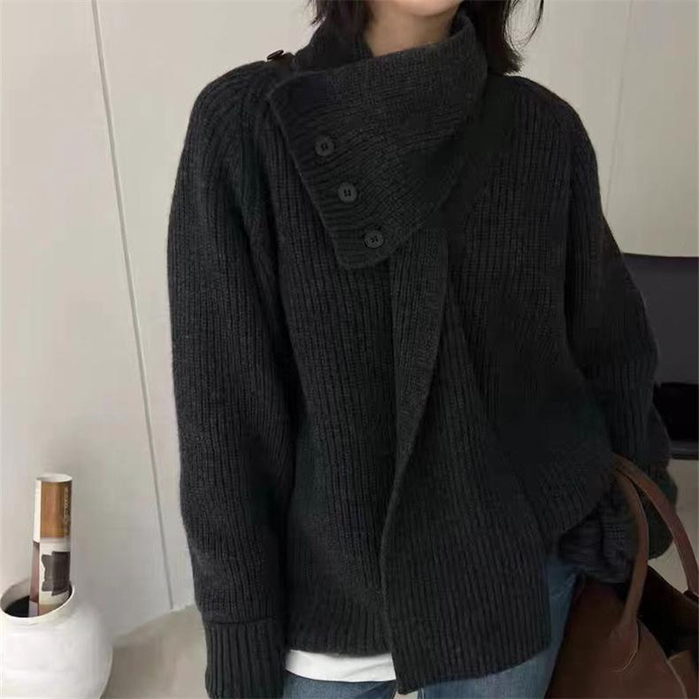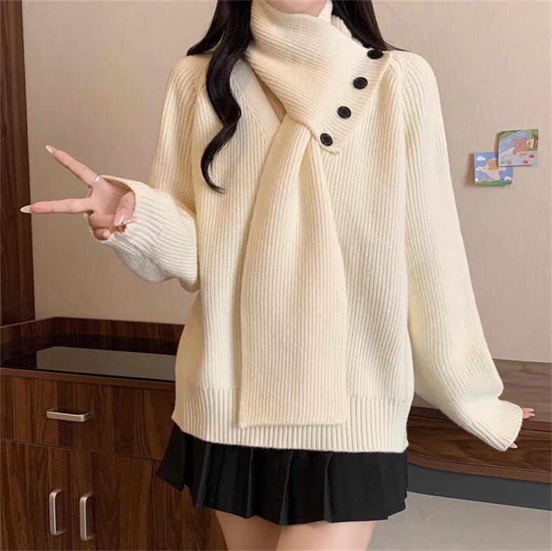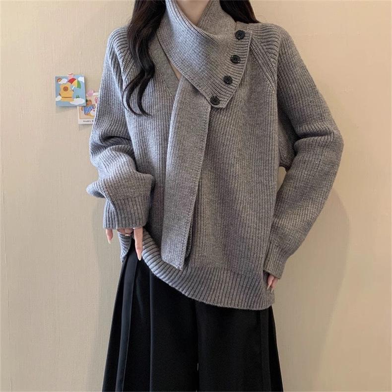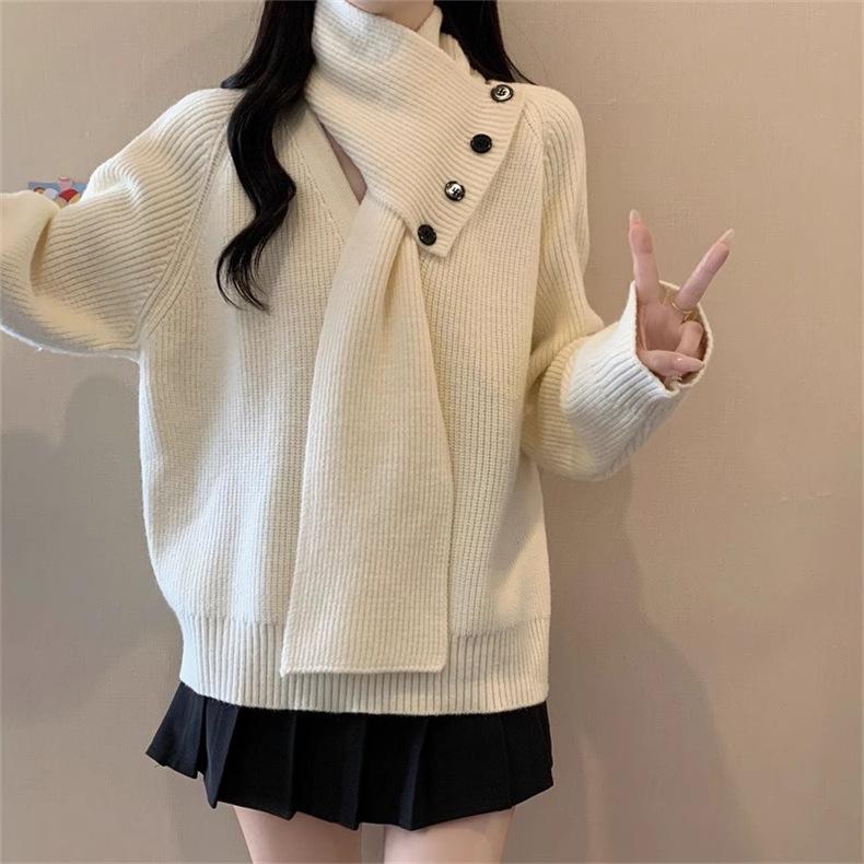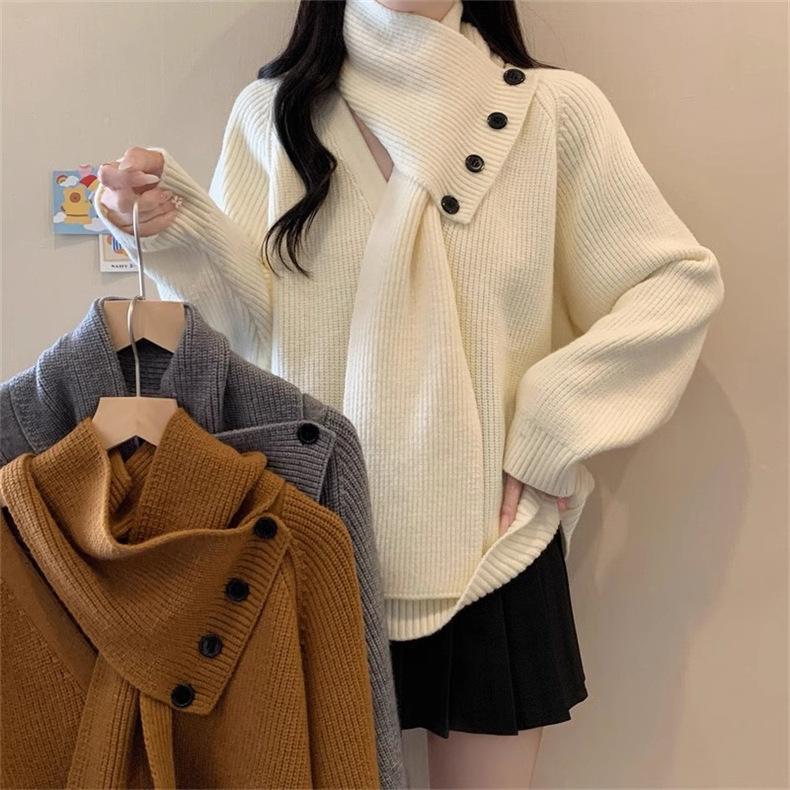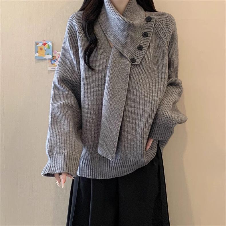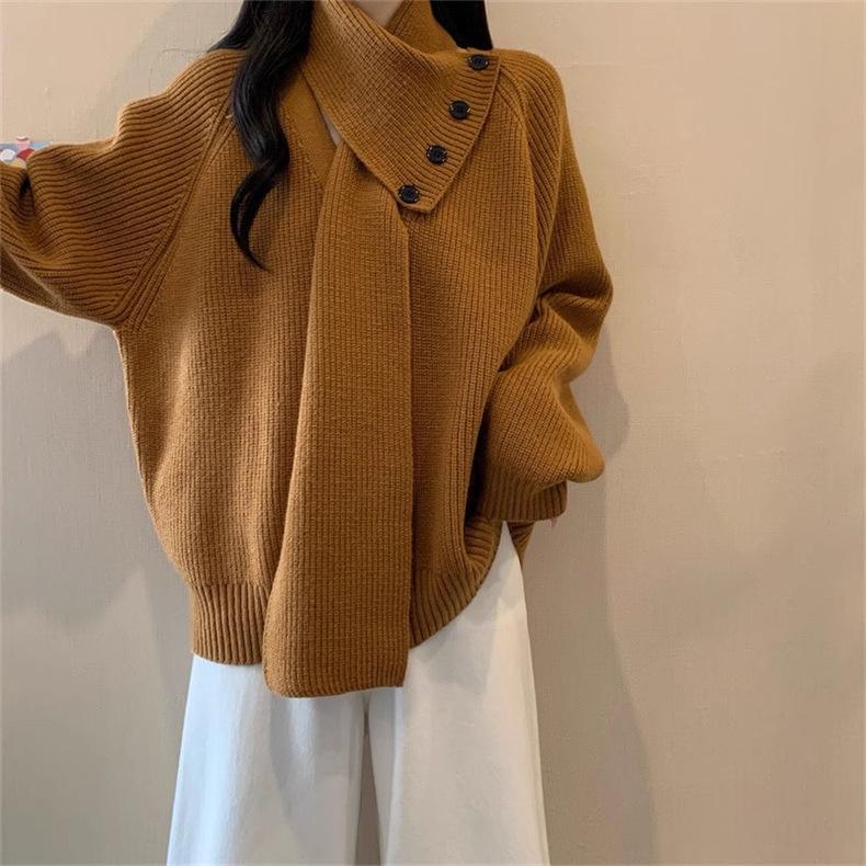 Estilo Coreano Estilo Perezoso Tejido de Punto Look Adelgazante Holgado Cuello Bufanda Tejido de Punto para Mujer Otoño e Invierno 2025 Nuevo Top Básico Engrosado