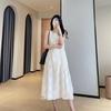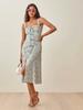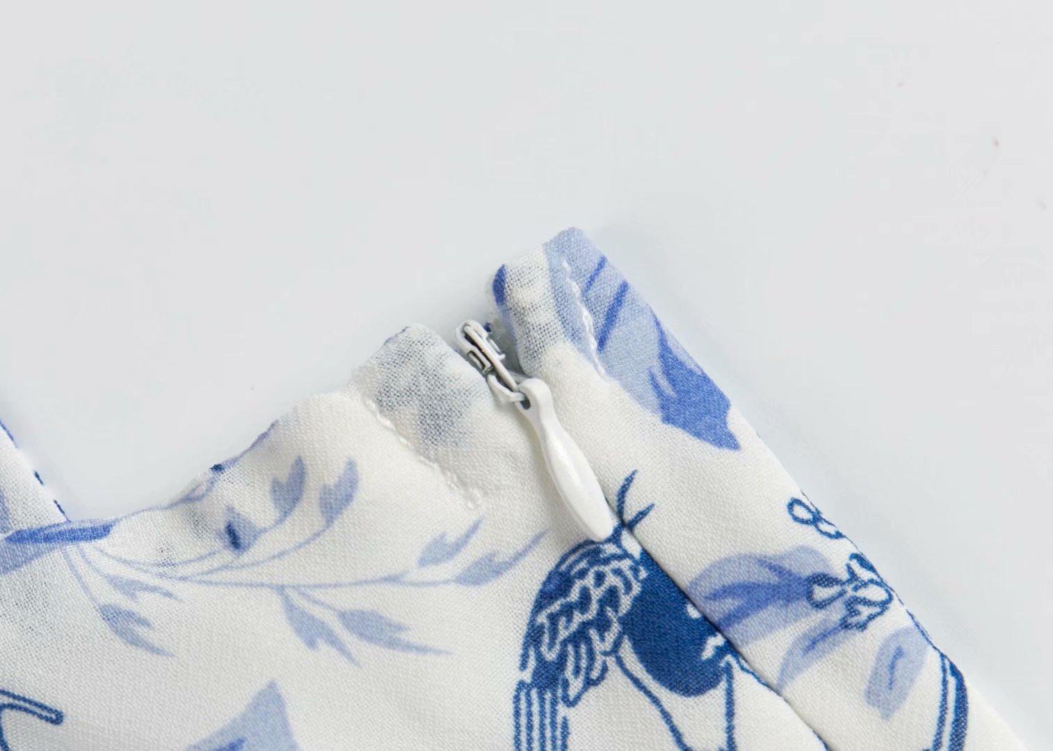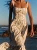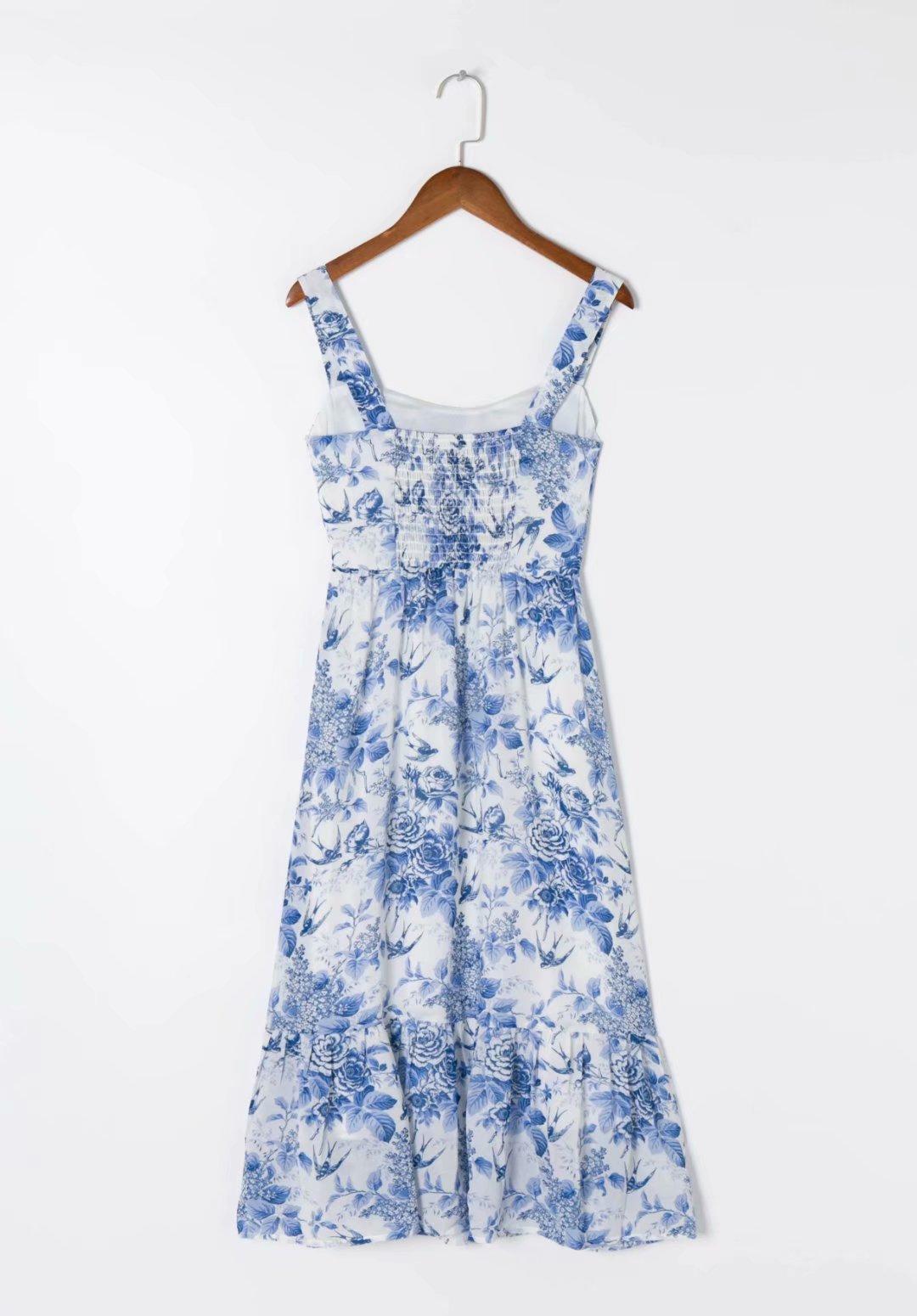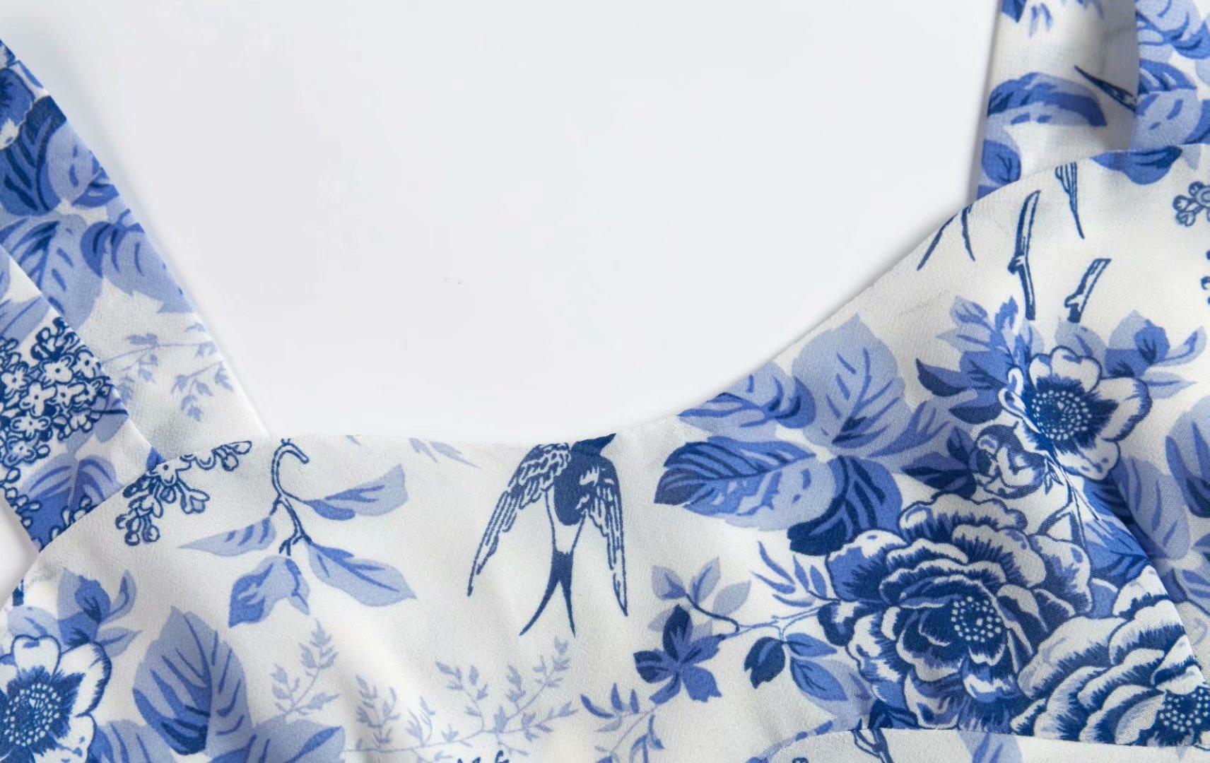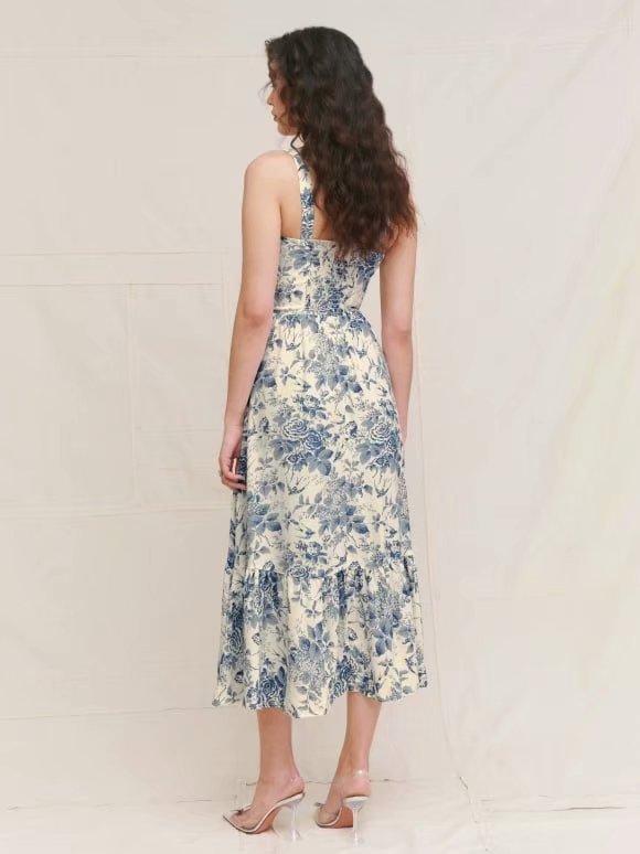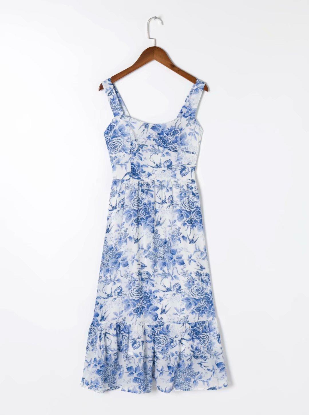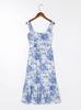 Vestido Midi Azul Elegante Europeo y Americano para Viaje Estampado de Tirantes Cintura Alta con Volantes Estilo Princesa Vestido Elegante
