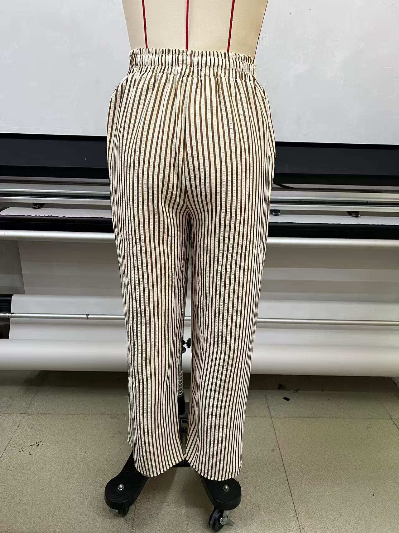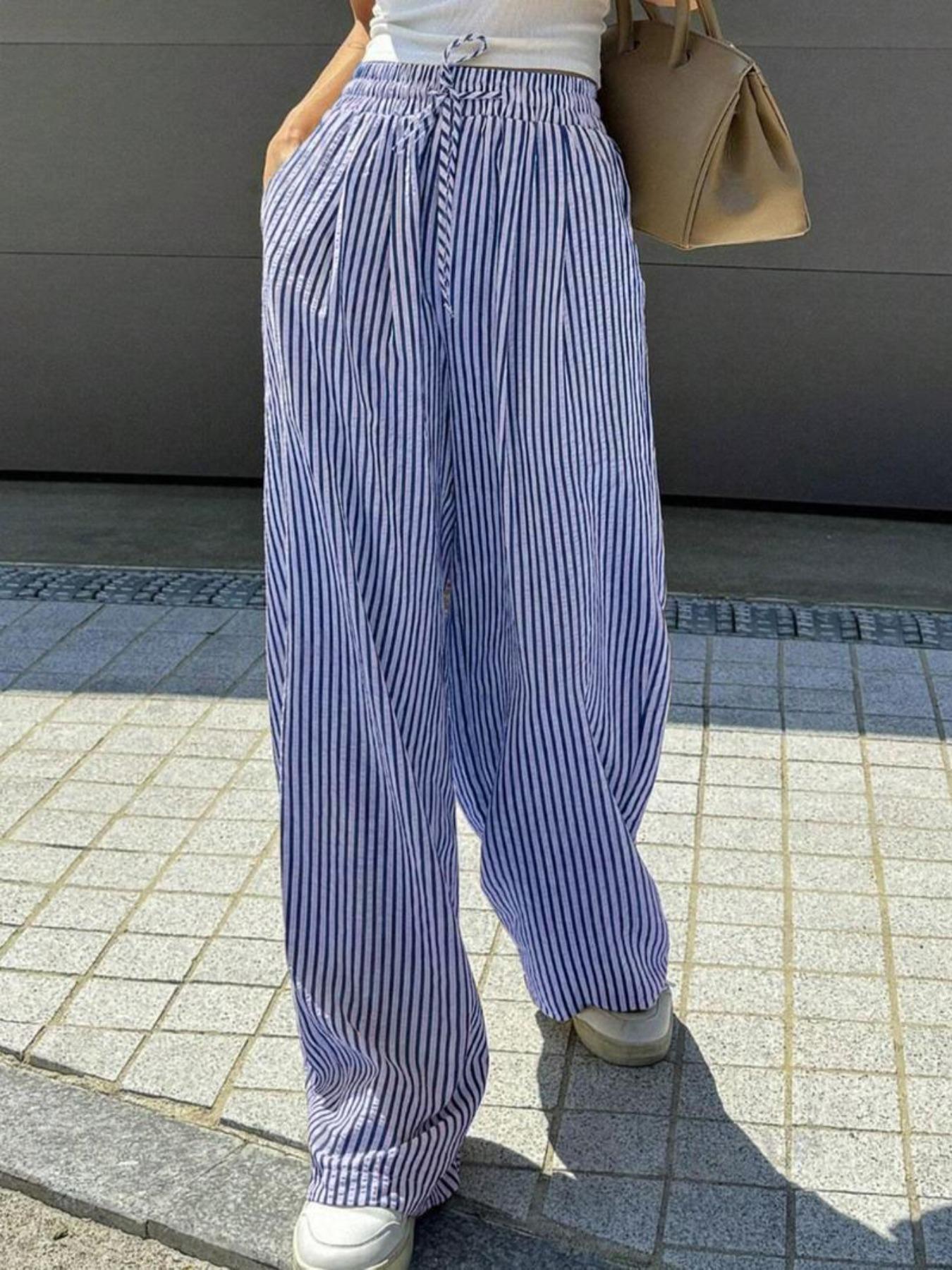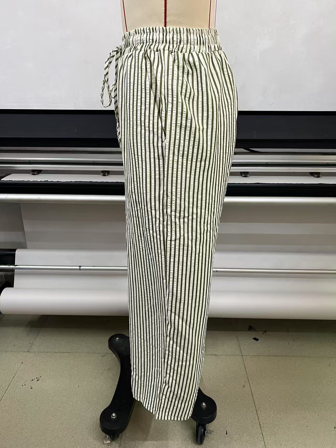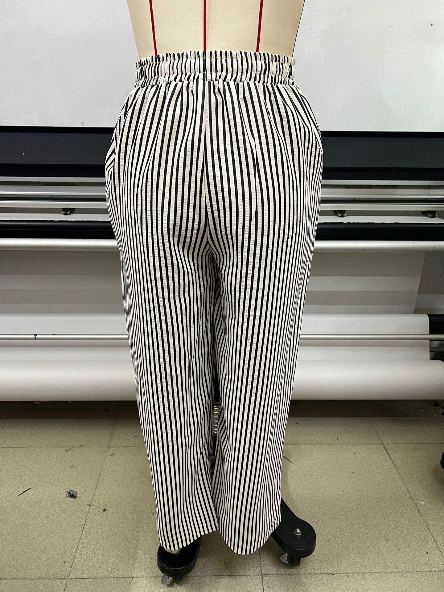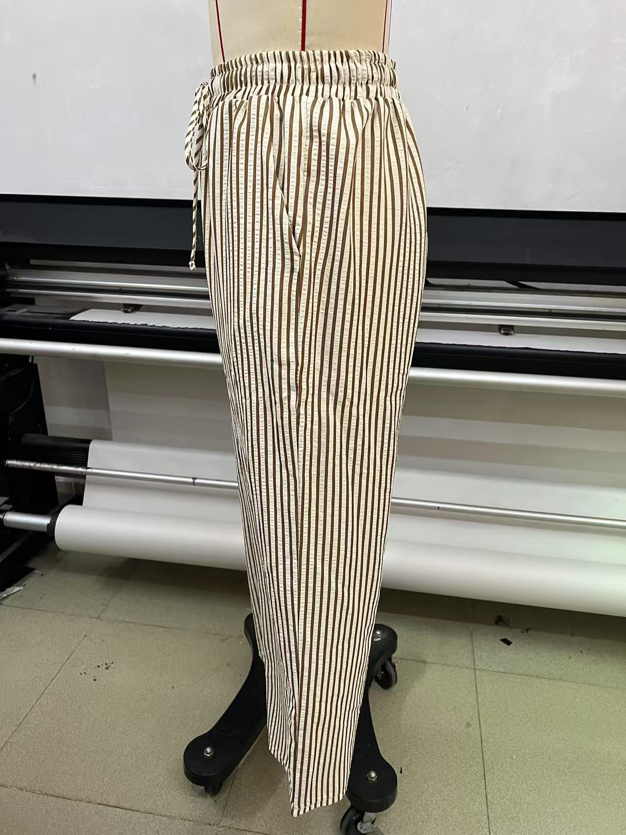 2025 Europeo y Americano Transfronterizo Amazon Nuevo Pantalón Rayado de Pierna Ancha Bolsillos con Cordón Casual Pantalón Largo Pantalón de Pierna Recta Ropa de Mujer