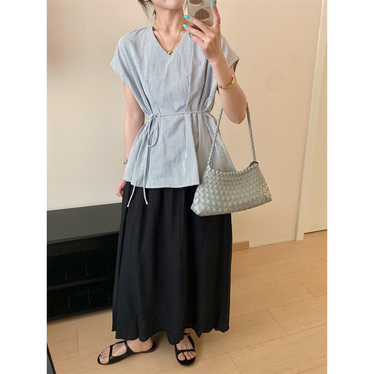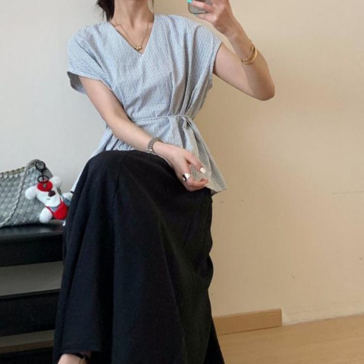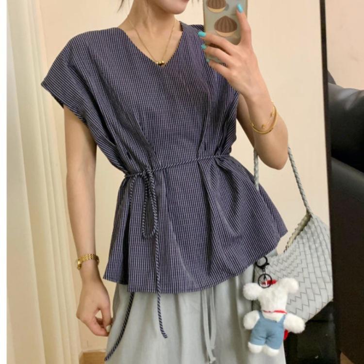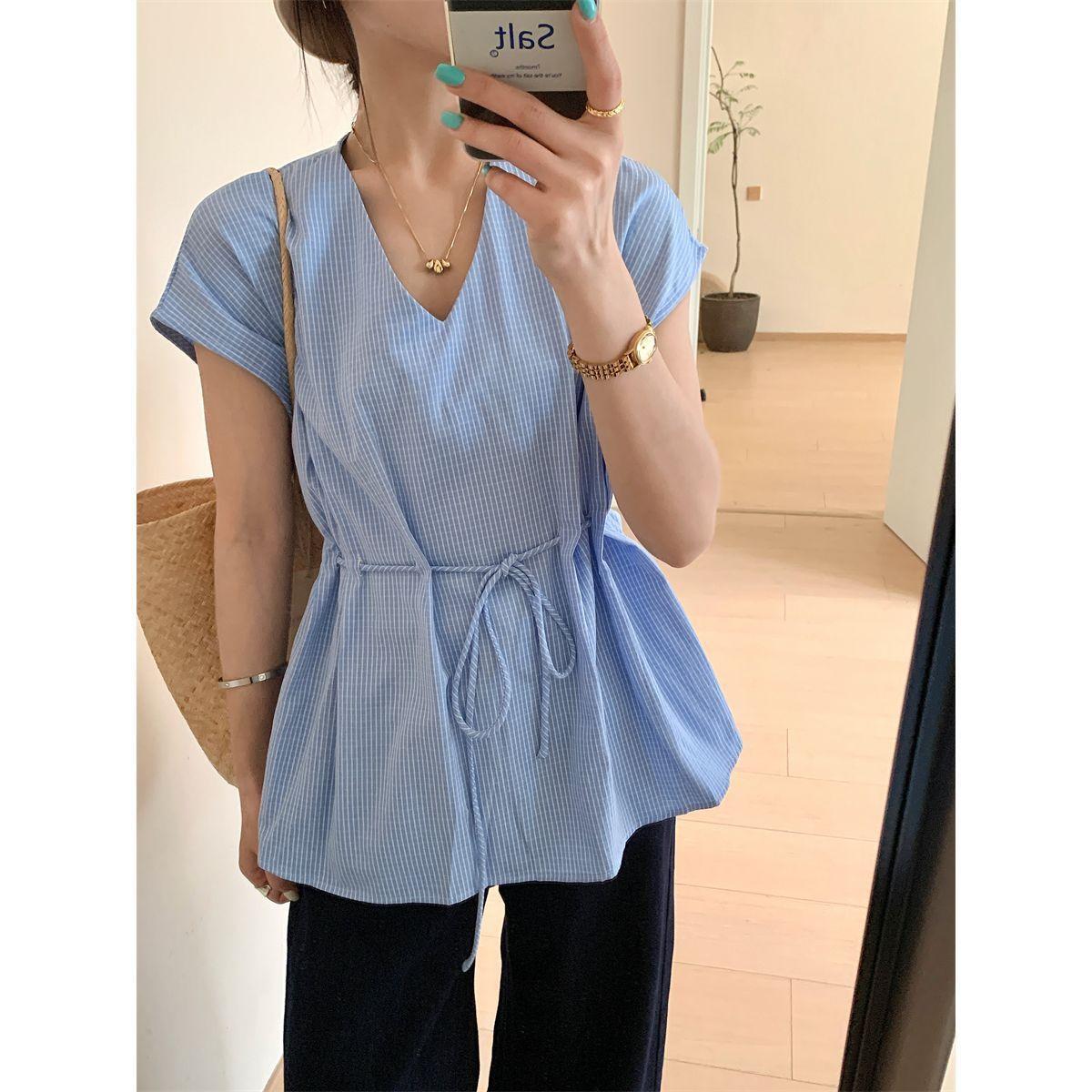 Camisa de Manga Corta con Cinturón a Rayas de Moda Estilo Coreano 2025 Verano Nuevo Diseño Cuello en V Top Sencillo Casual Versátil