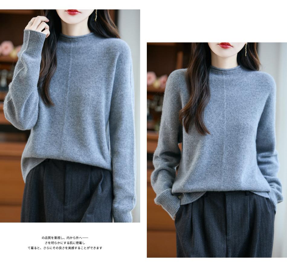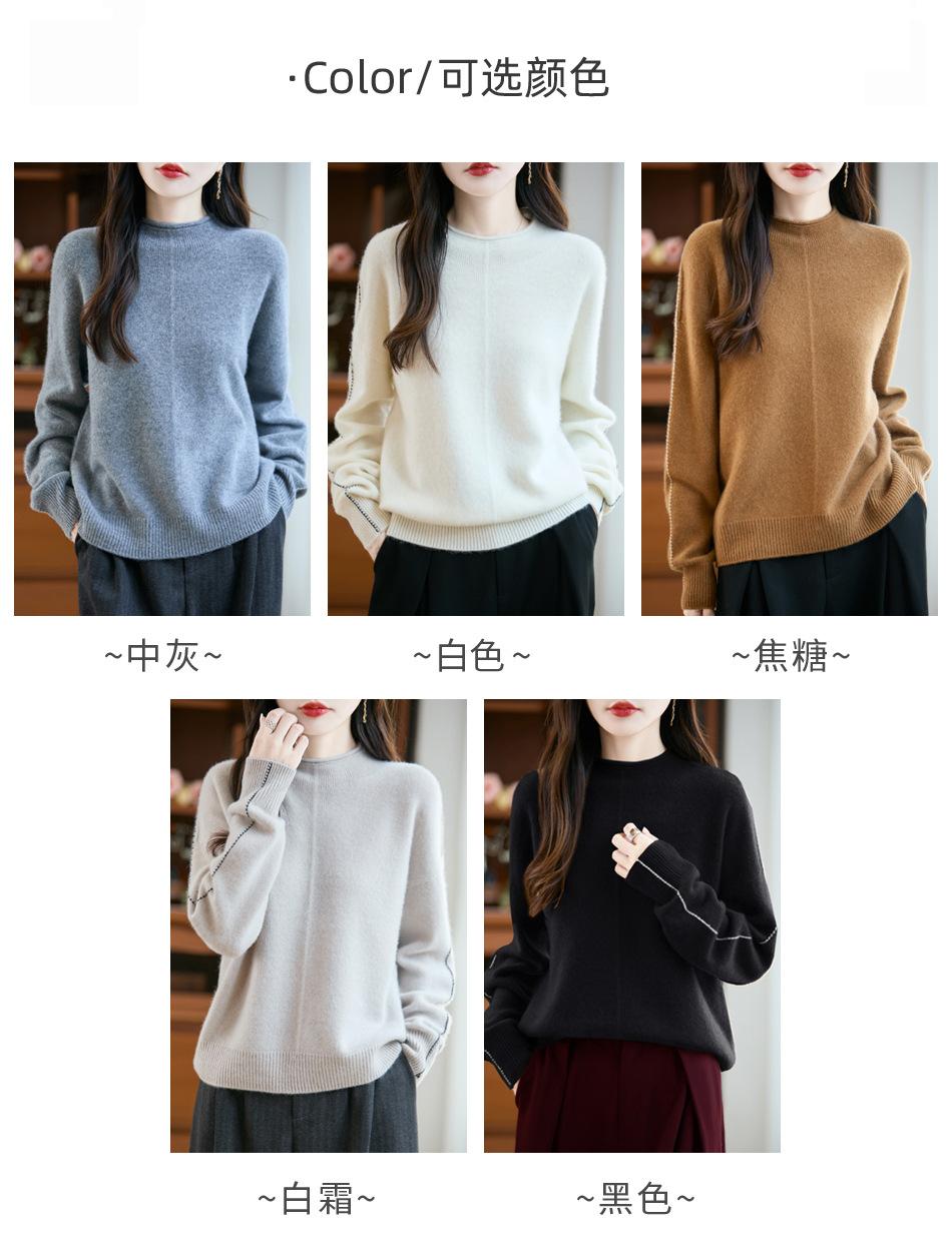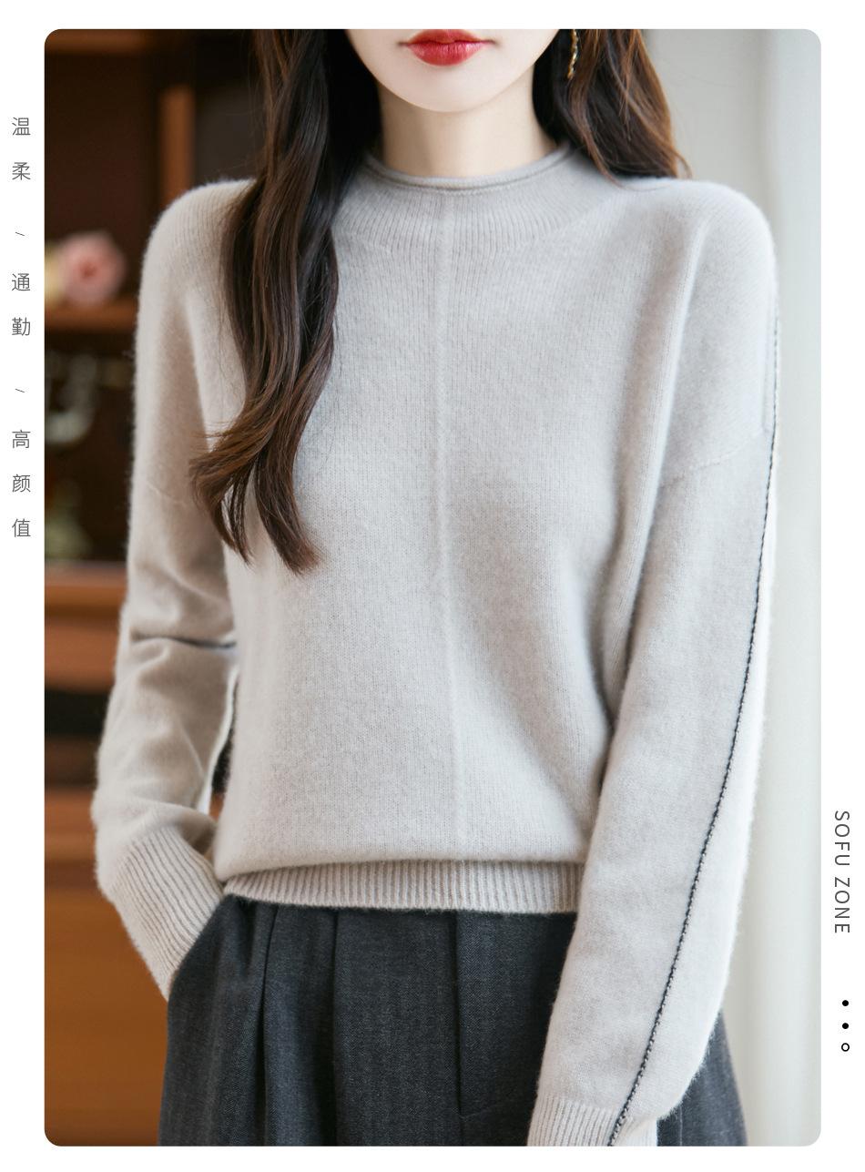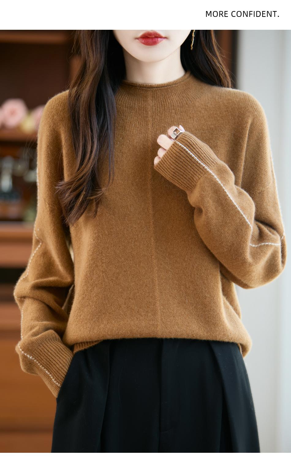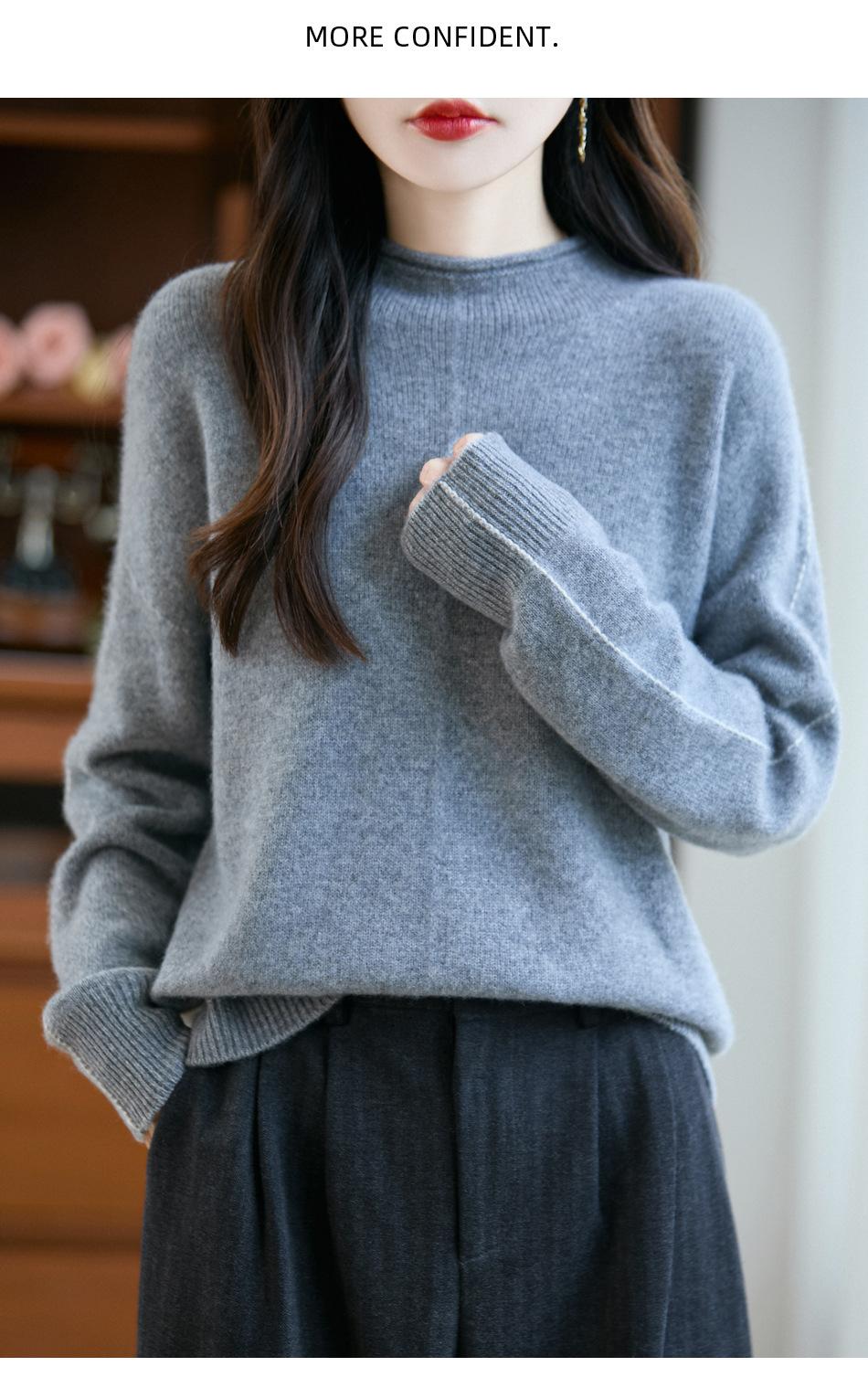 Suéter sin costuras de una pieza 100% lana pura para mujer, cuello semi alto con borde enrollado, jersey nuevo de punto de manga larga para otoño/invierno