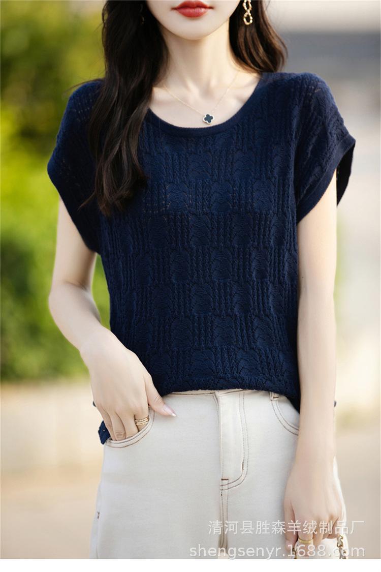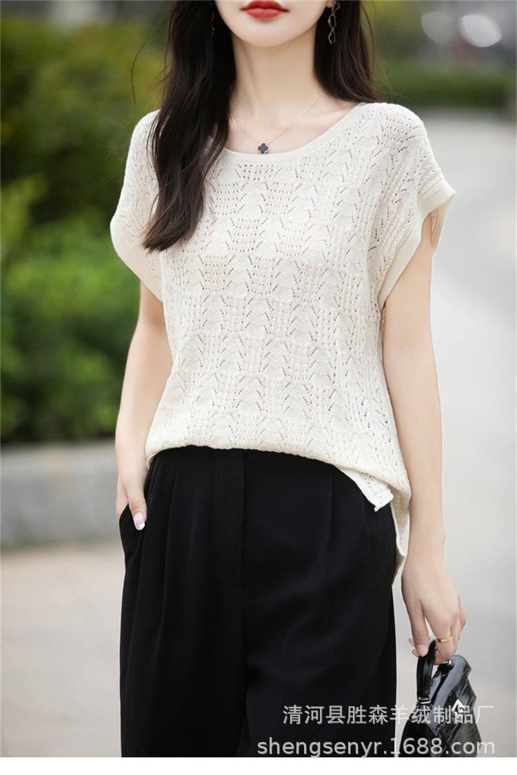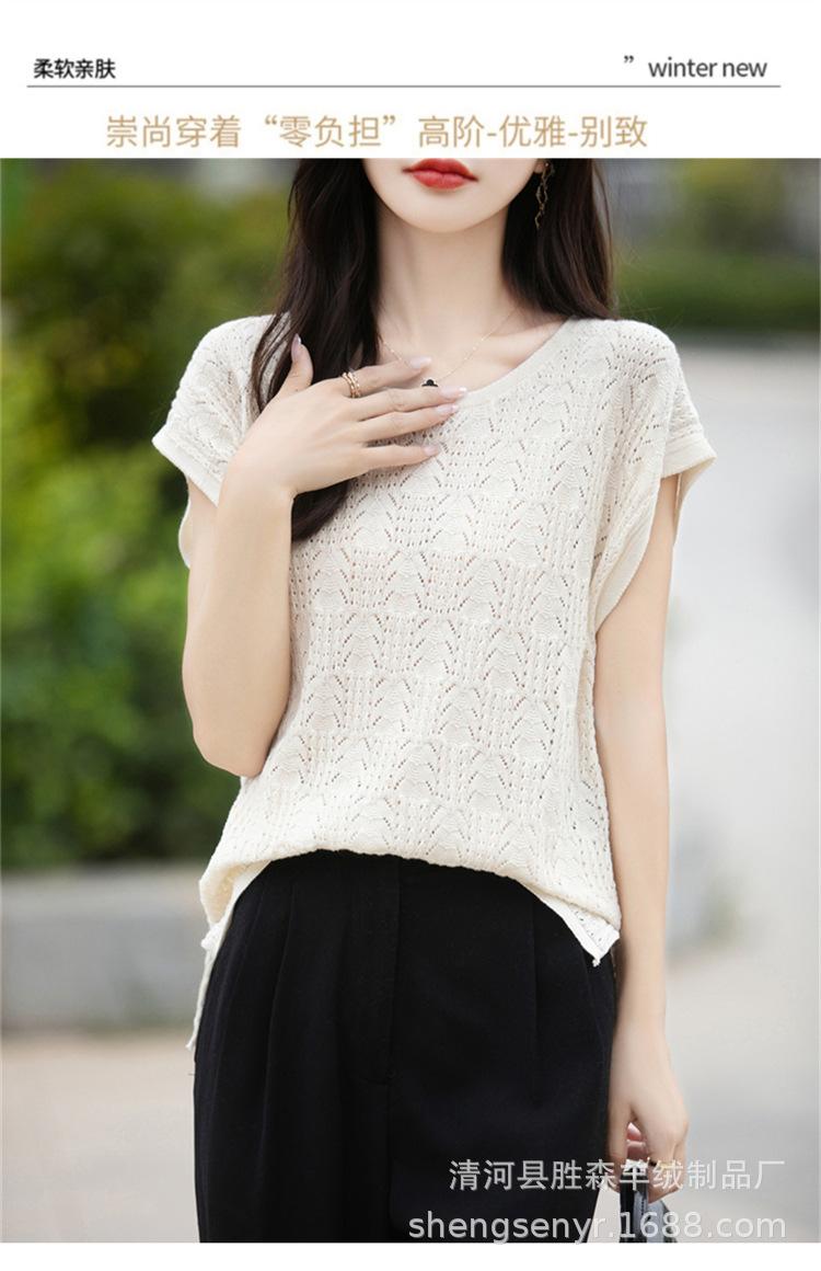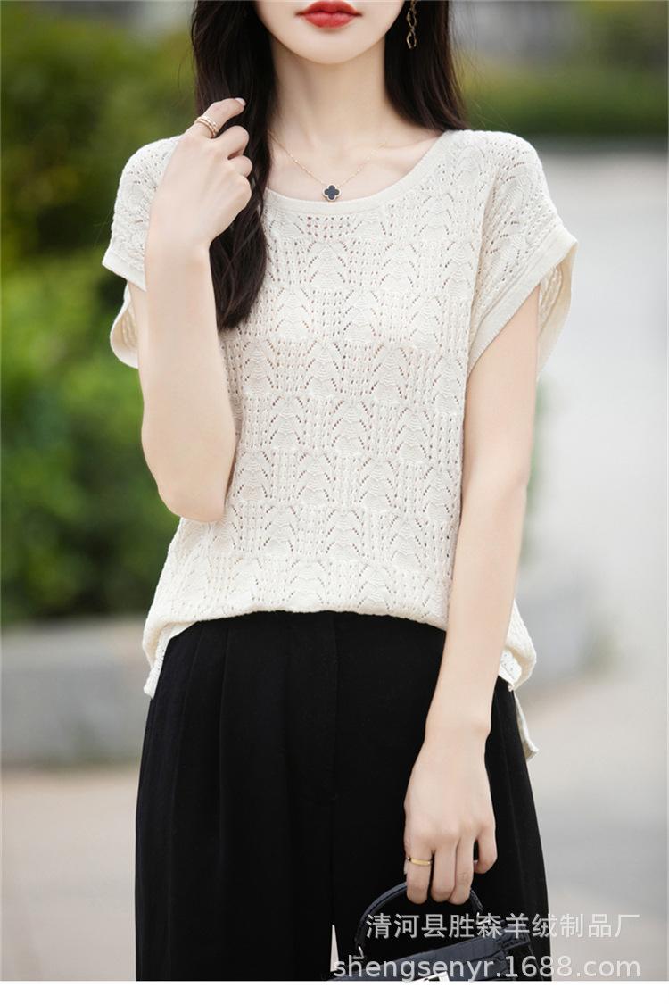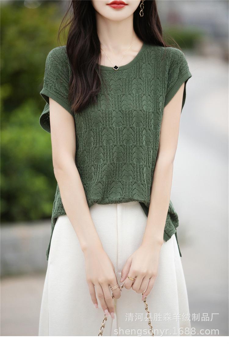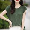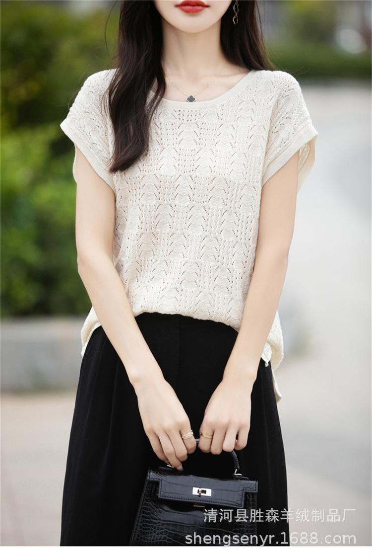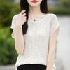 Camiseta de Algodón Puro de Manga Corta para Mujer Suéter Delgado Holgado de Punto 2024 Verano Nuevo Color Sólido Calado Estilo Extranjero Top
