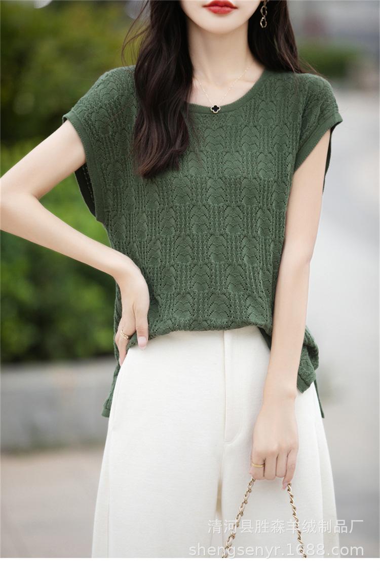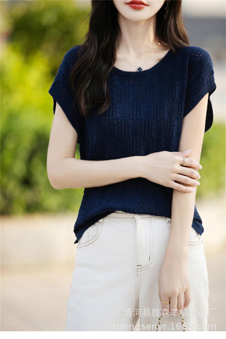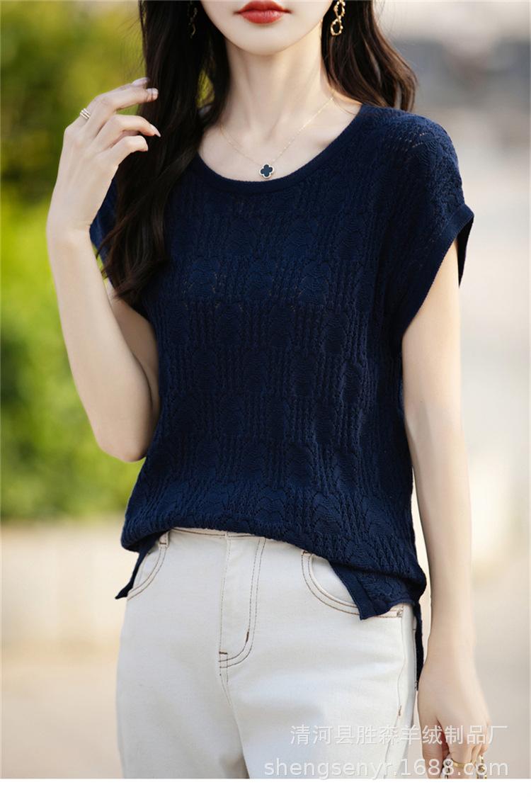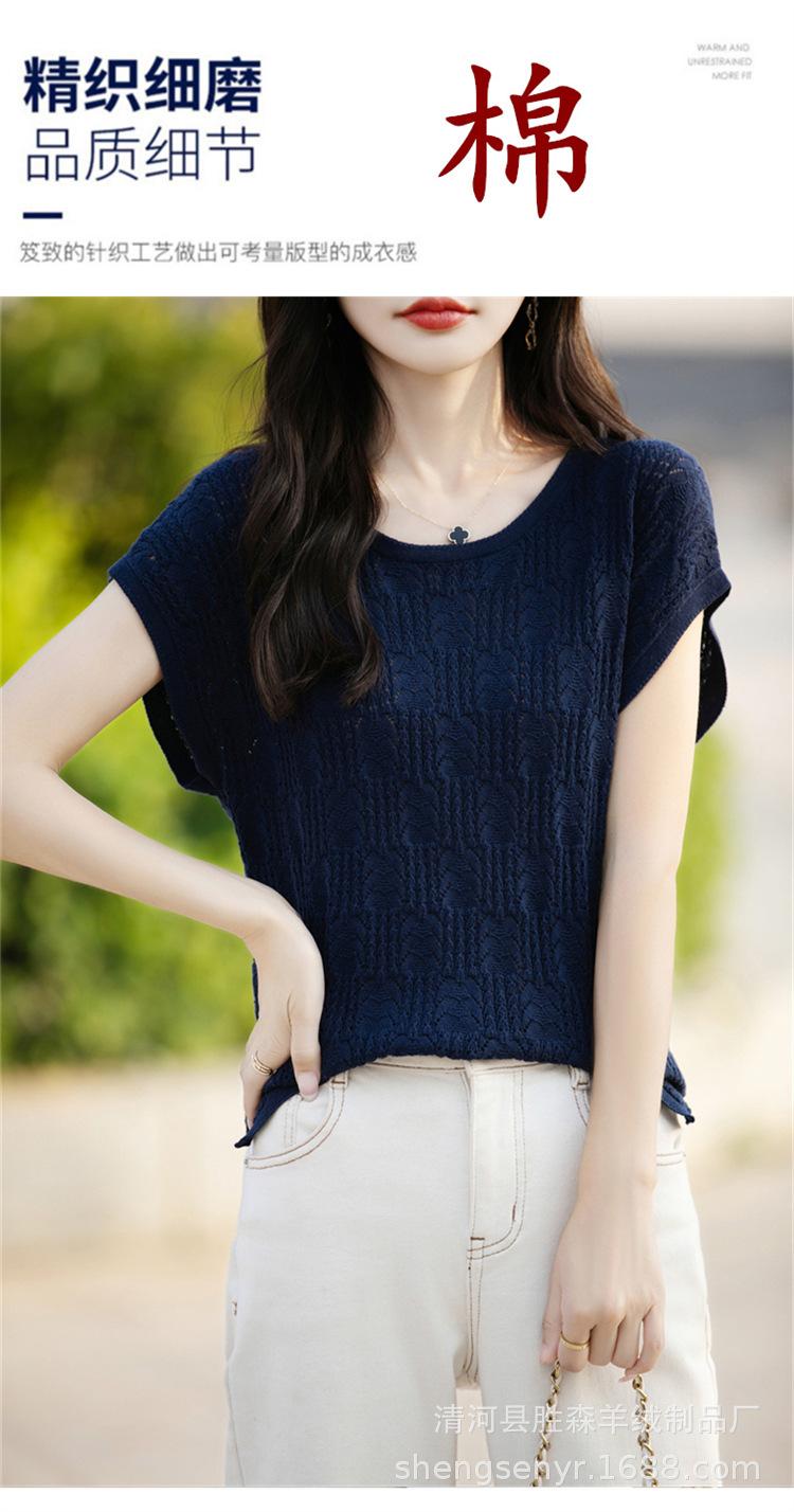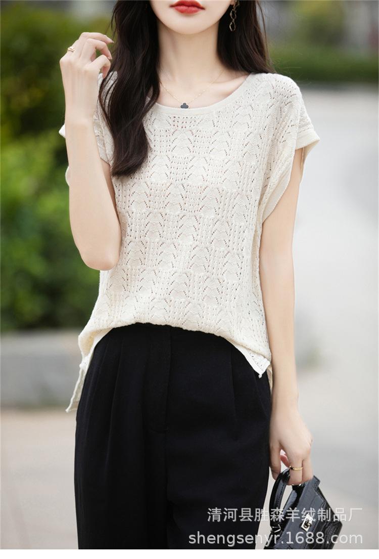 Camiseta de Algodón Puro de Manga Corta para Mujer Suéter Delgado Holgado de Punto 2024 Verano Nuevo Color Sólido Calado Estilo Extranjero Top