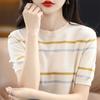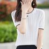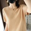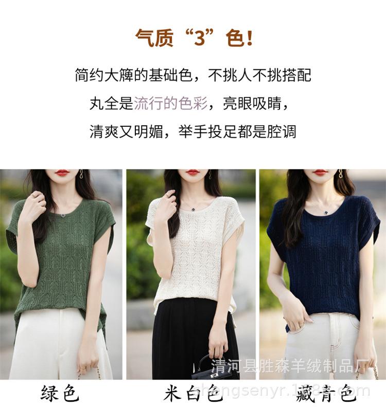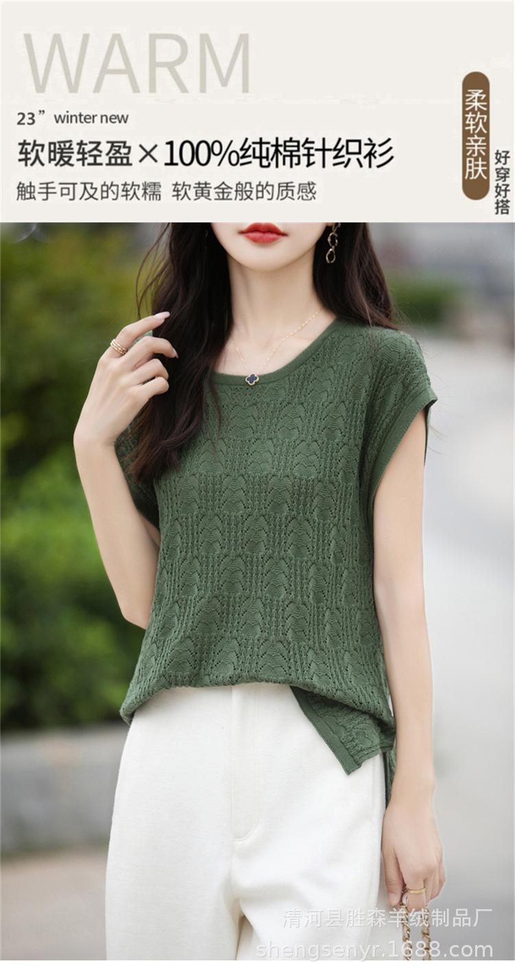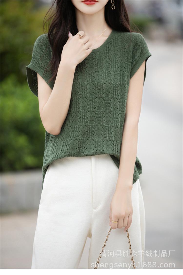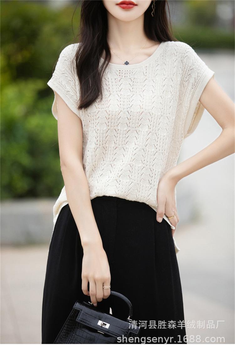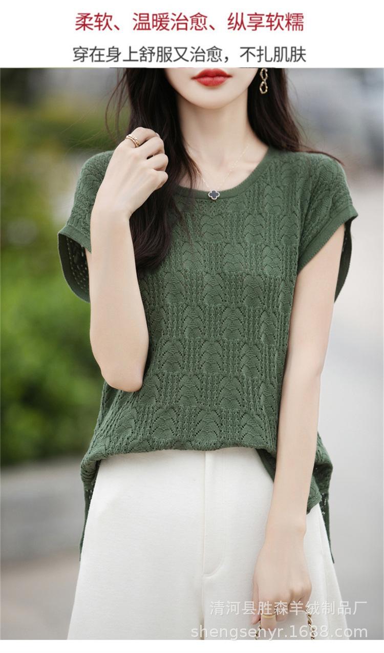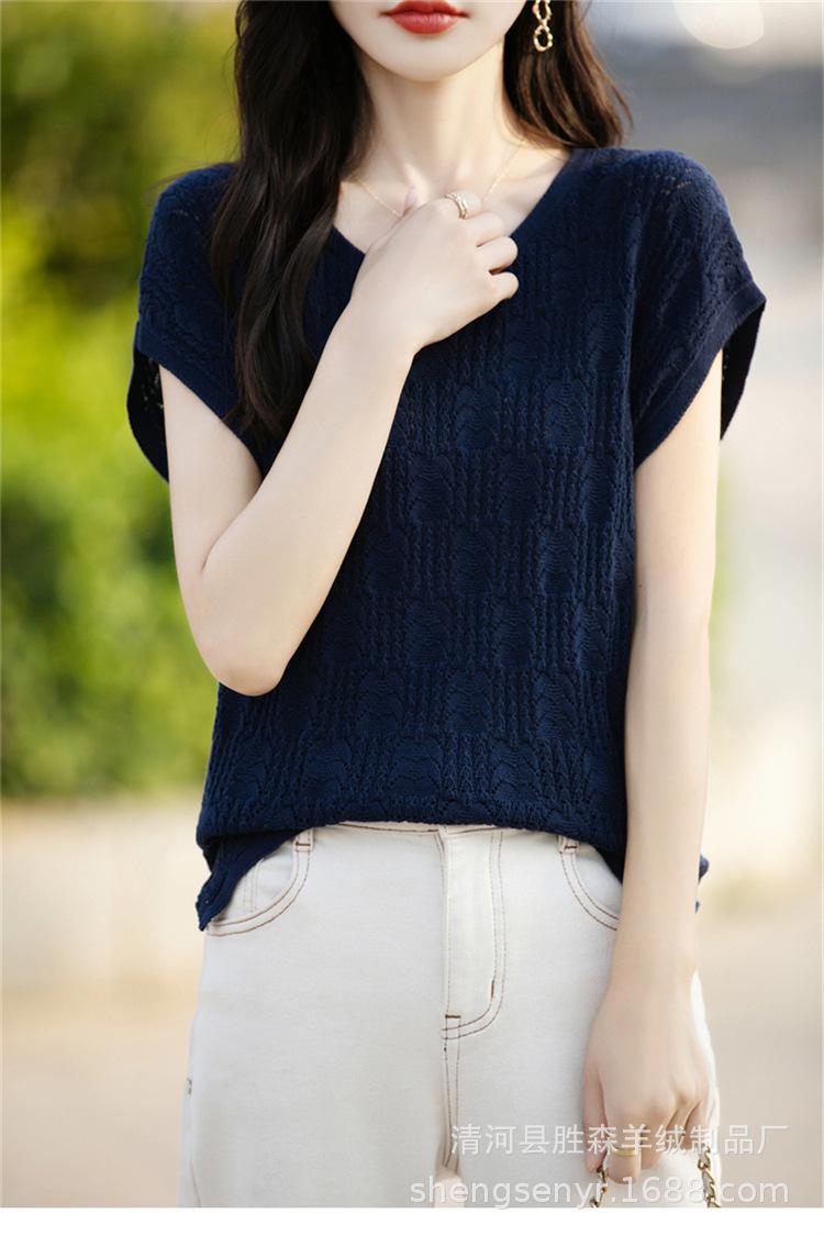 Camiseta de Algodón Puro de Manga Corta para Mujer Suéter Delgado Holgado de Punto 2024 Verano Nuevo Color Sólido Calado Estilo Extranjero Top
