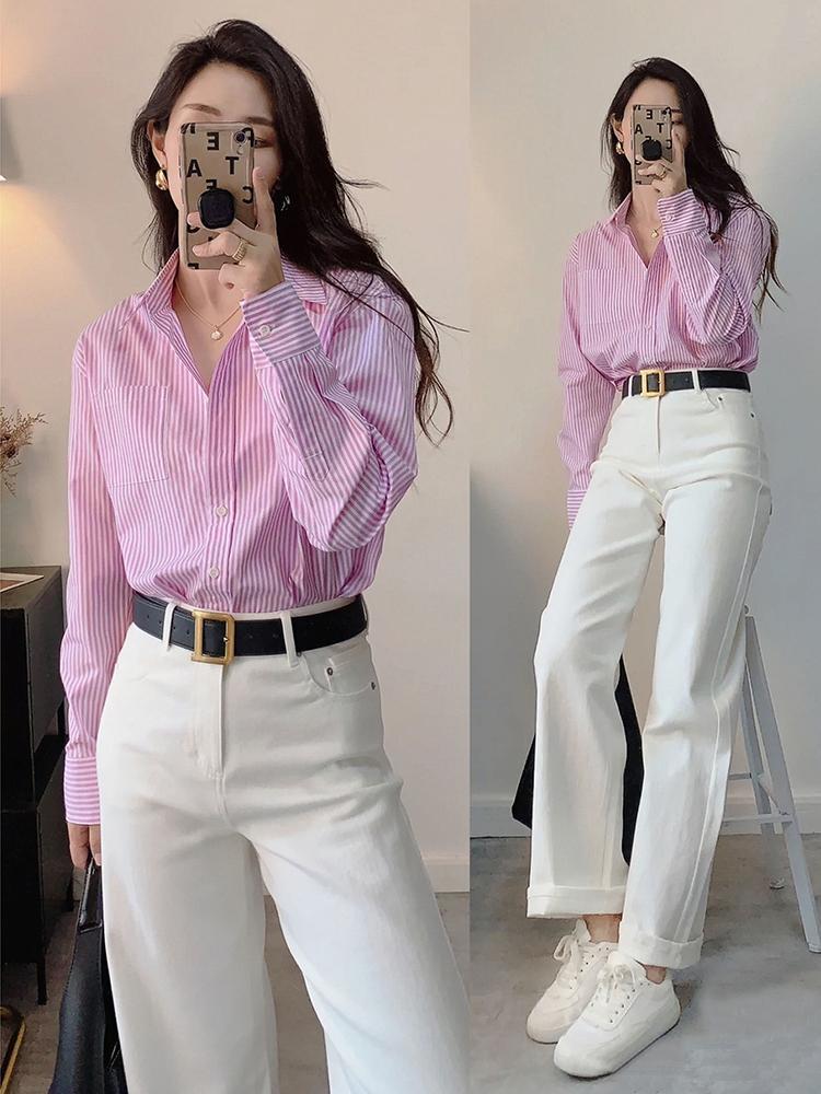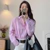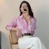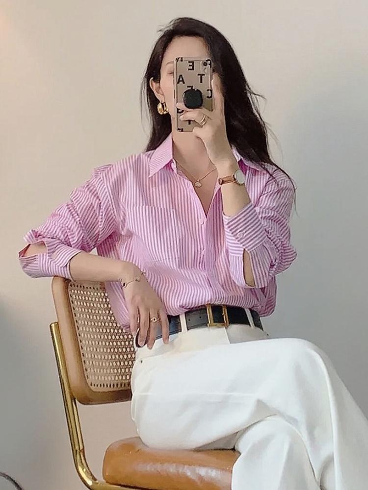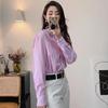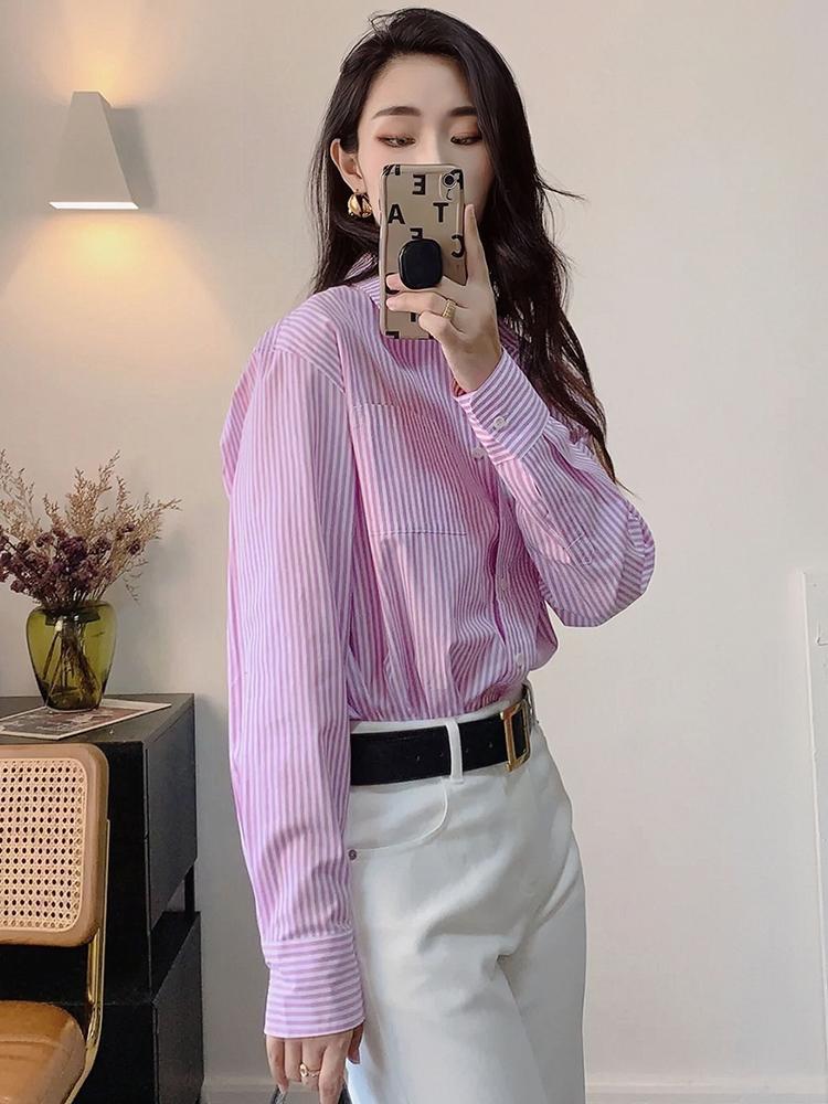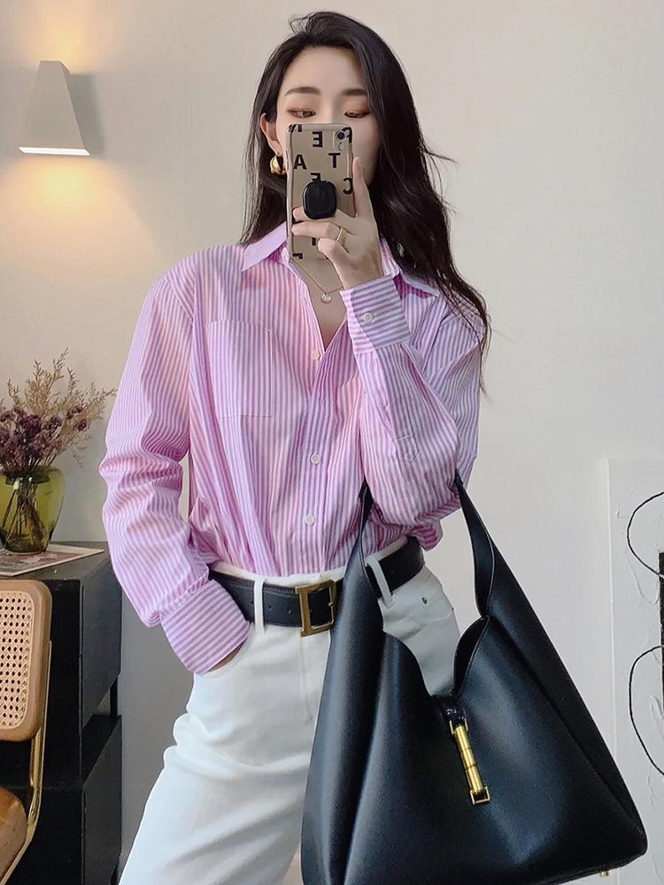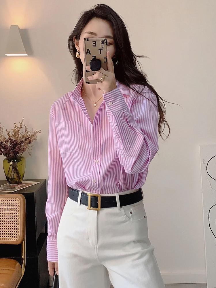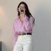 Camisa de Rayas Rosas Shanlidaidi Blusa Manga Larga 2025 Nuevo Otoño para Mujer Top Conjunto Ligeramente Maduro Francés