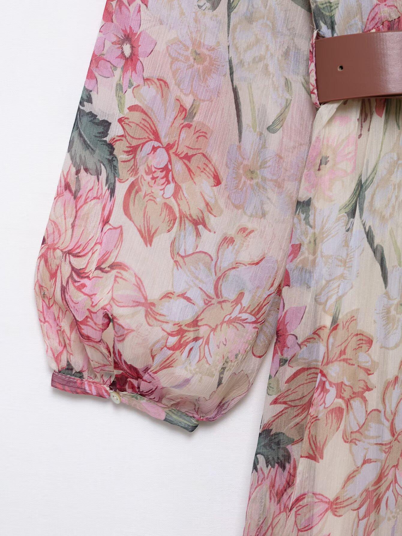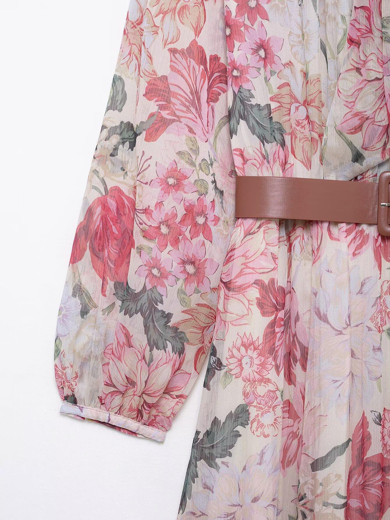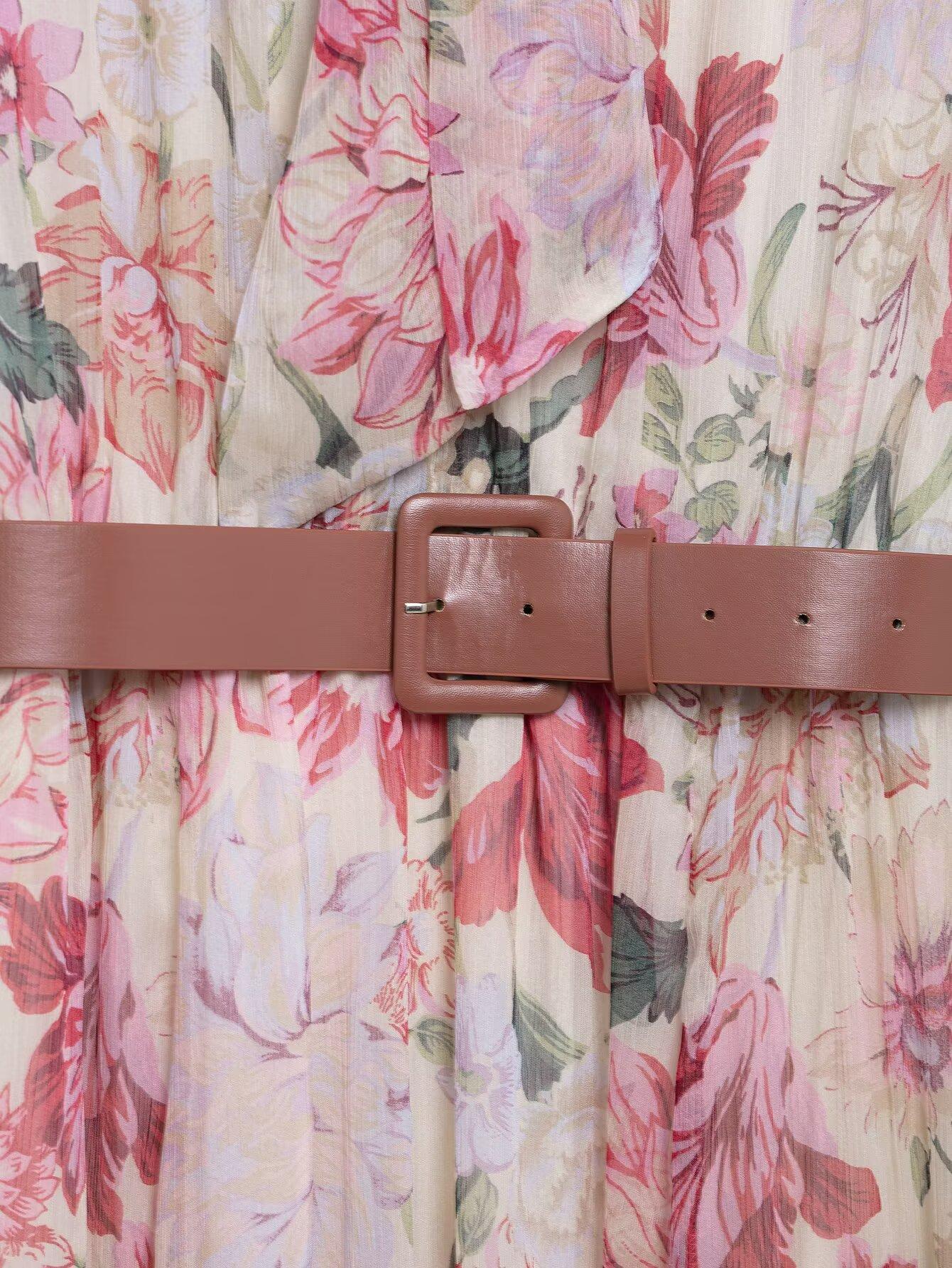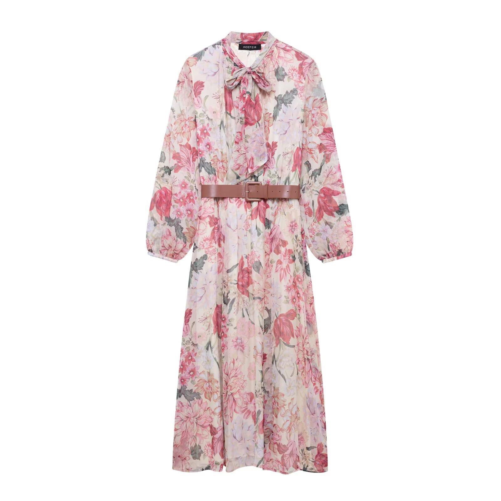 Amazon Mayoreo 2025 Primavera Nuevo Ropa de Mujer Transfronteriza Europea y Americana Cinturón Vestido Midi con Estampado Floral