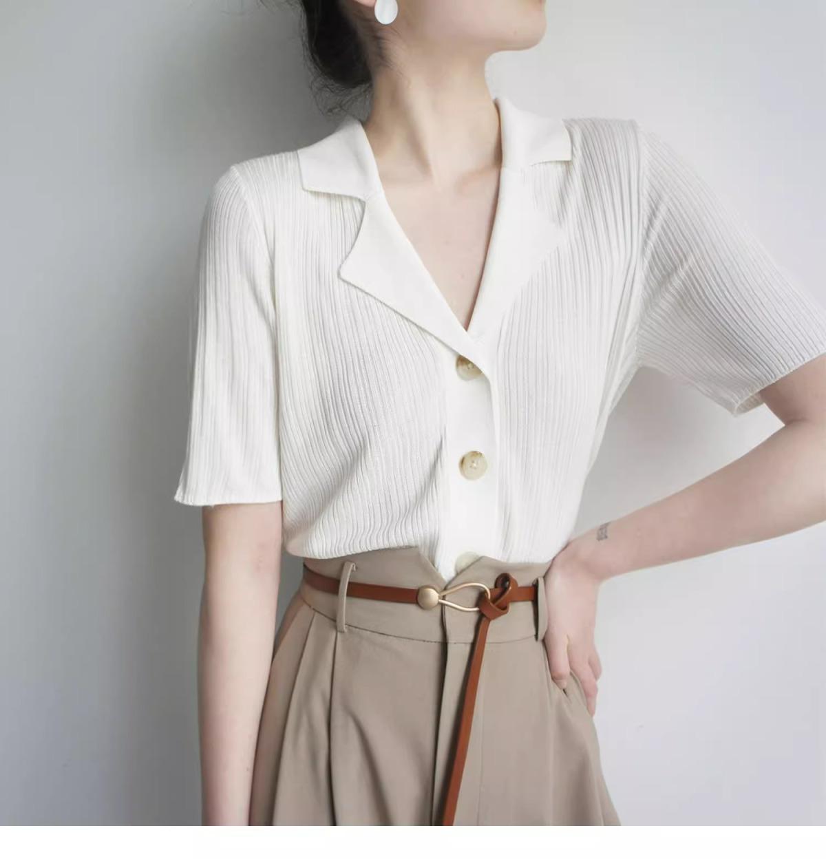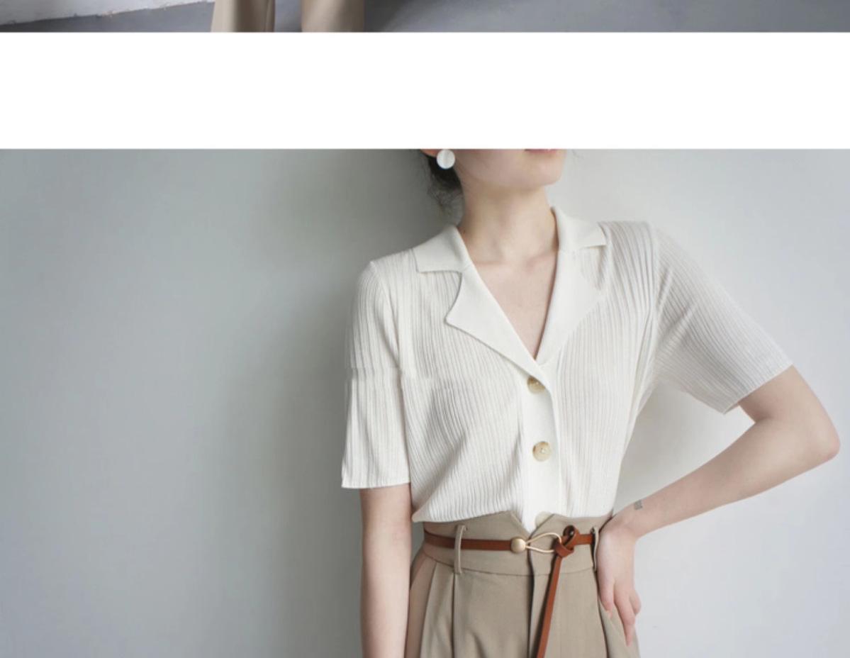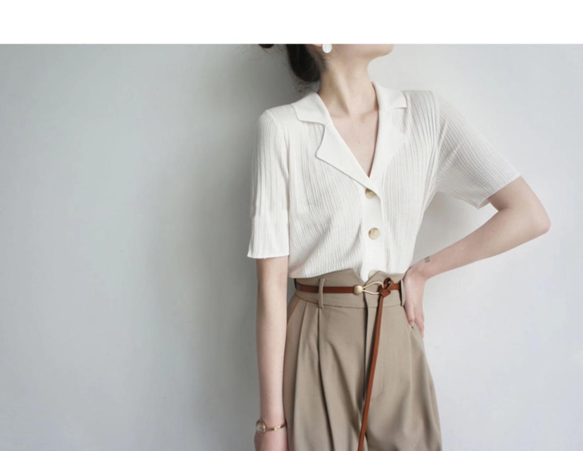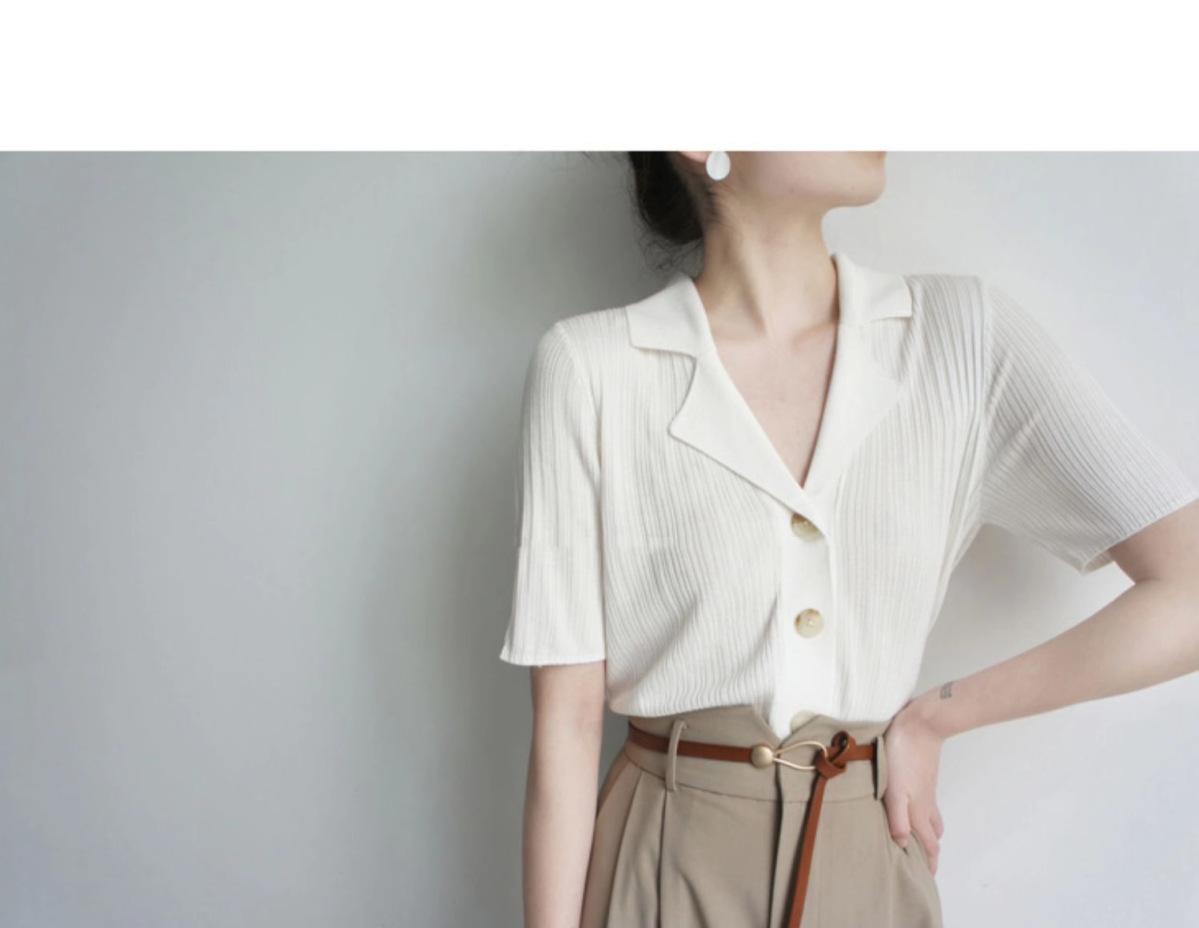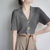 Polo gris de punto cárdigan de manga corta estilo fino solapa para mujer estilo pequeña fragancia camiseta para mujer camiseta de hombro recto top de verano