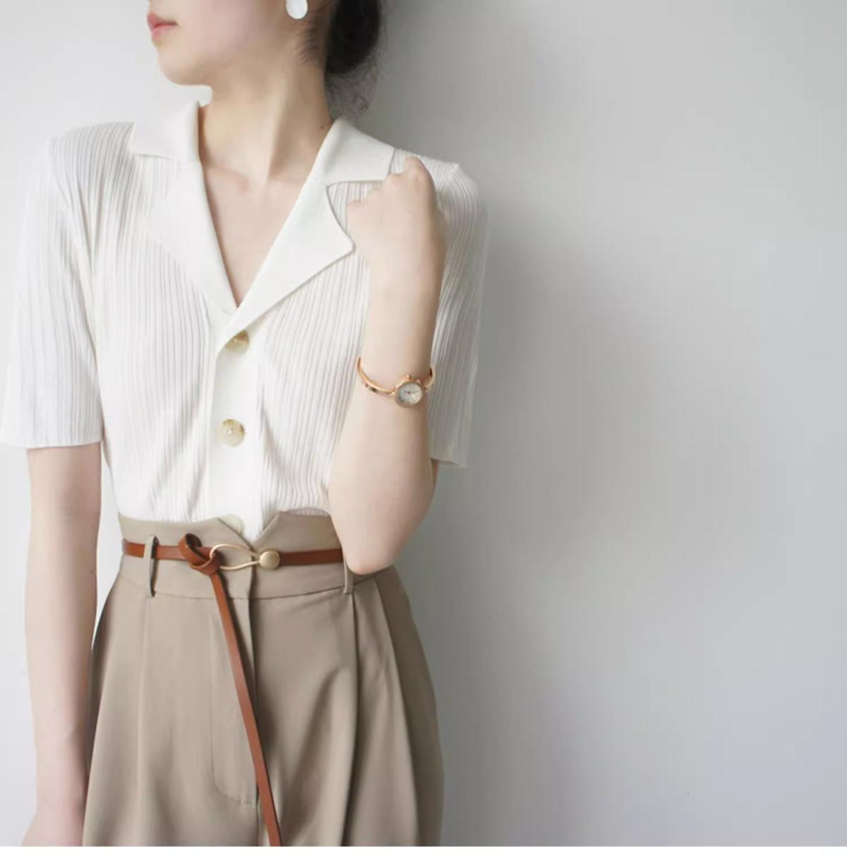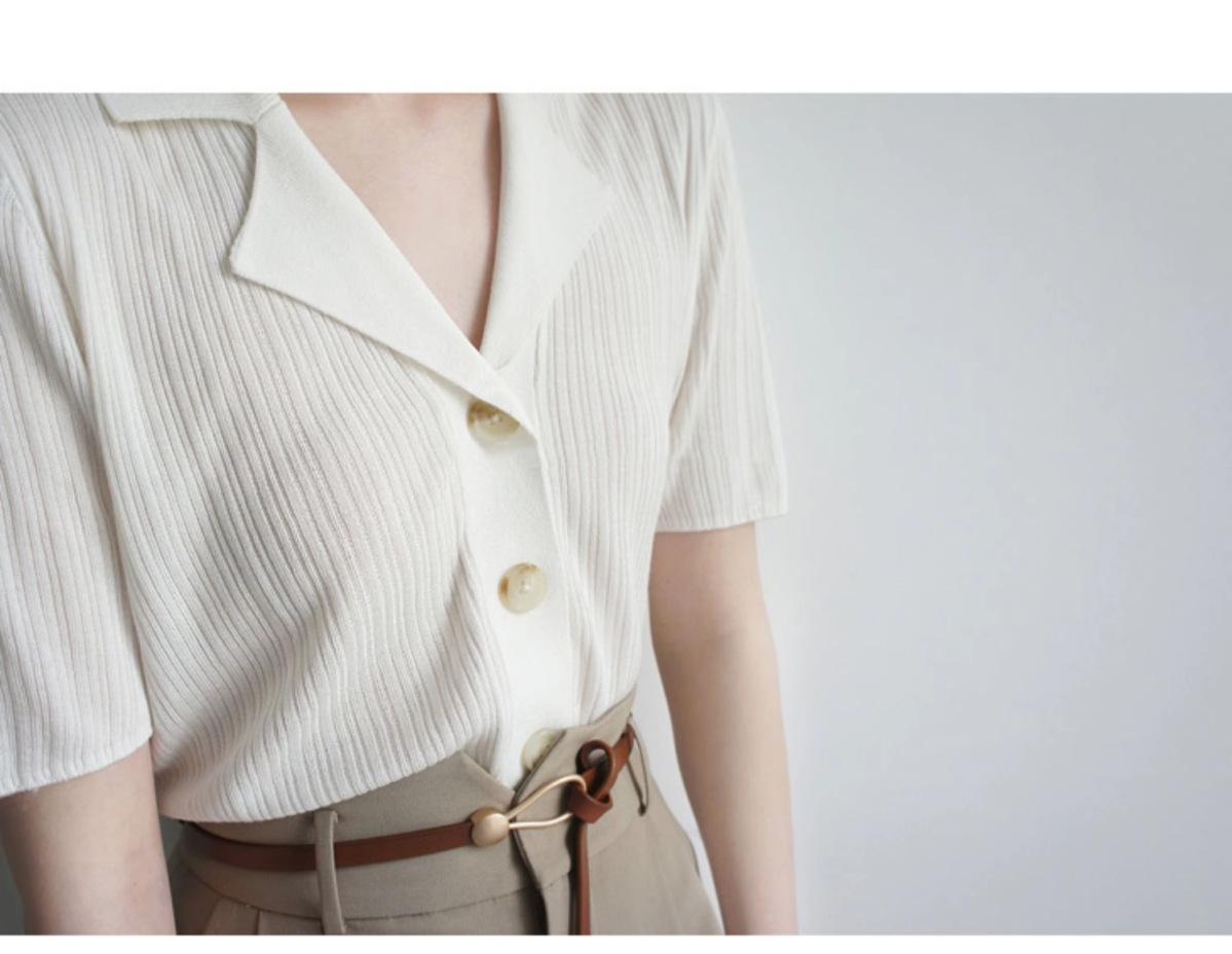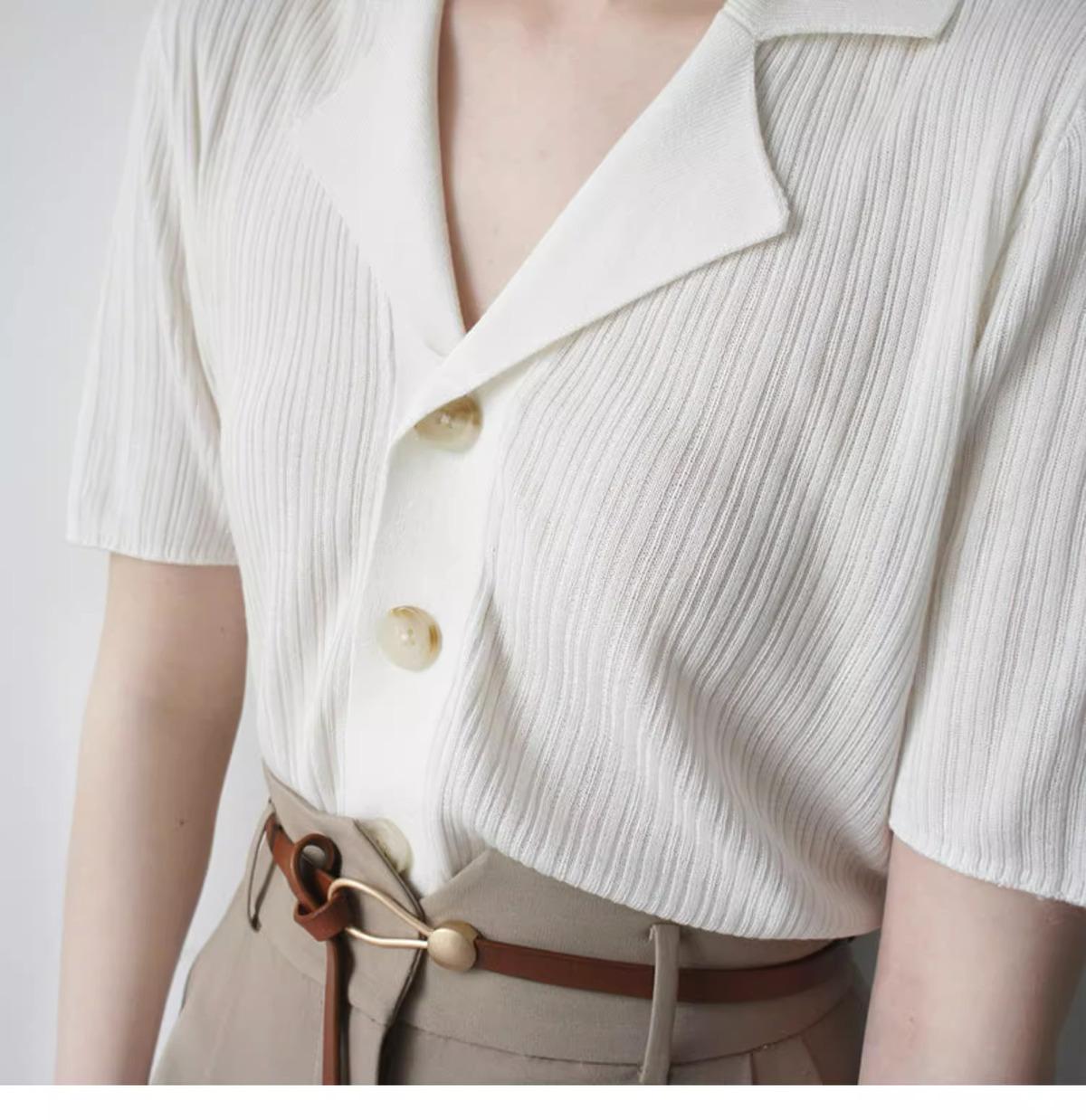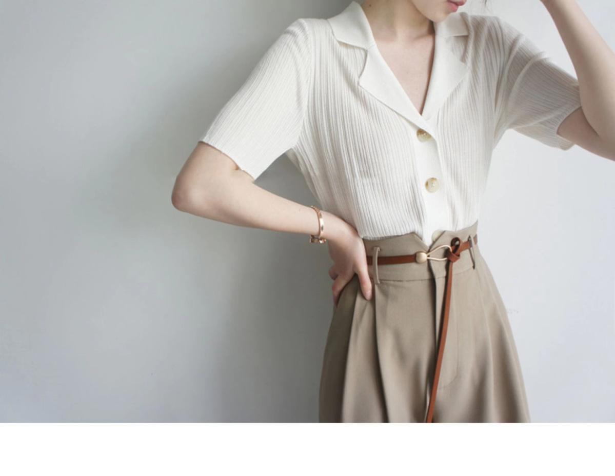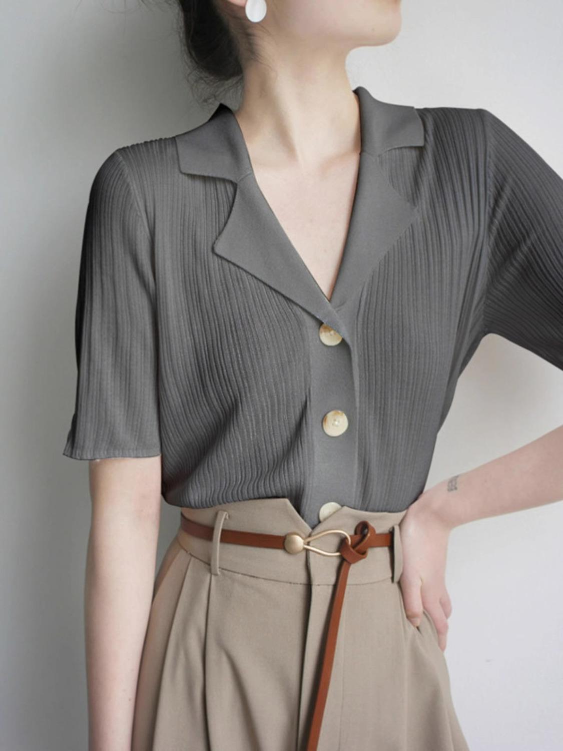 Polo gris de punto cárdigan de manga corta estilo fino solapa para mujer estilo pequeña fragancia camiseta para mujer camiseta de hombro recto top de verano