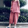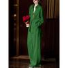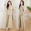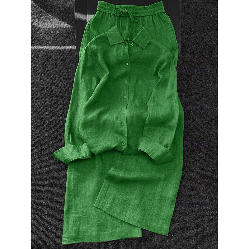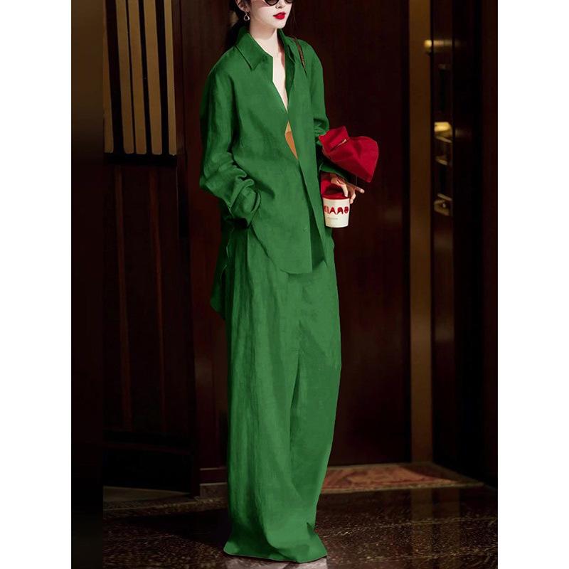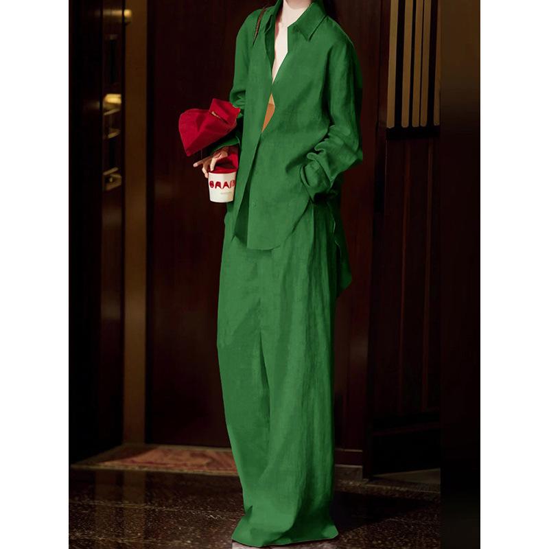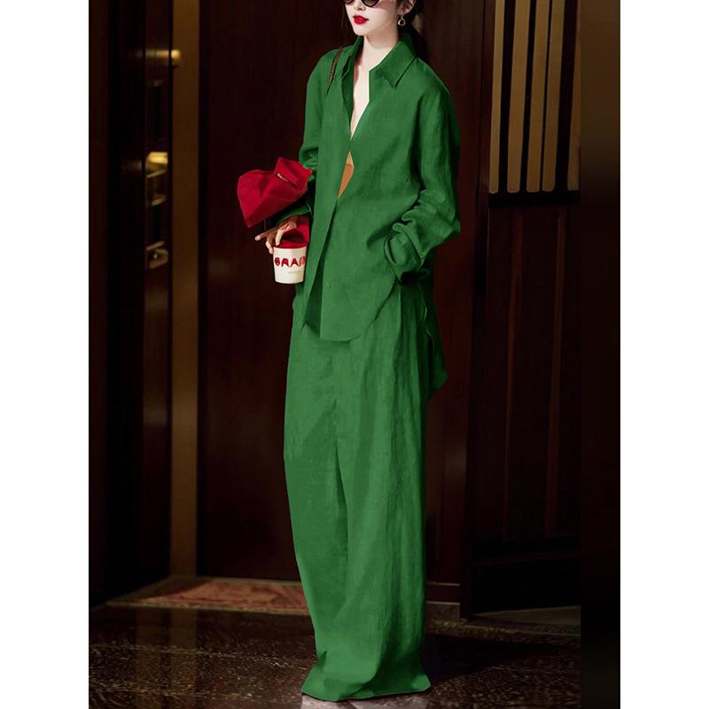 Verano 2025 Estilo Relajado Estilo Coreano Holgado Verde Solapa Imitación Lino Camisa Pantalones Pierna Ancha Traje de Dos Piezas