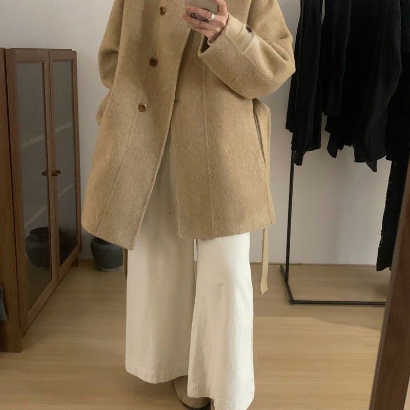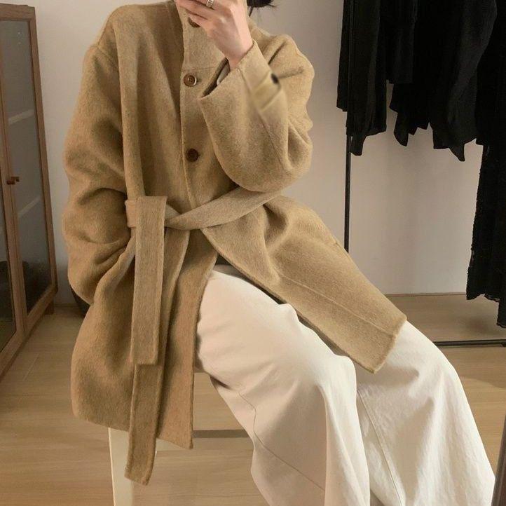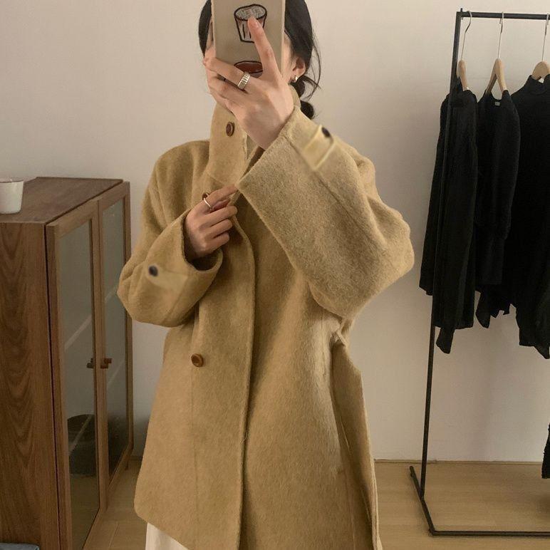 Abrigo de Lana de Cuello Alto de Estilo Coreano para Mujer Otoño Invierno Estilo Universitario Moda Petite Chic Abrigo de Lana Suelto