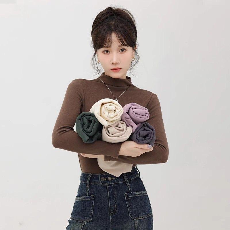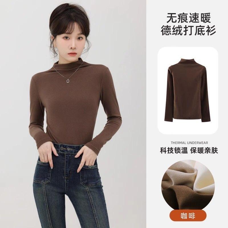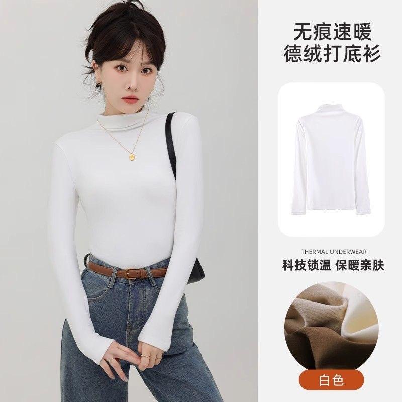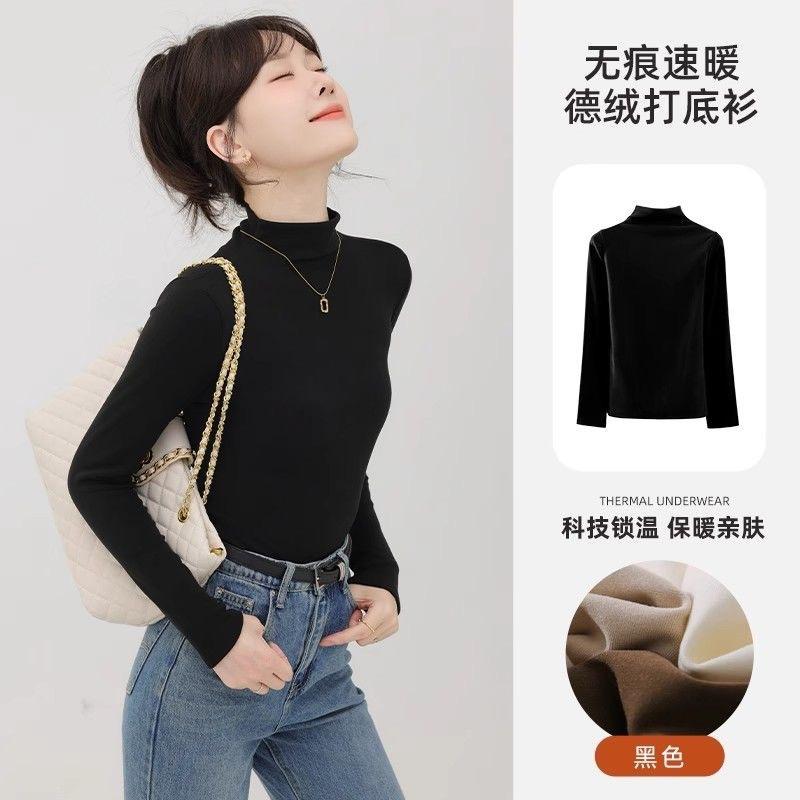 Felpa pesada con forro de terciopelo alemán de doble cara multicolor de una pieza Felpa cálida de capa base Camiseta de manga larga con cuello medio alto para mujer a la moda