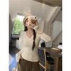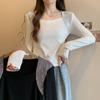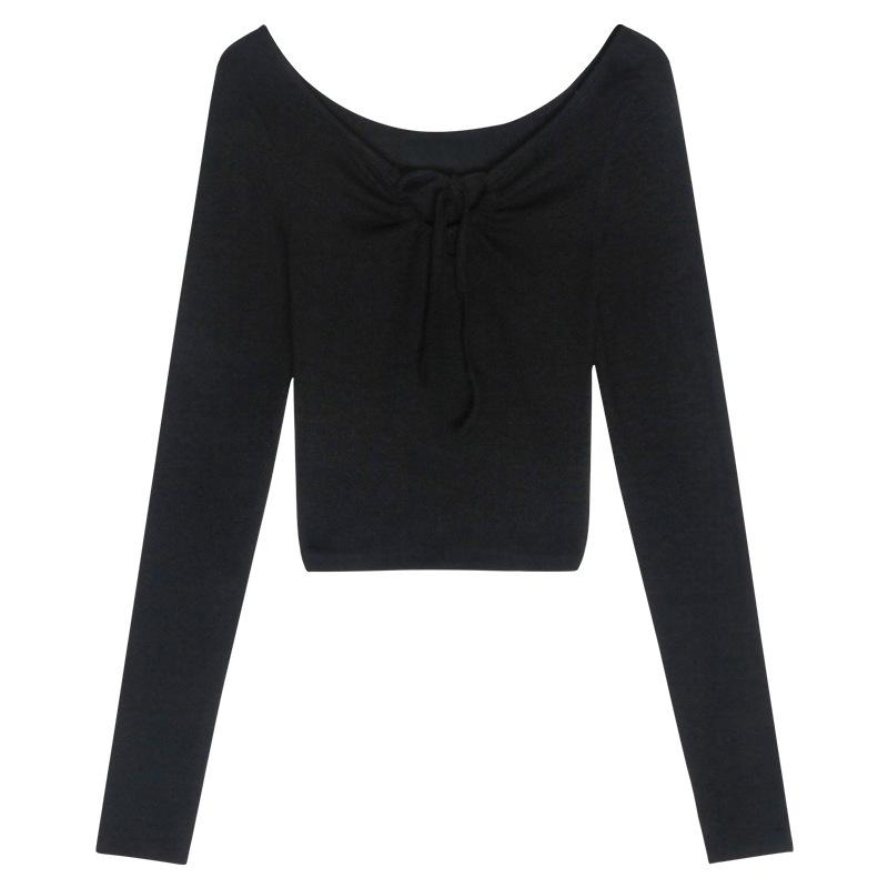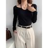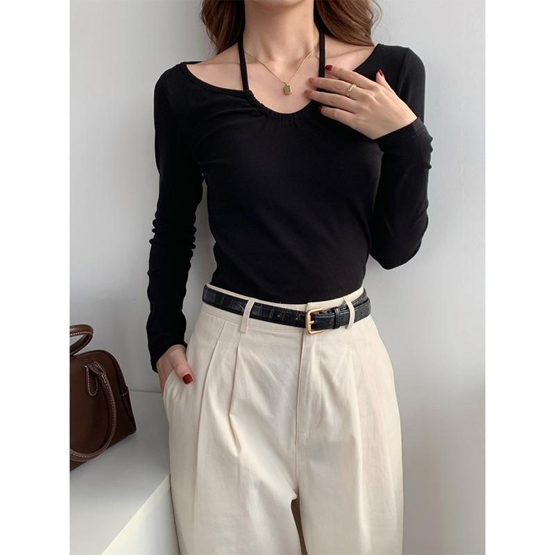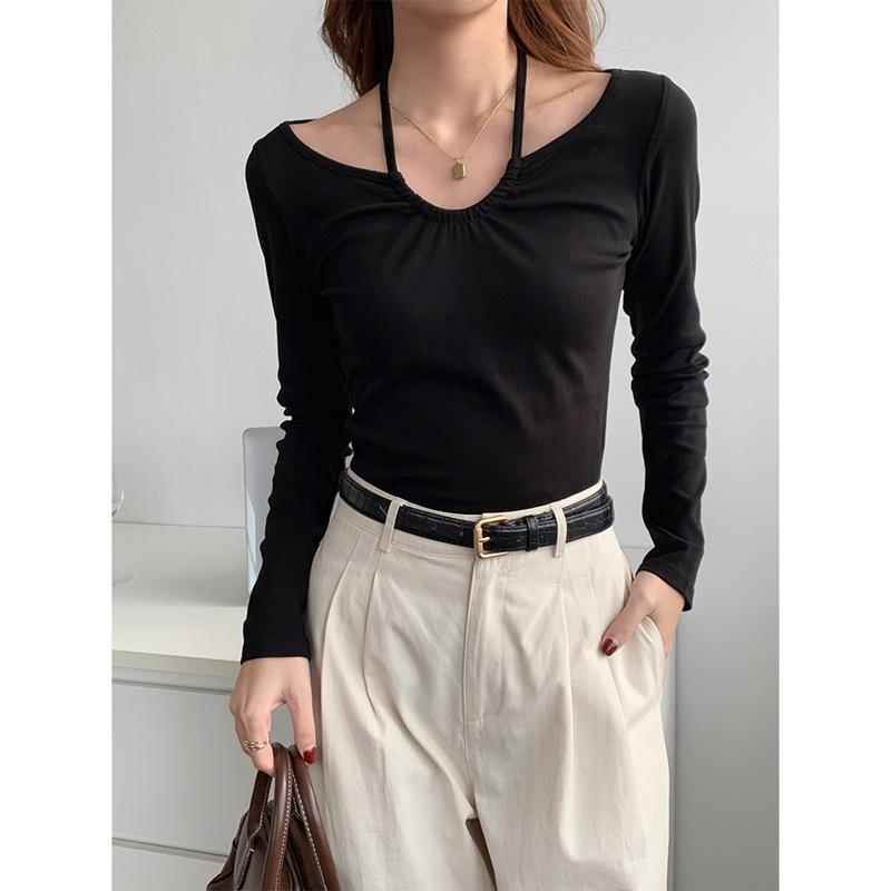 Diseño negro sentido nicho chica caliente top corto para mujer temporada de primavera y otoño ropa interior camiseta básica cuello en V halter manga larga