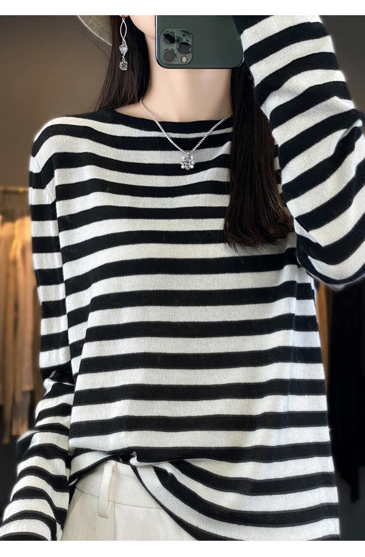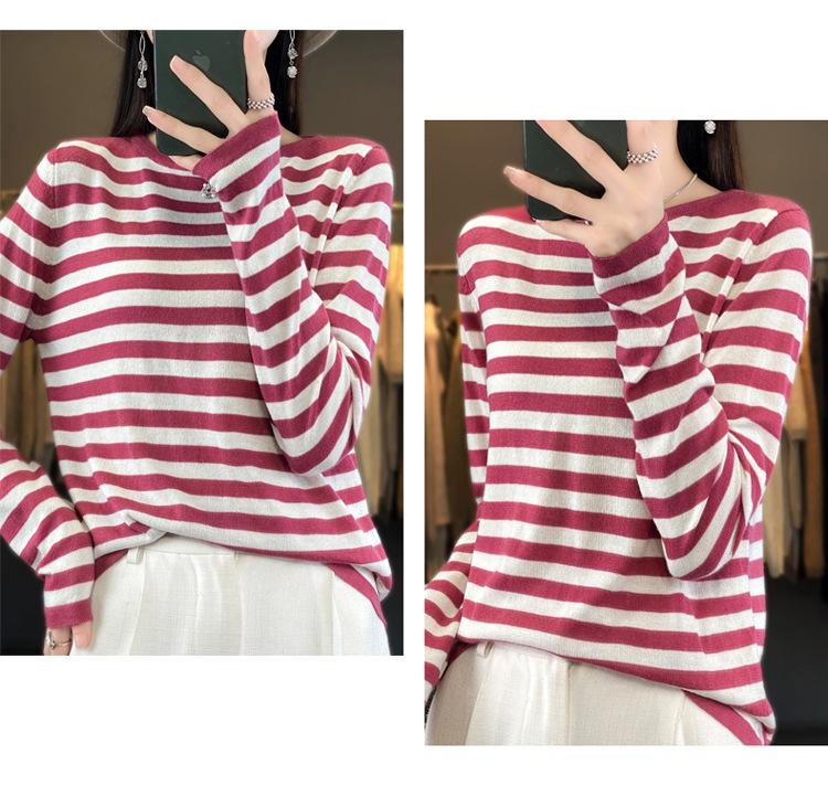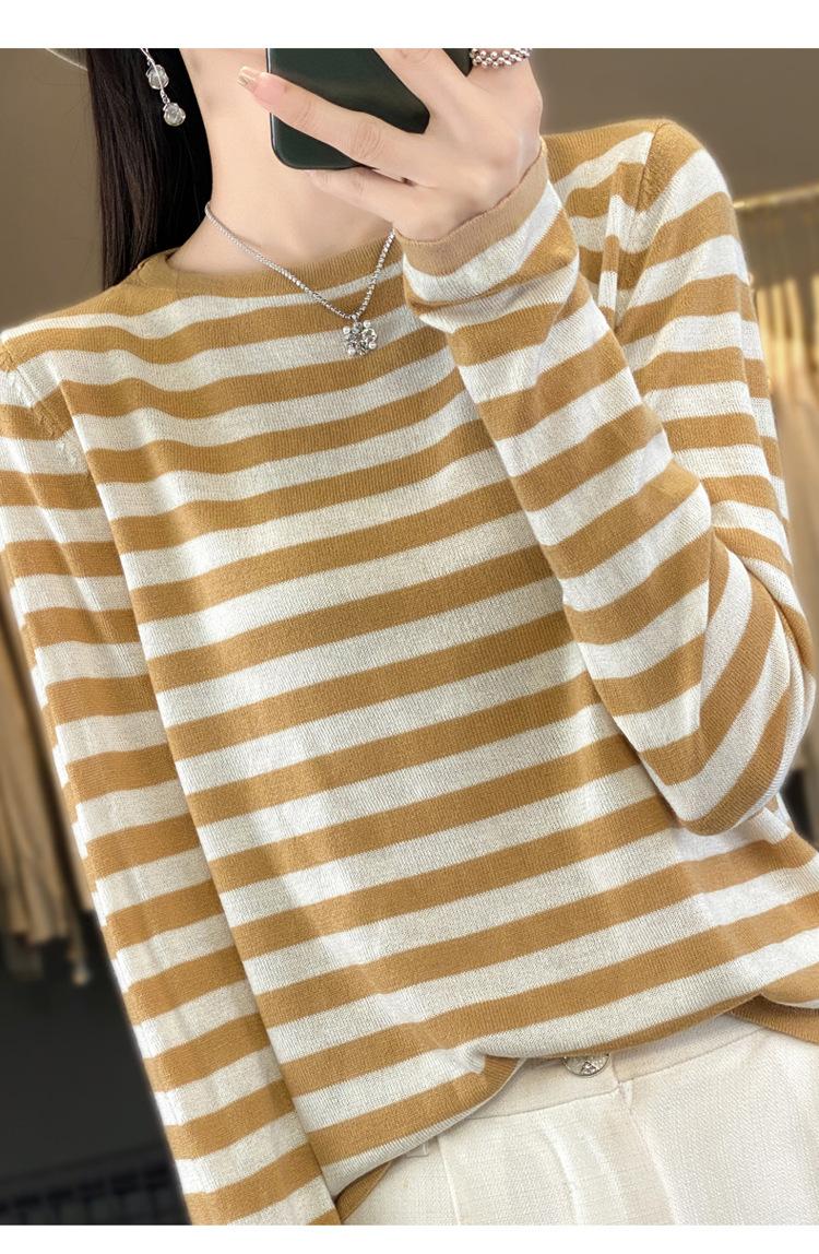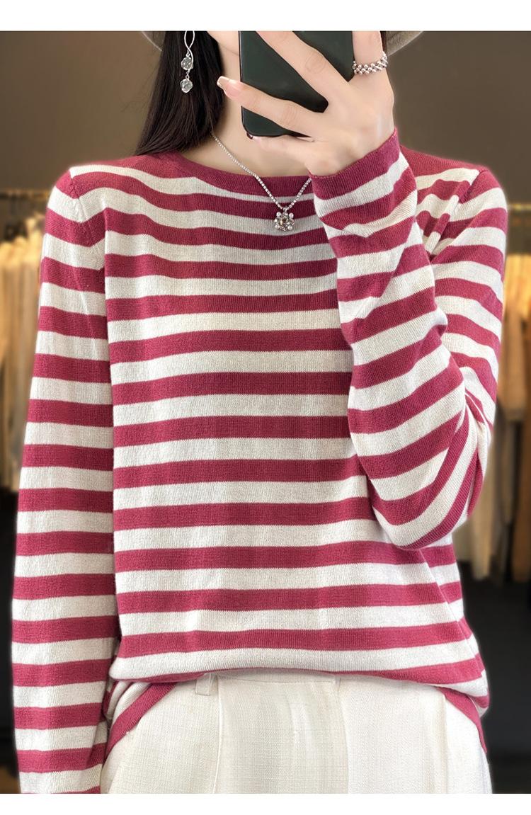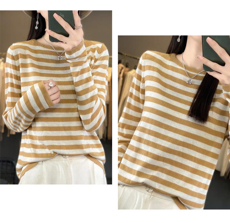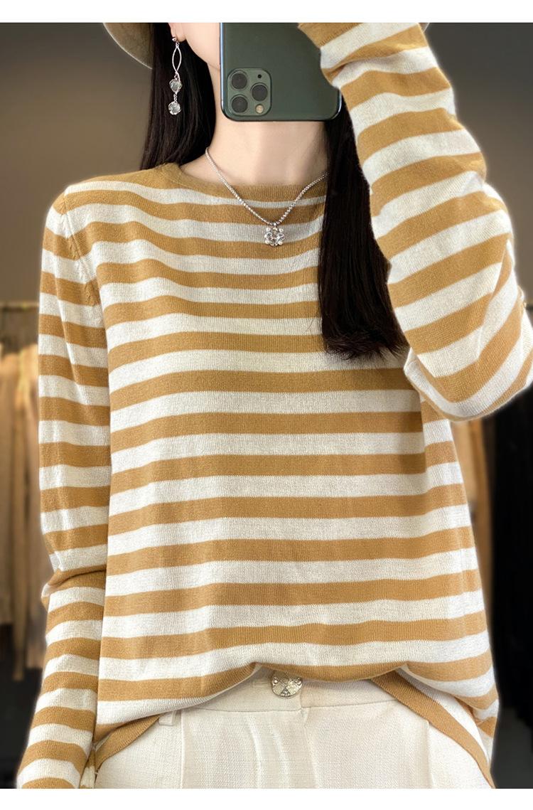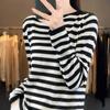 Suéter Tejido de Otoño e Invierno Cuello Redondo Suéter para Mujer Capa Base Transfronterizo Suelto Rayado Nuevo 2025 Lana Merino Bloque de Color