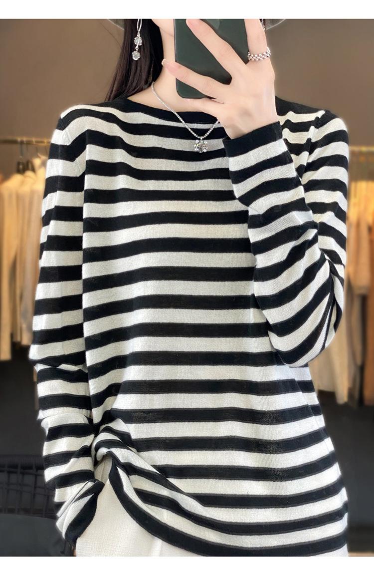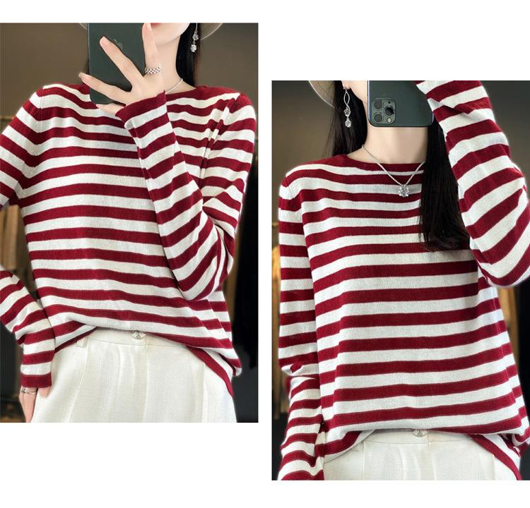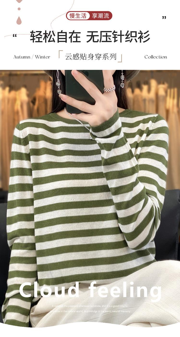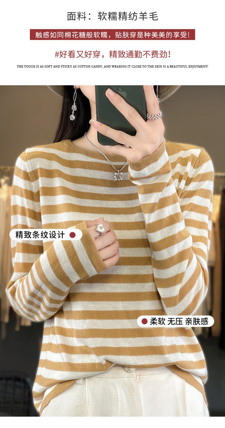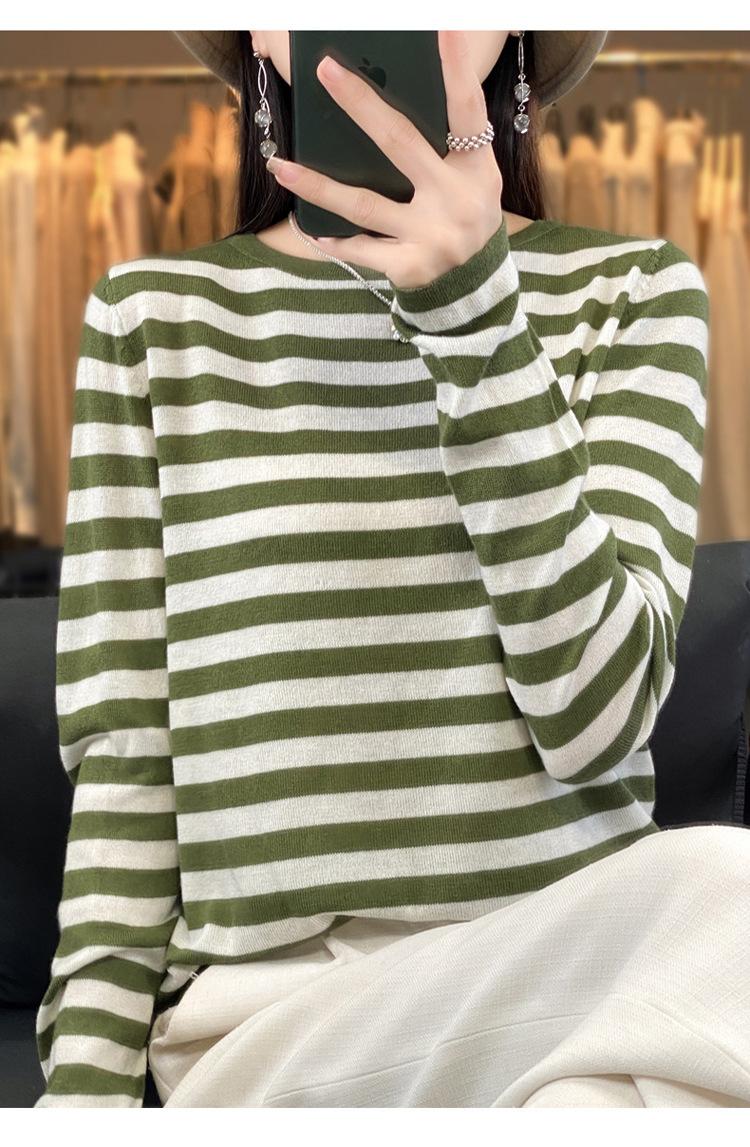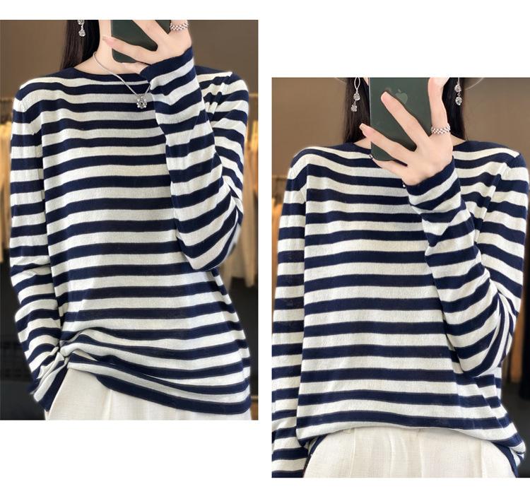 Suéter Tejido de Otoño e Invierno Cuello Redondo Suéter para Mujer Capa Base Transfronterizo Suelto Rayado Nuevo 2025 Lana Merino Bloque de Color