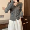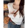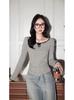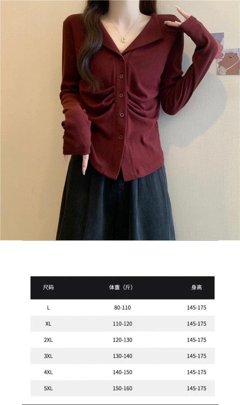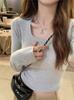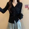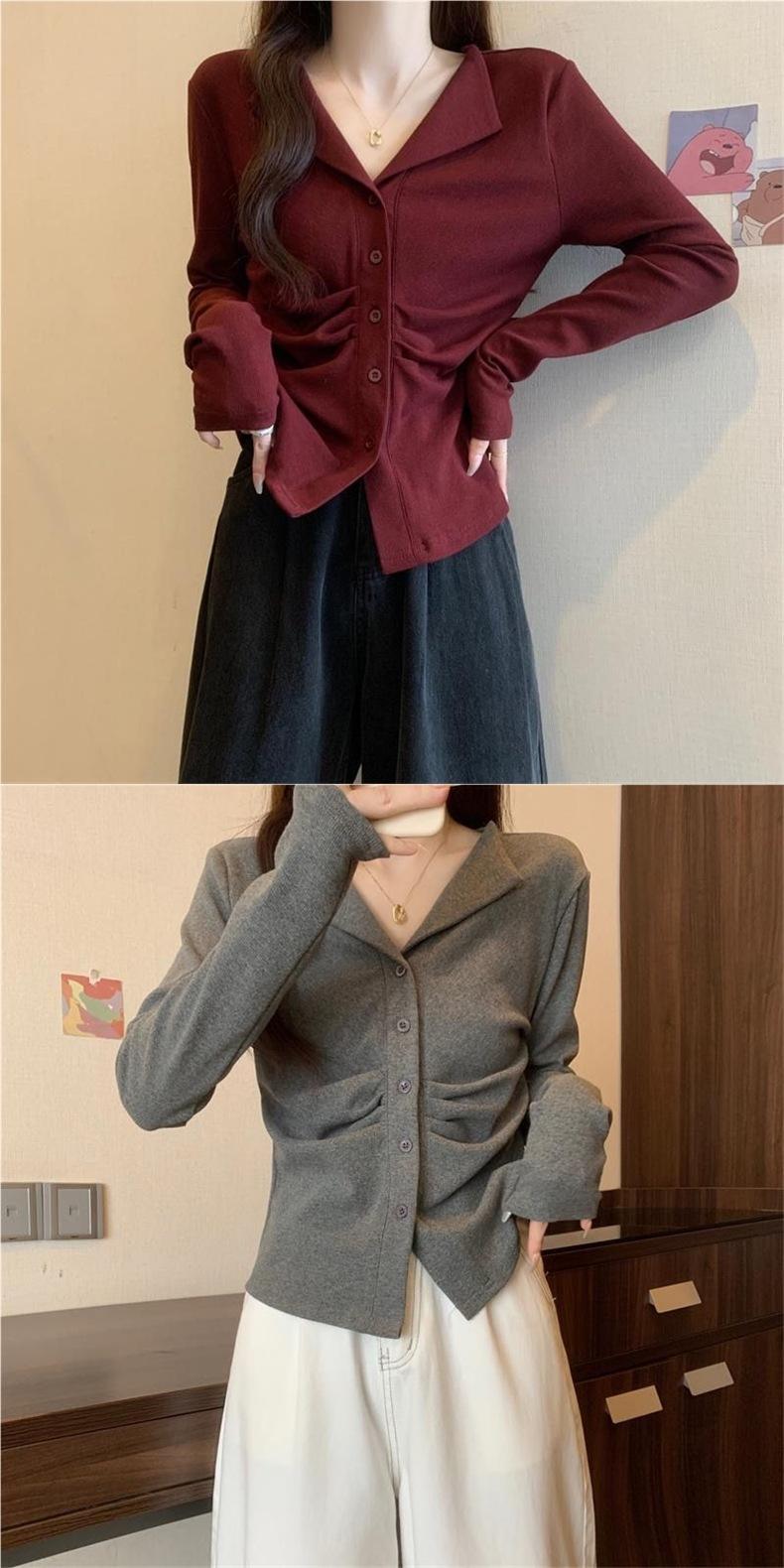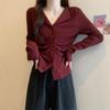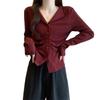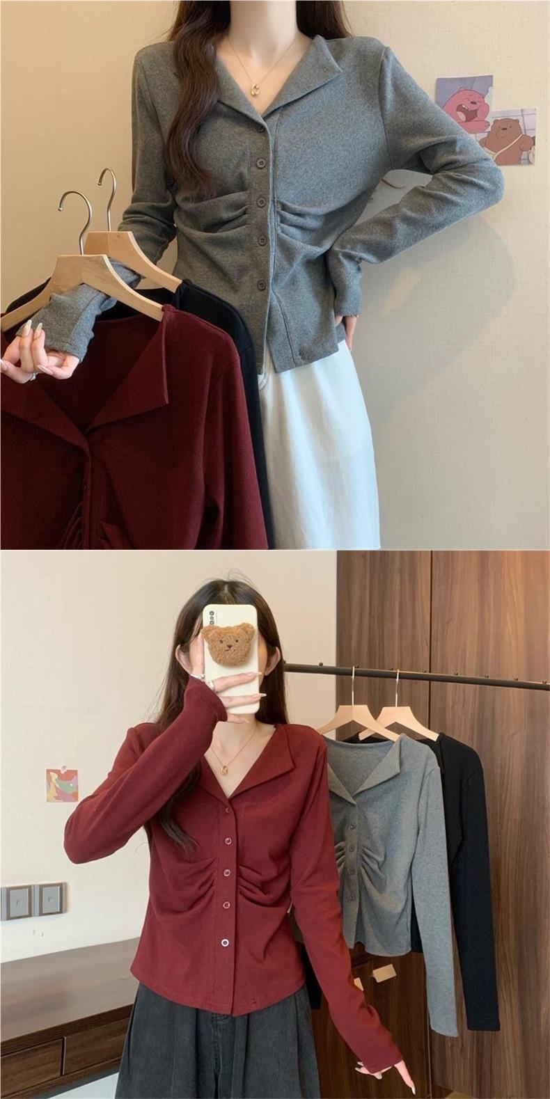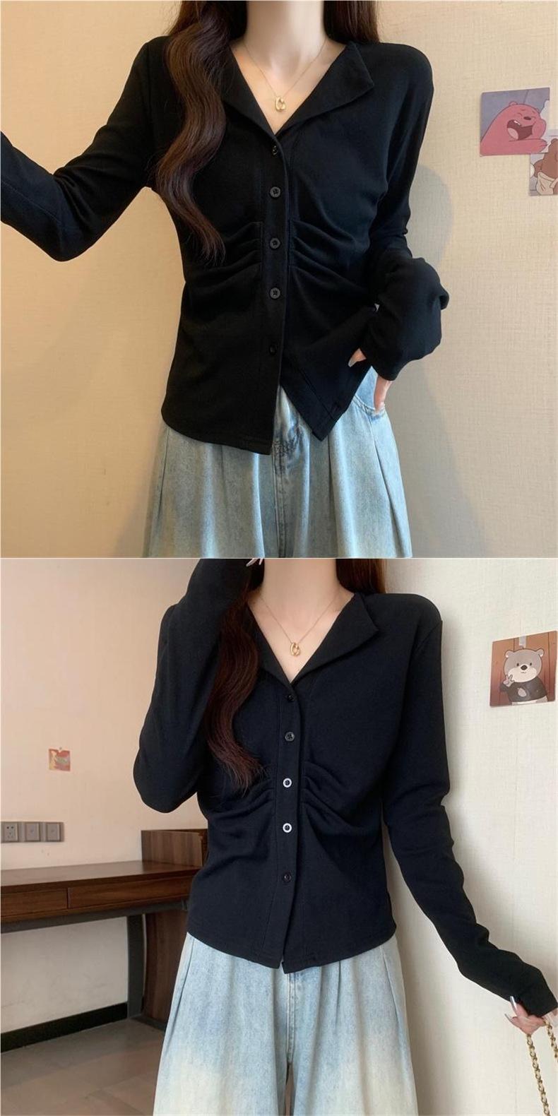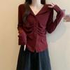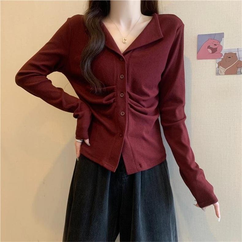 2025 Primavera y Otoño Nuevo Diseño Sentido Fruncido Manga Larga Camiseta Mujer Adelgazante Color Sólido Camisa Base Cuello Top