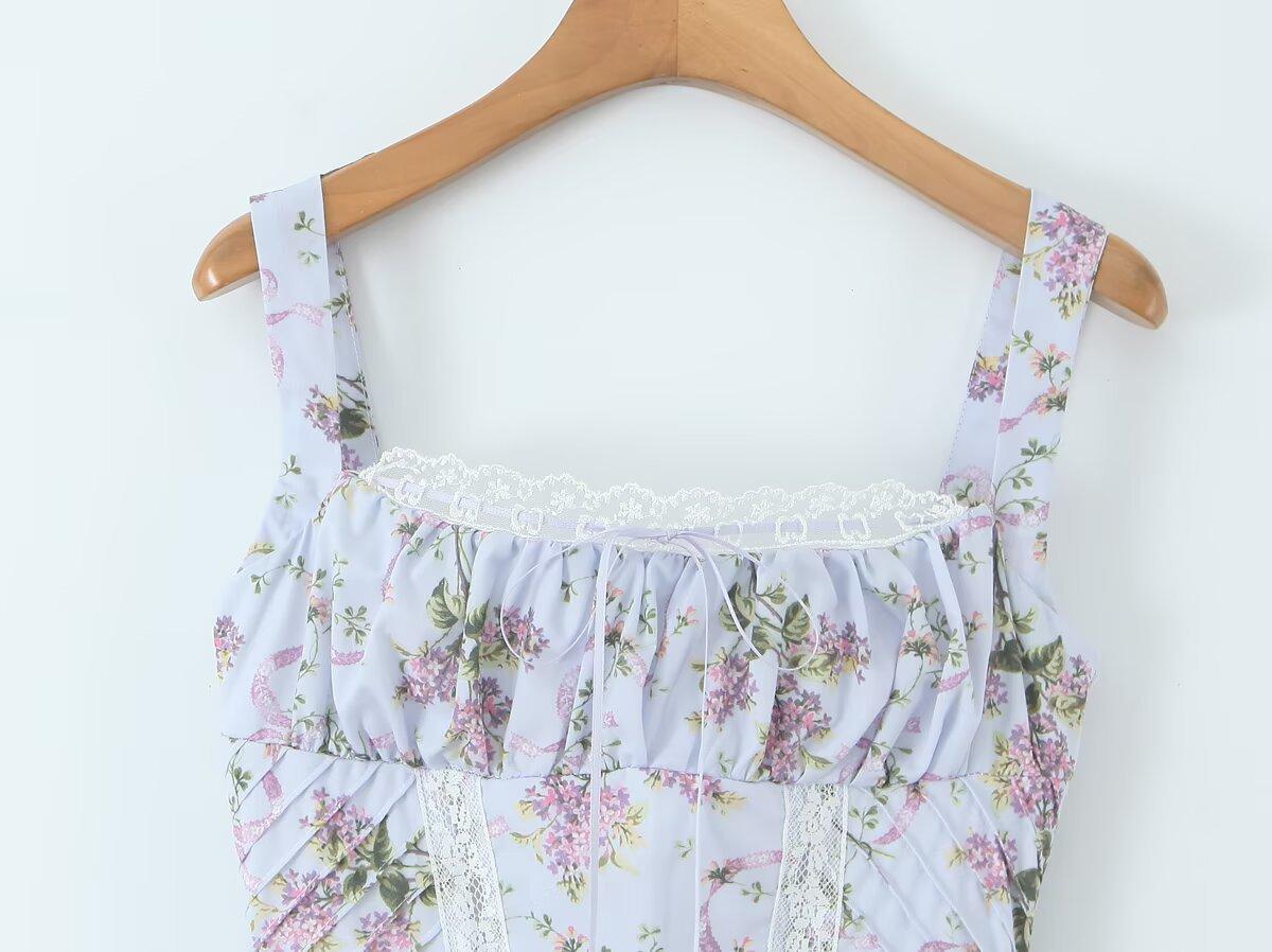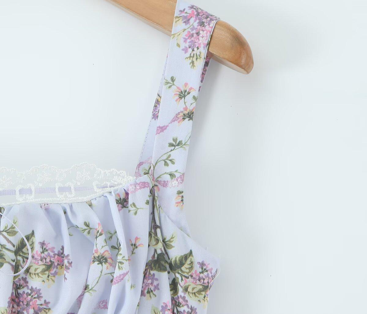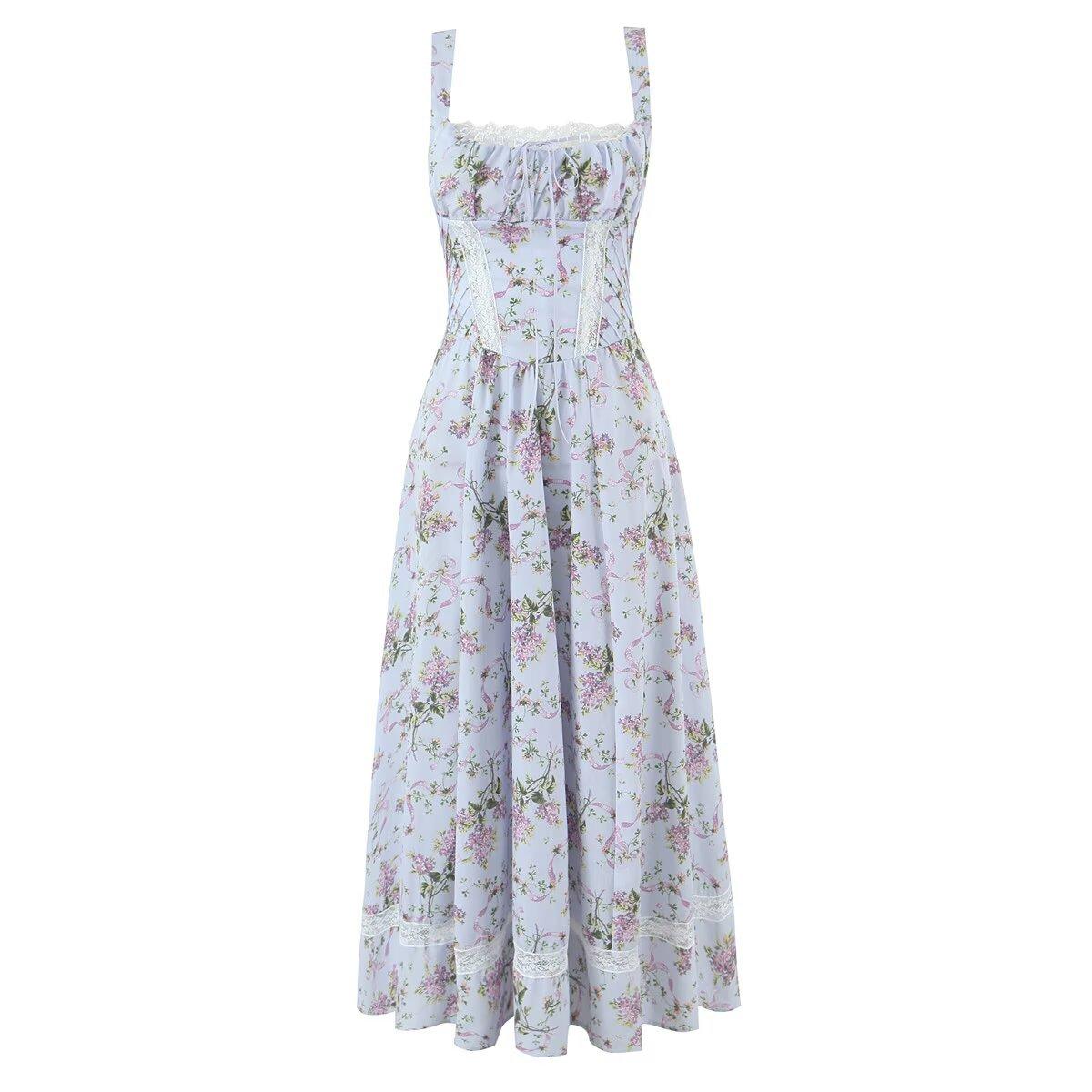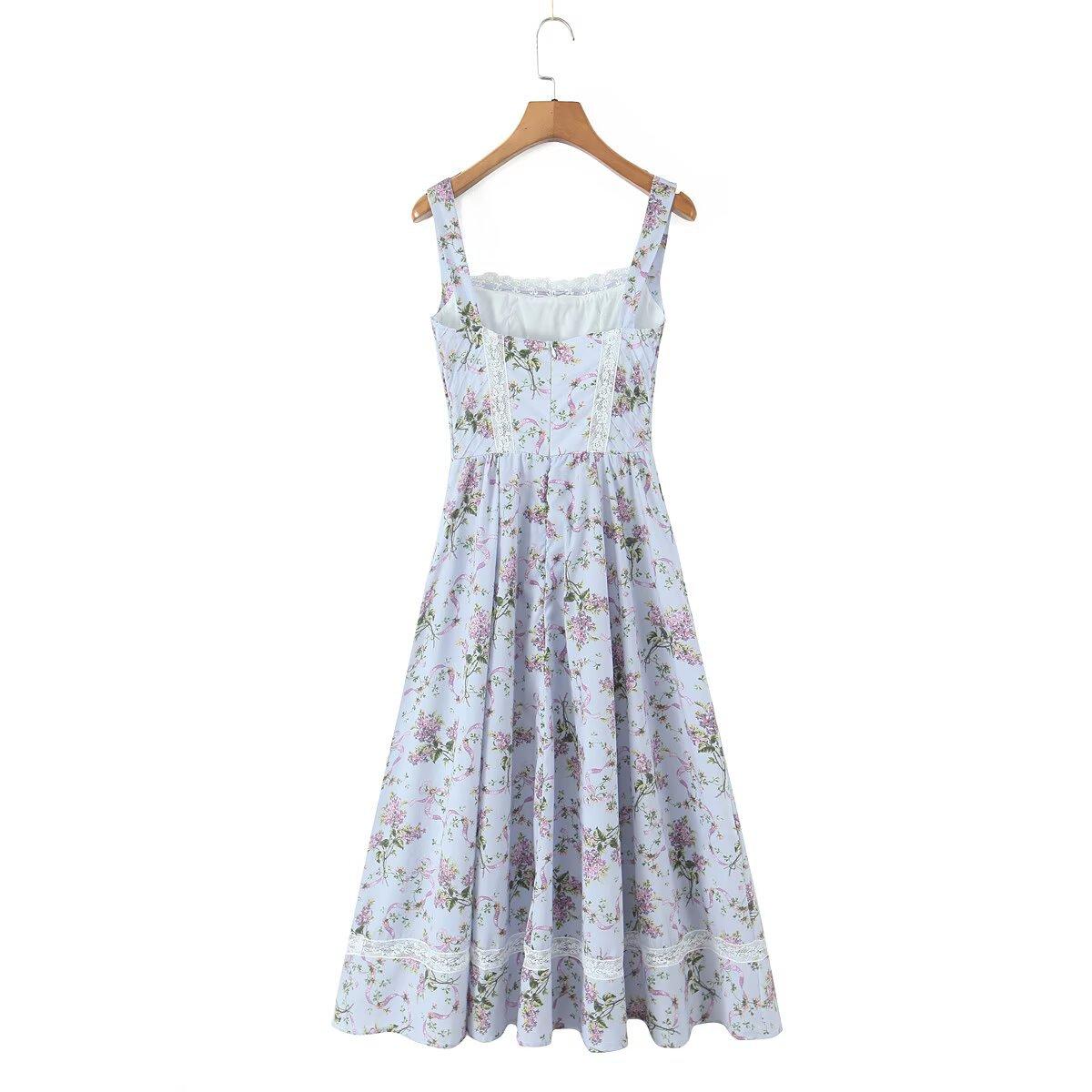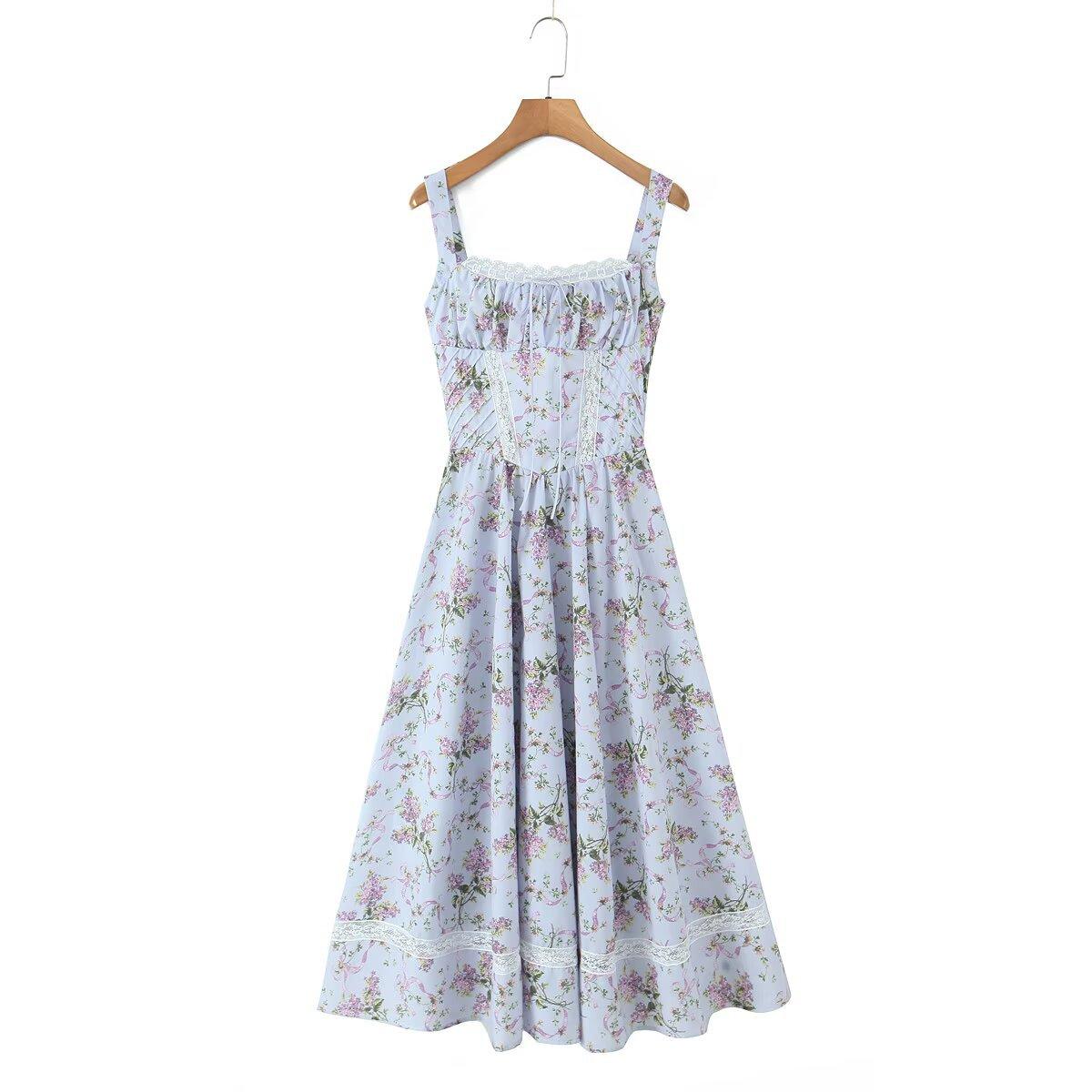 Venta al por mayor de comercio exterior transfronterizo 2025 Verano Nuevo Estilo Europeo y Americano Vestido de tirantes estampado para mujer con encaje empalmado en la cintura