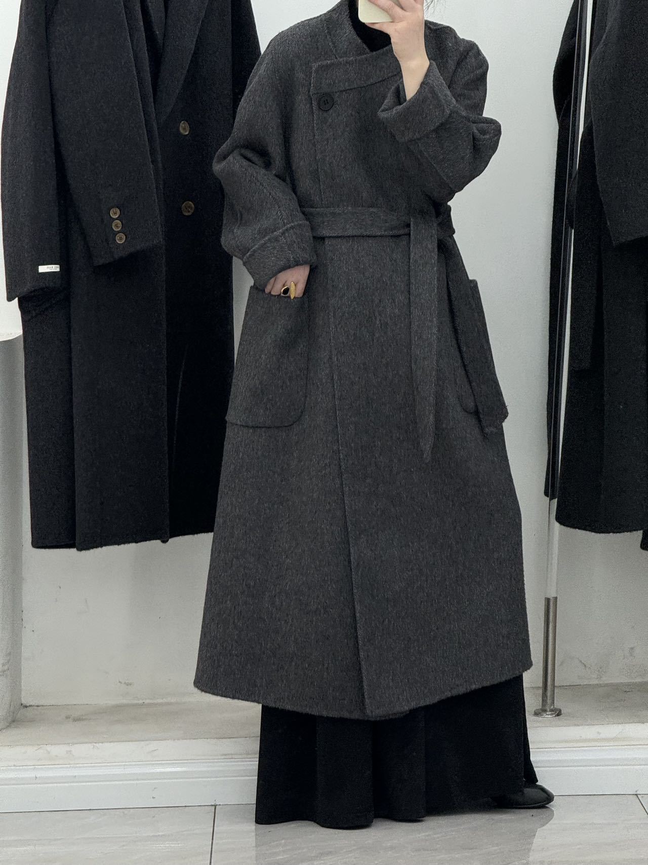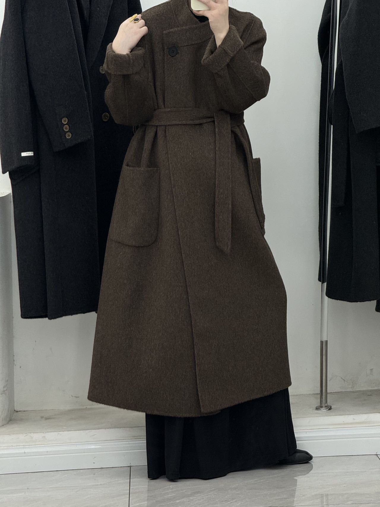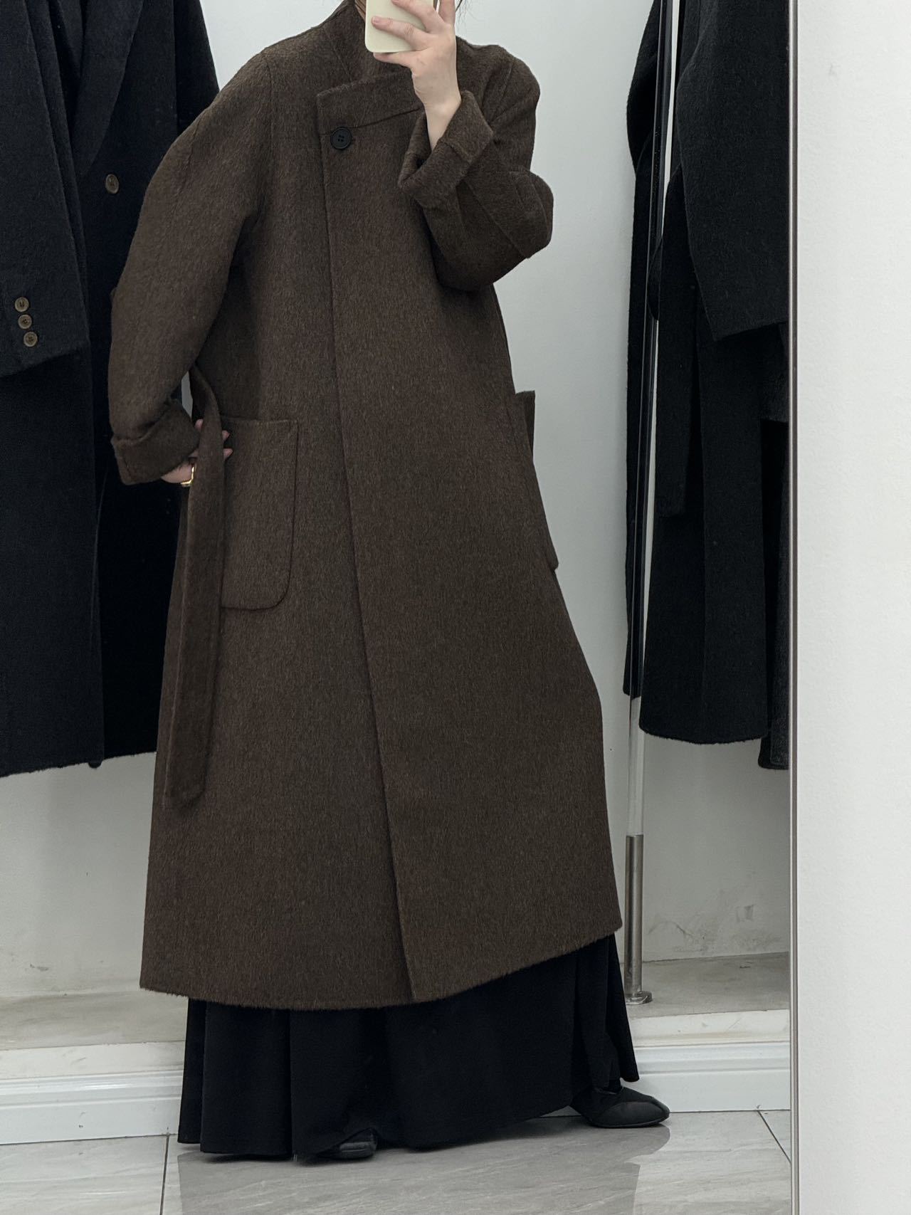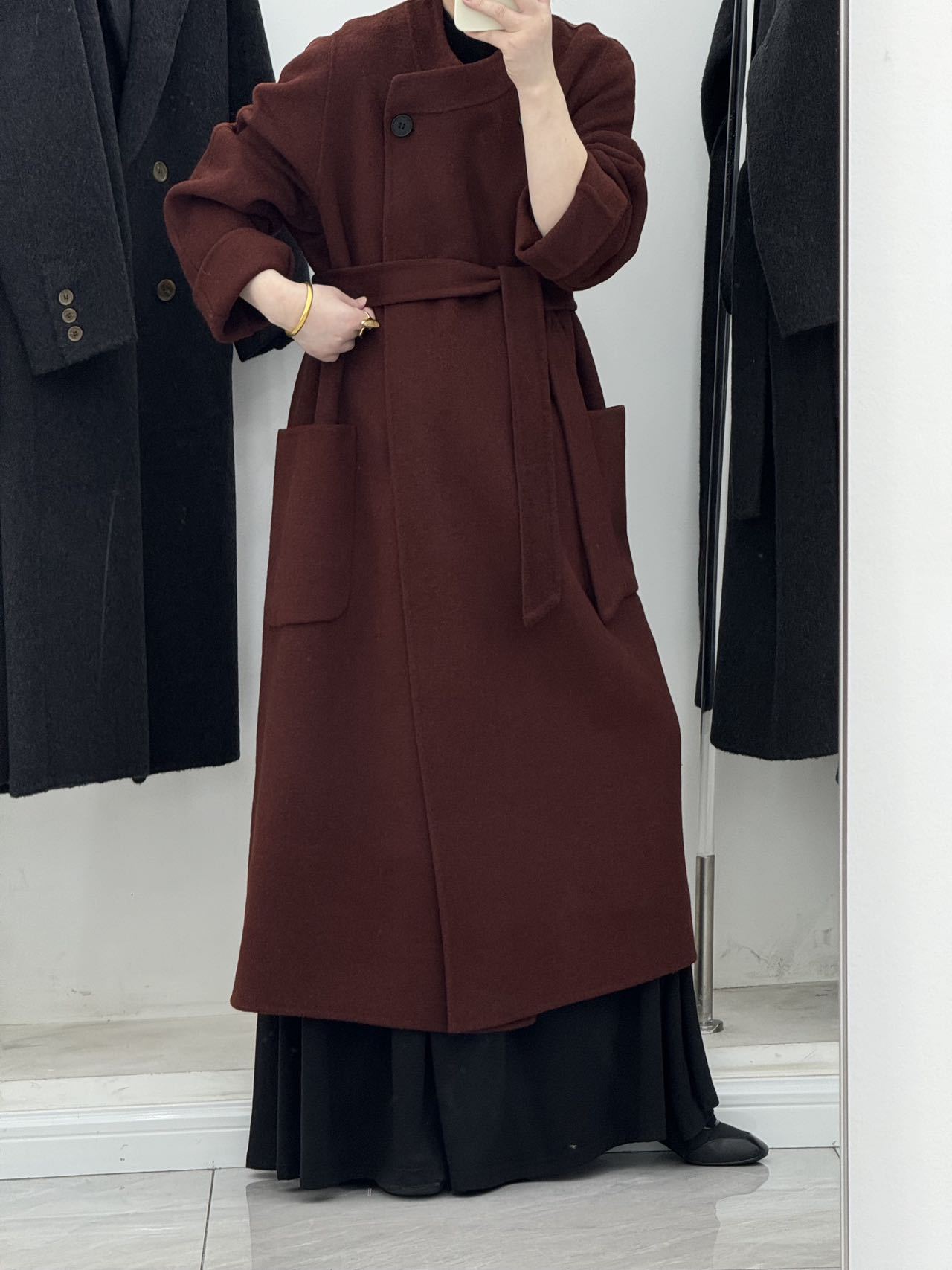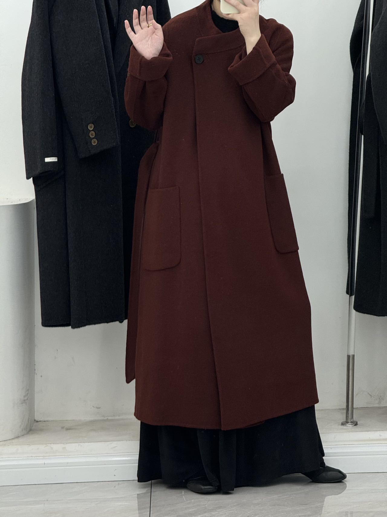 Lana de doble cara Color sólido Coreano Cuello redondo con cordones Ajustado Otoño 24 Invierno Nuevo estilo Estilo holgazán Más abrigo Abrigo largo