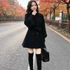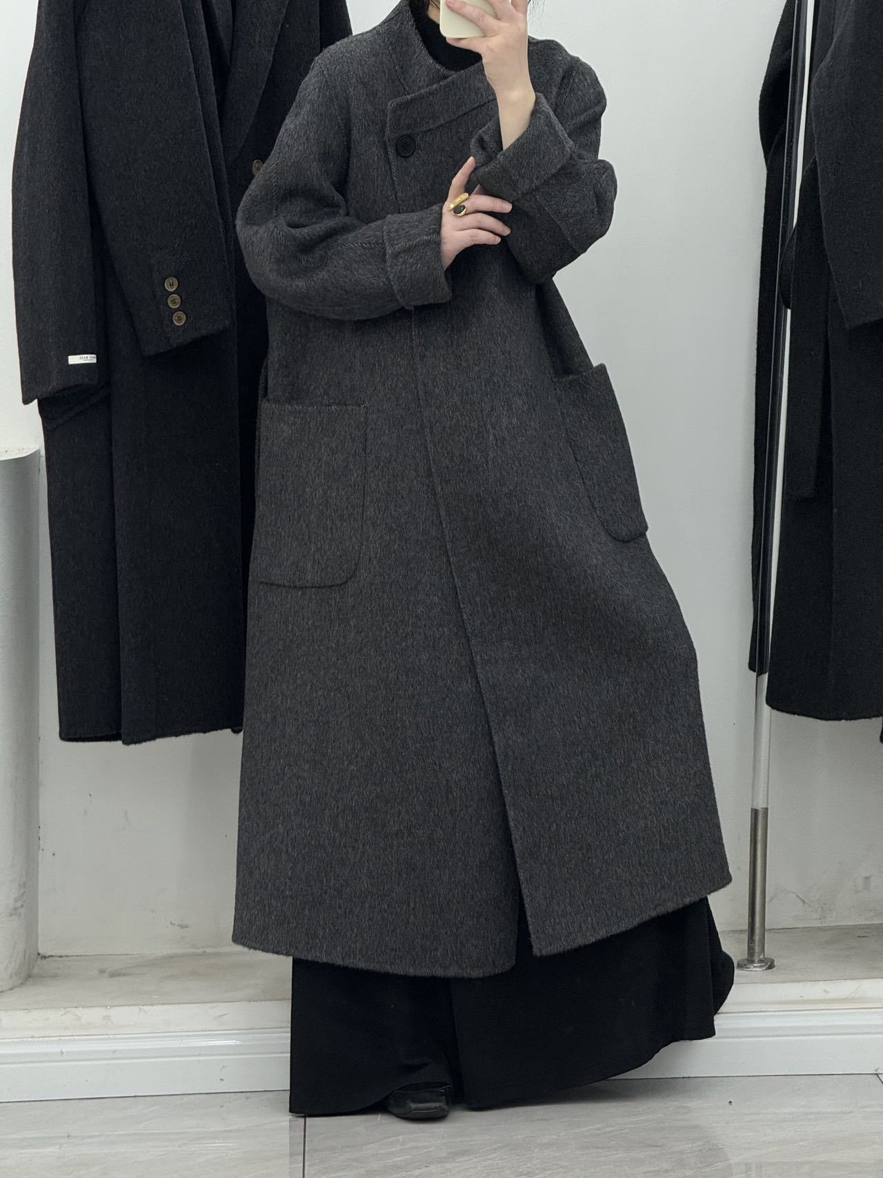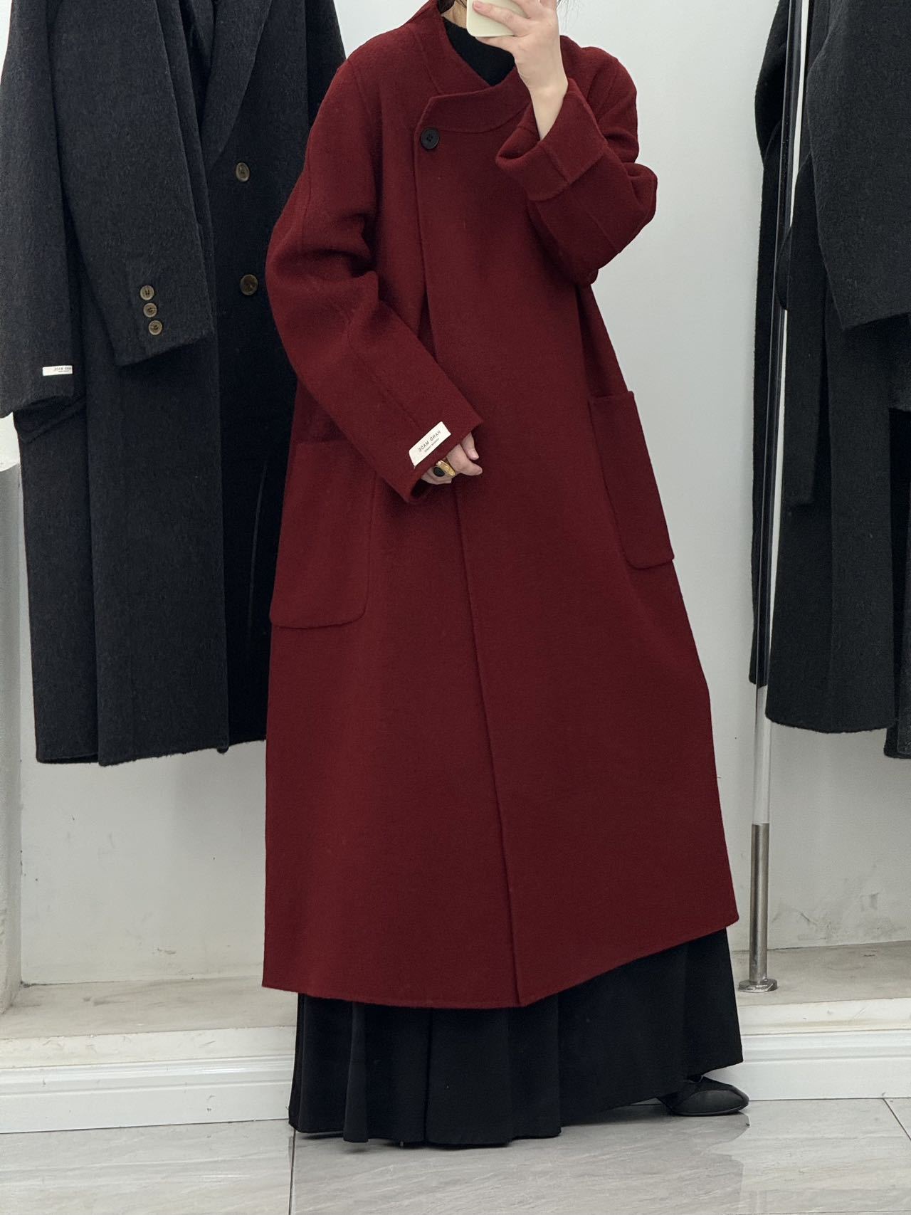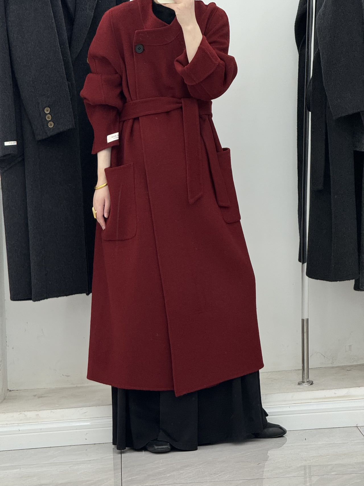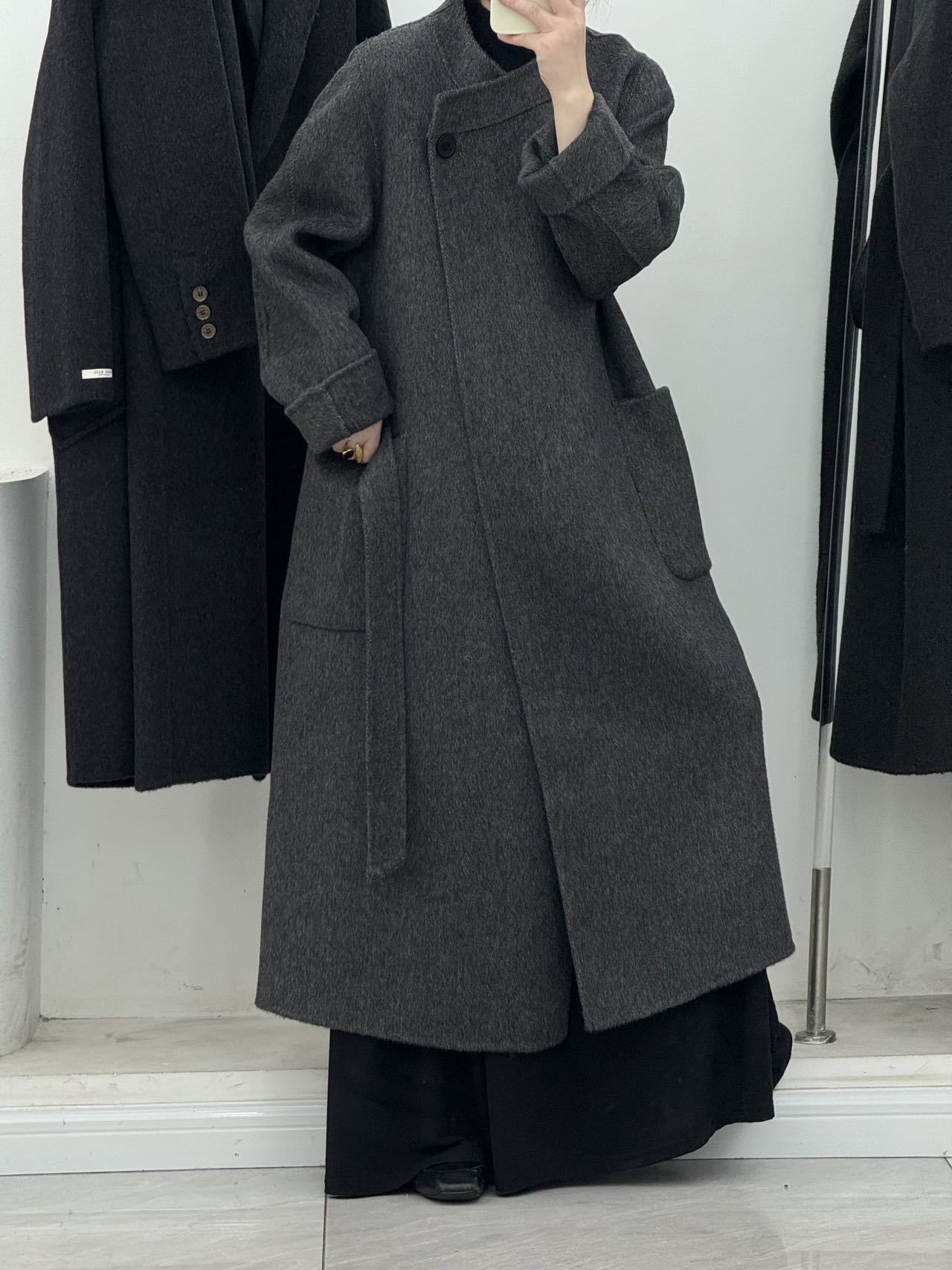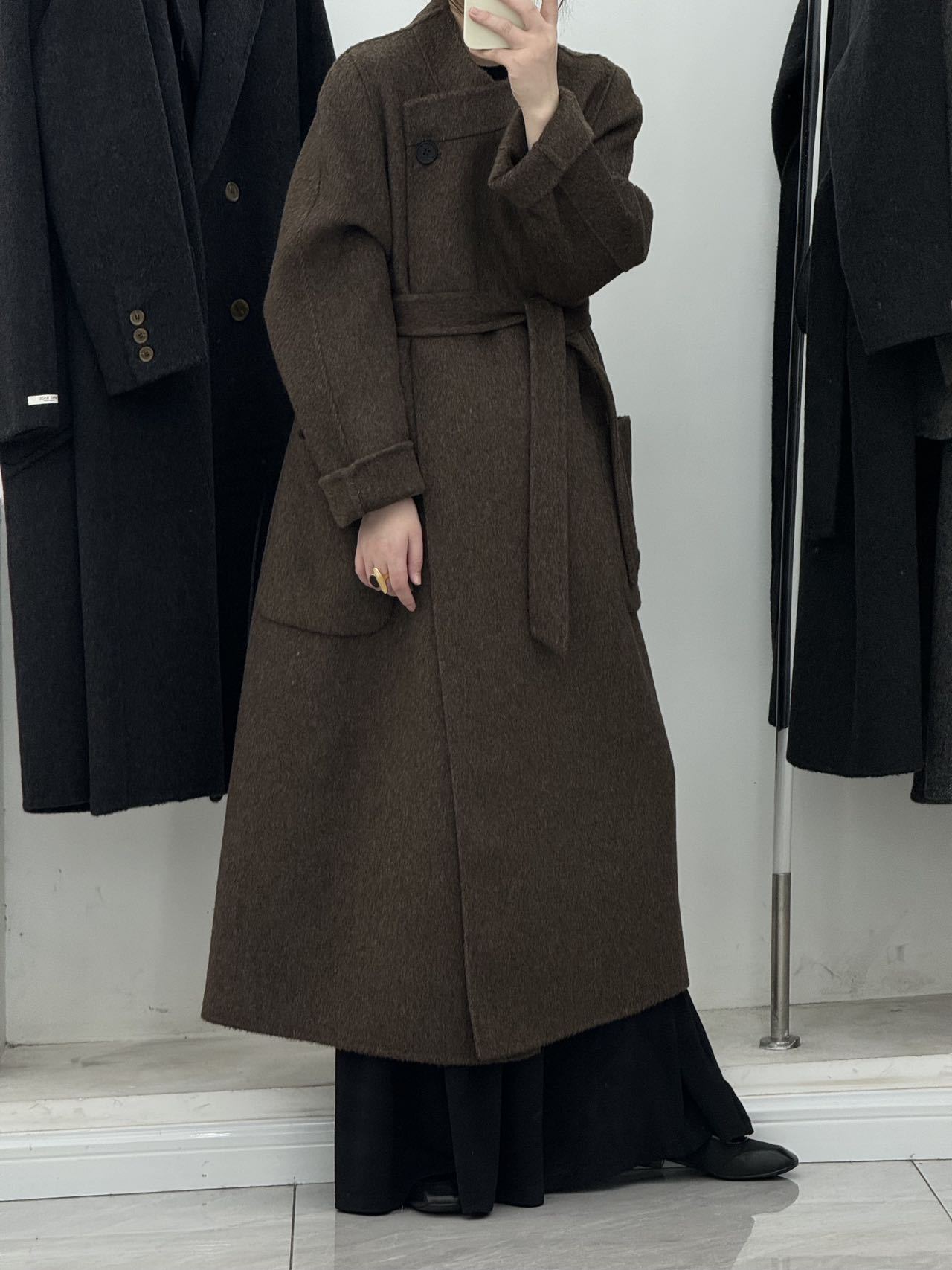 Lana de doble cara Color sólido Coreano Cuello redondo con cordones Ajustado Otoño 24 Invierno Nuevo estilo Estilo holgazán Más abrigo Abrigo largo