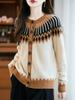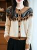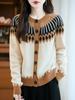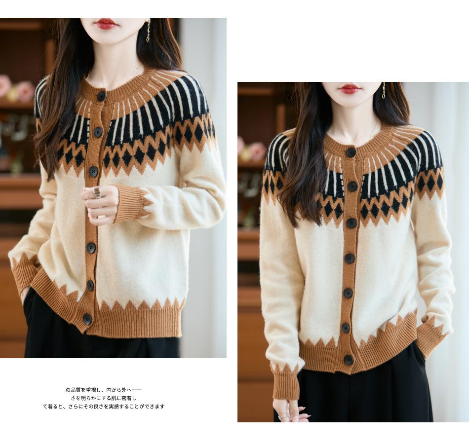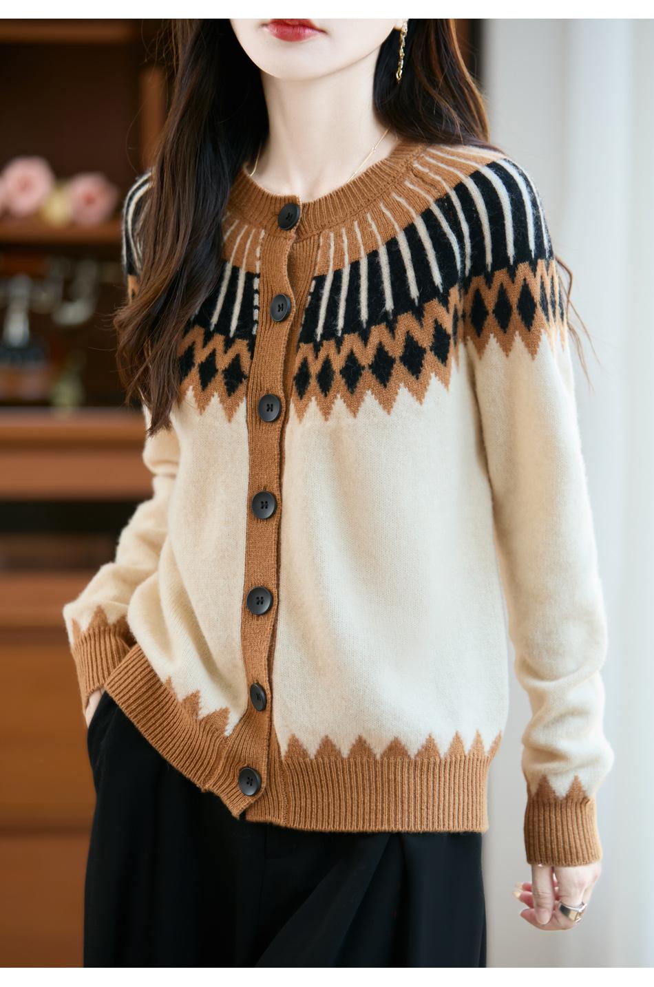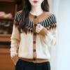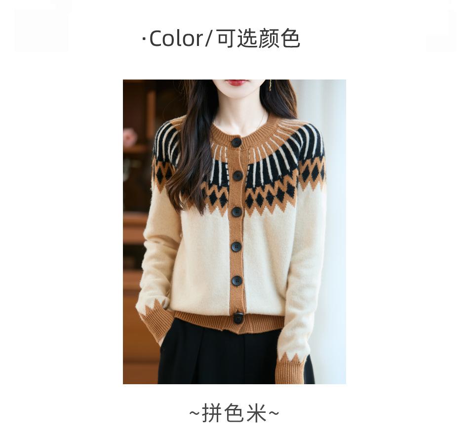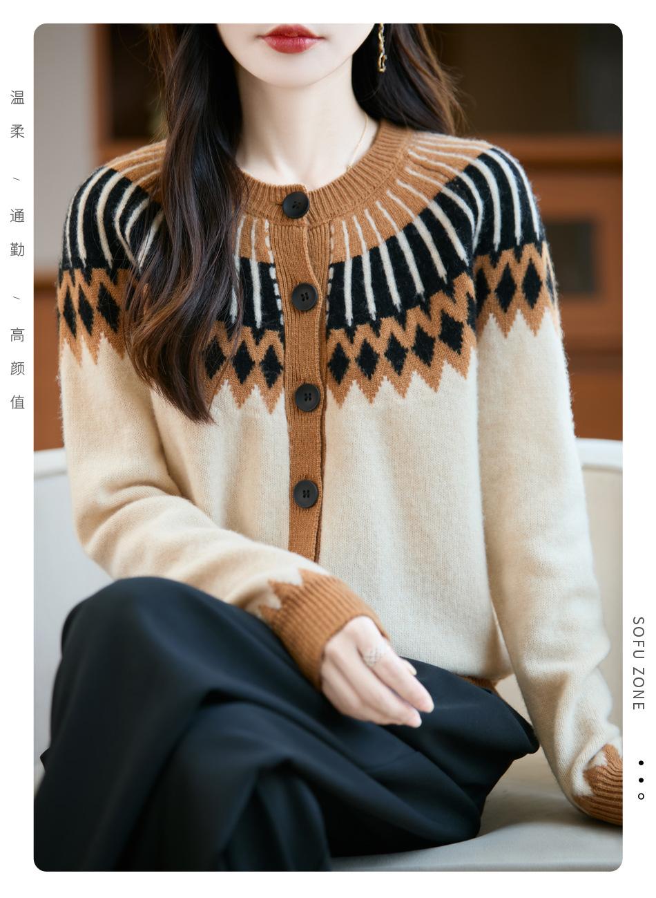 Cárdigan de Punto de Lana Pura de Estilo Étnico Nuevo Otoño/Invierno 2025 de Cuello Redondo y Manga Larga para Mujer con Bloque de Color y Corte Holgado