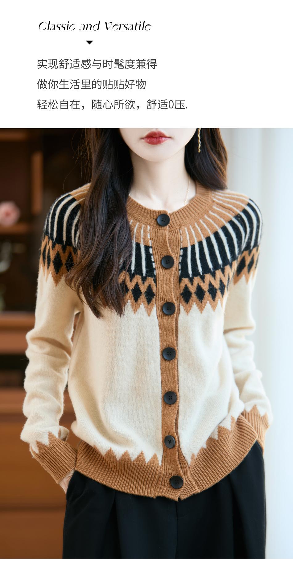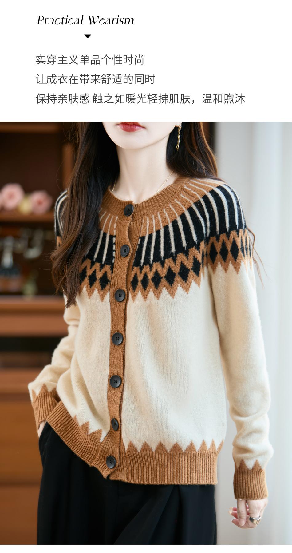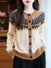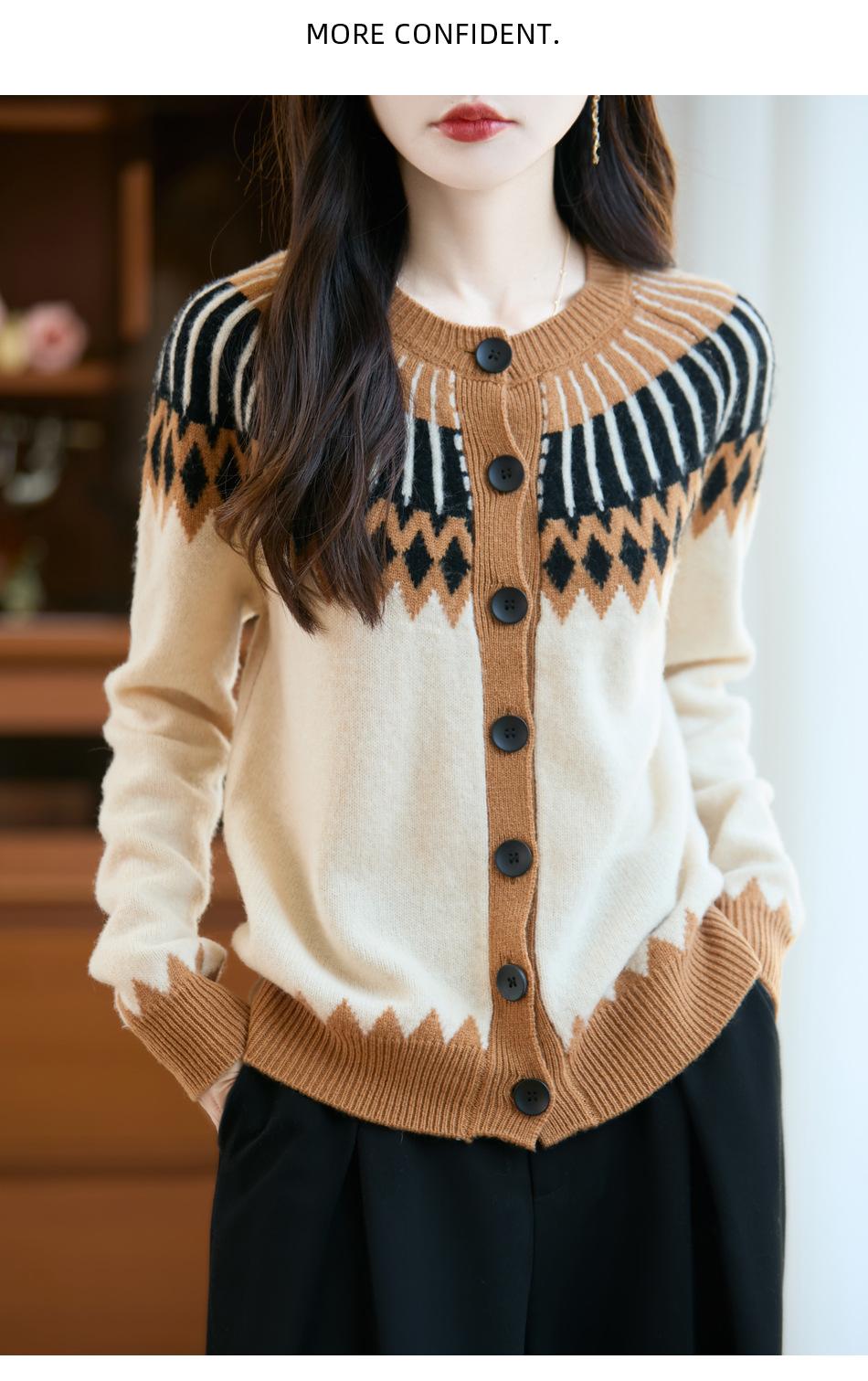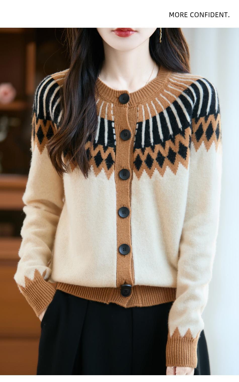Cárdigan de Punto de Lana Pura de Estilo Étnico Nuevo Otoño/Invierno 2025 de Cuello Redondo y Manga Larga para Mujer con Bloque de Color y Corte Holgado