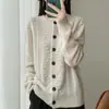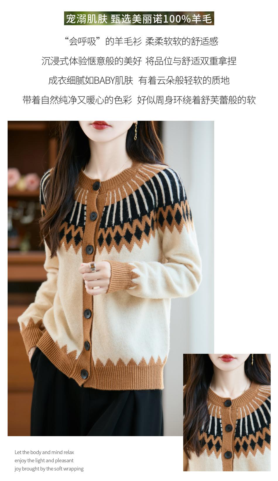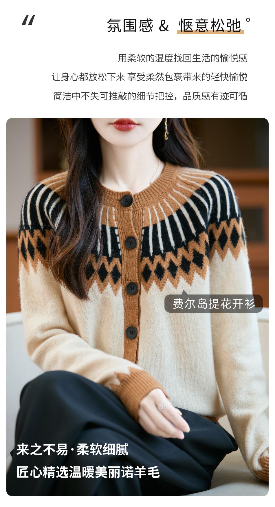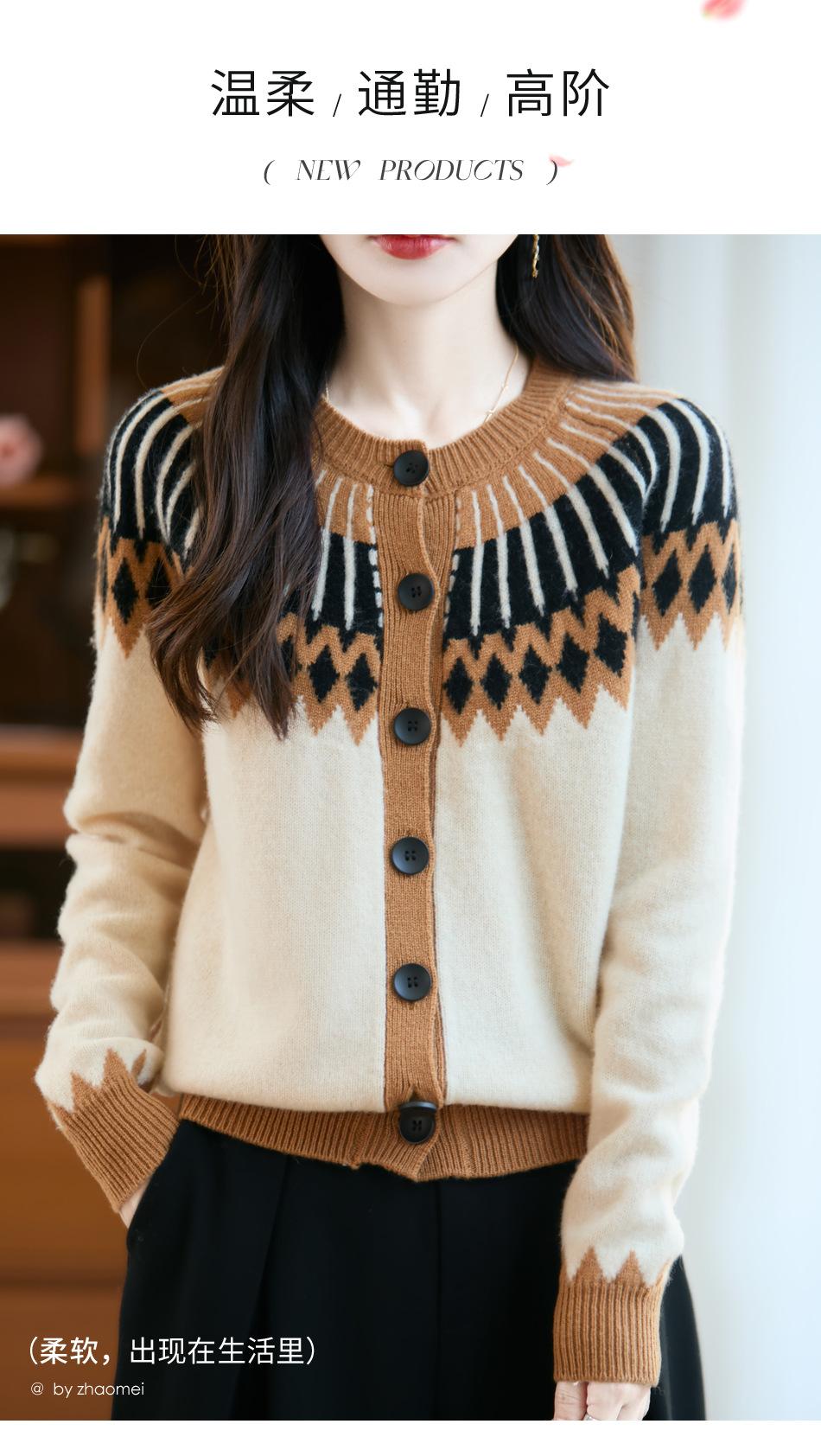 Cárdigan de Punto de Lana Pura de Estilo Étnico Nuevo Otoño/Invierno 2025 de Cuello Redondo y Manga Larga para Mujer con Bloque de Color y Corte Holgado