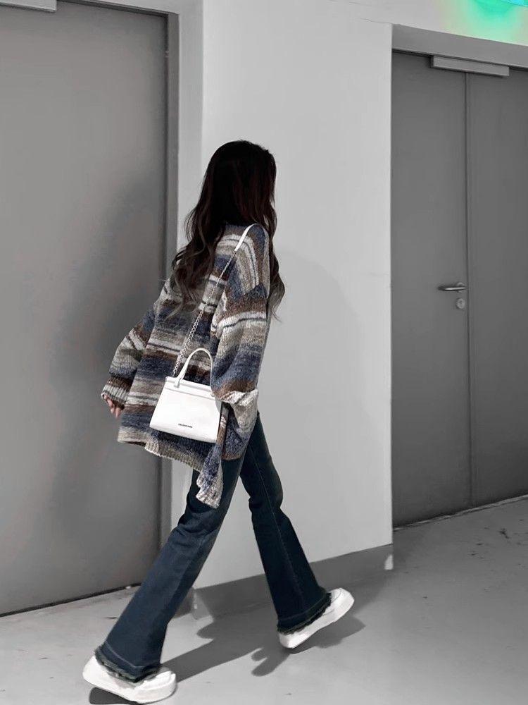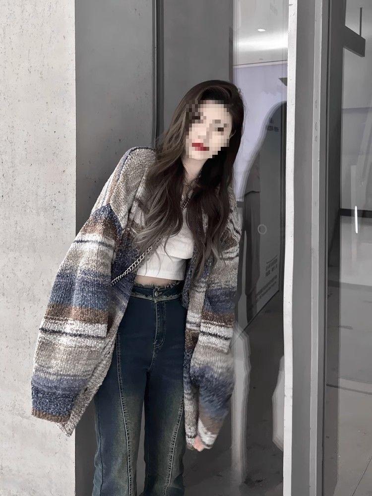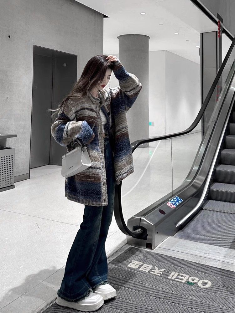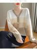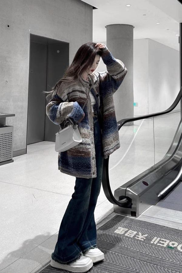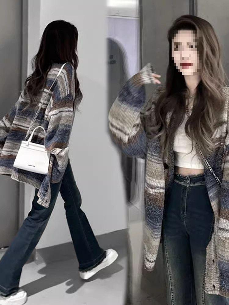 Suéter cárdigan de punto estilo coreano con bloques de color a rayas para mujer otoño invierno diseño delgado nicho holgado perezoso top de punto
