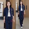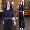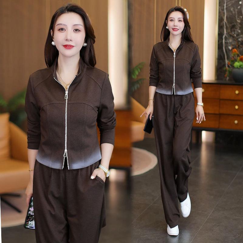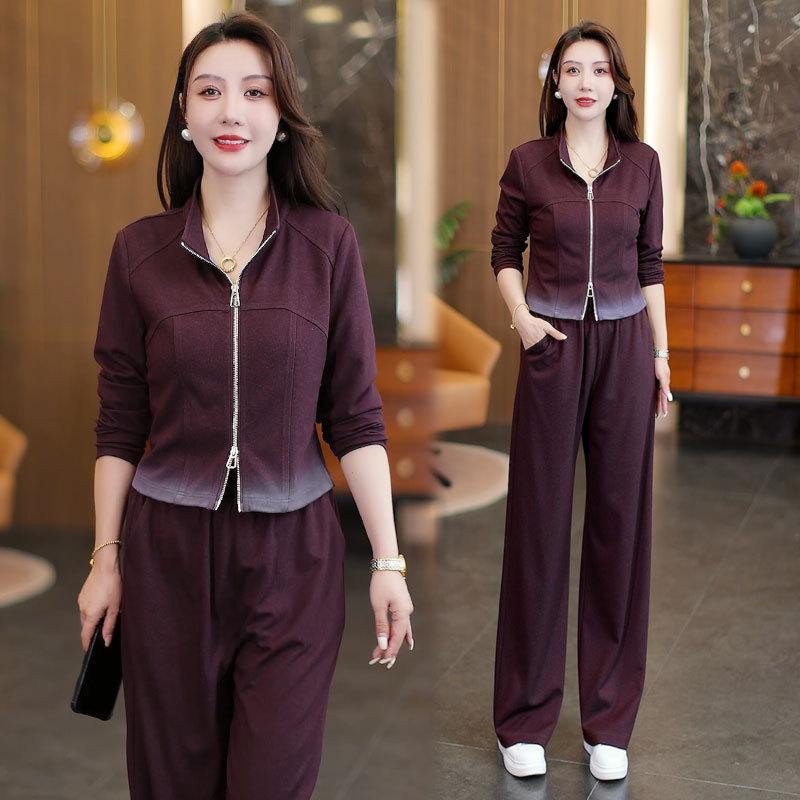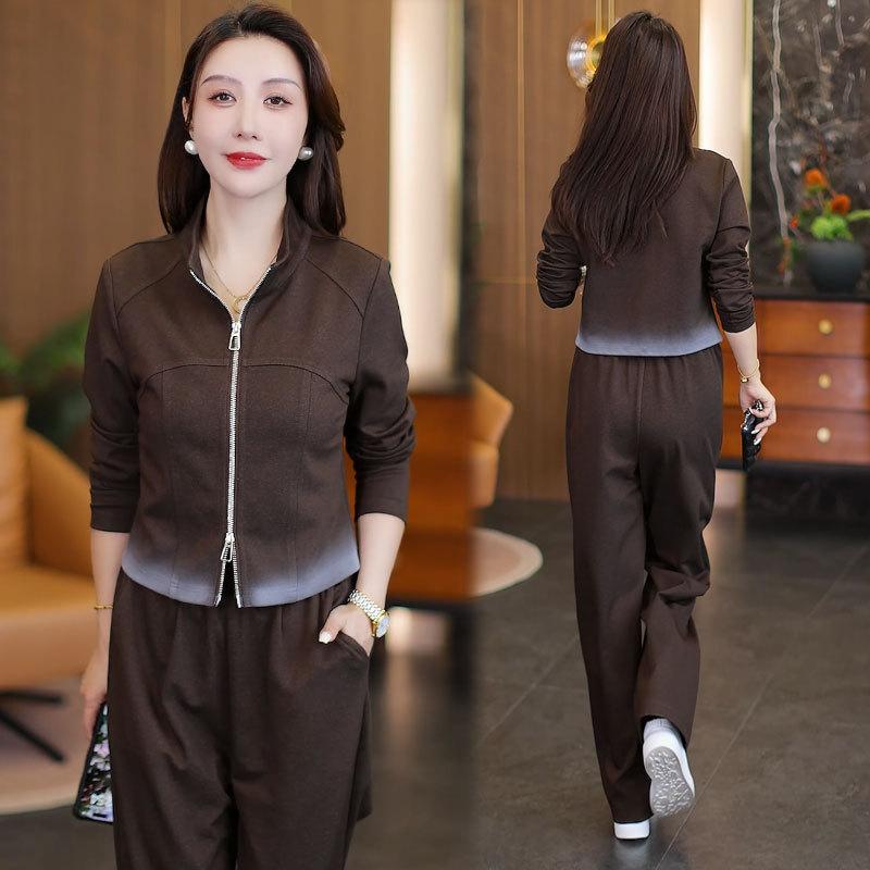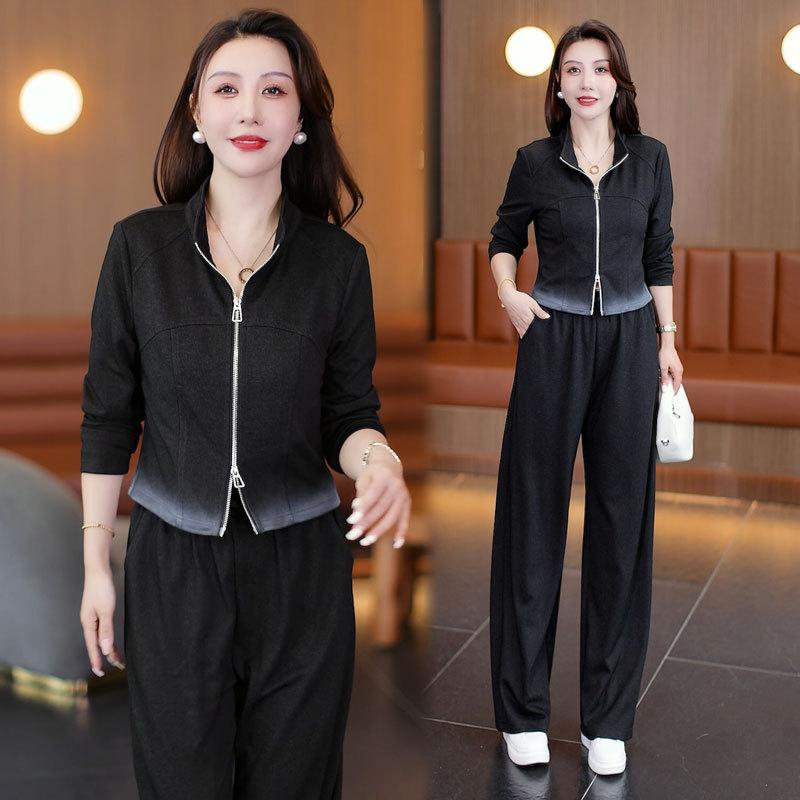 Traje de Moda y Casual para Mujer 2025 Otoño Nuevo Estilo Elegante y Extranjero Chaqueta de Cuello Alto con Doble Cremallera Pantalones de Pierna Ancha Conjunto de Dos Piezas