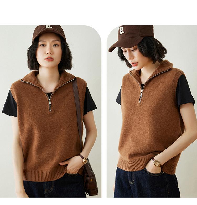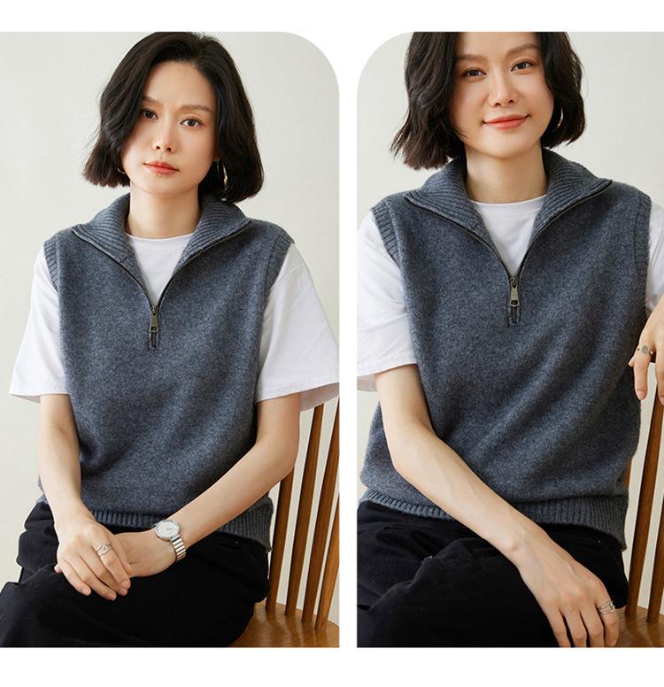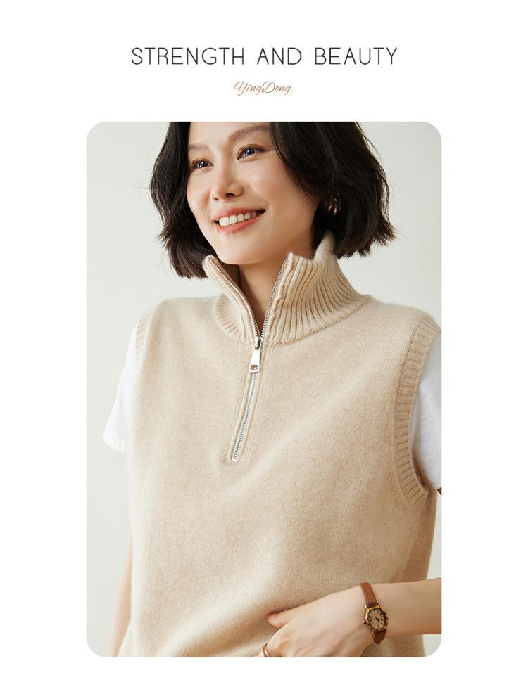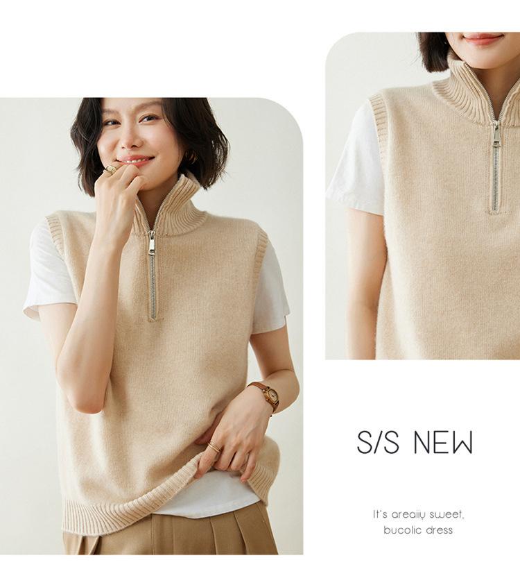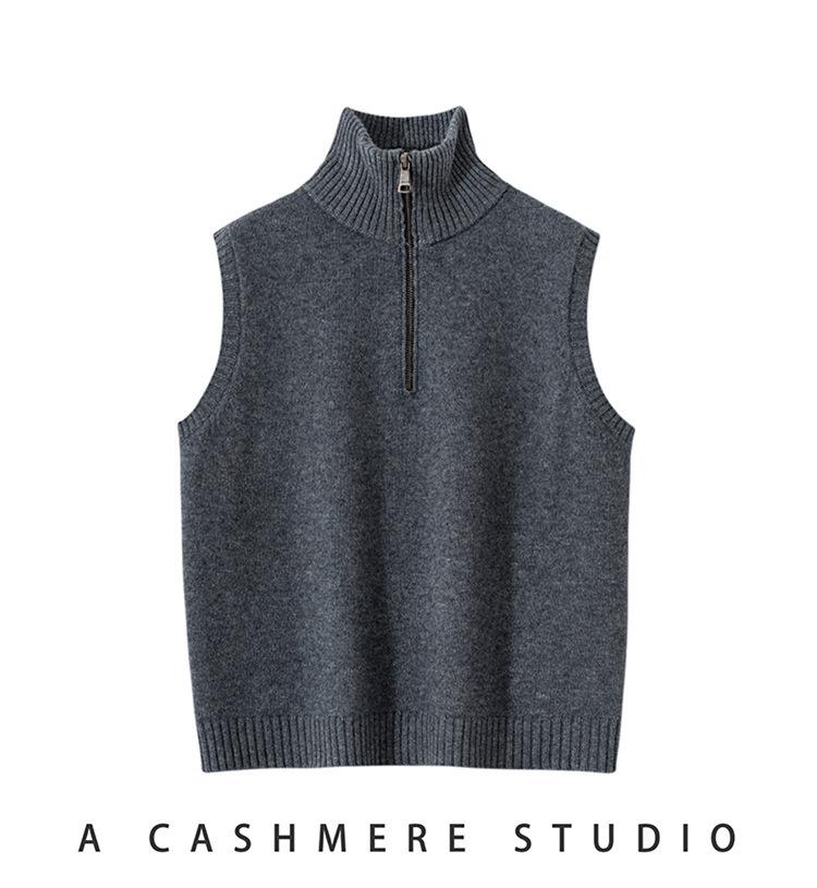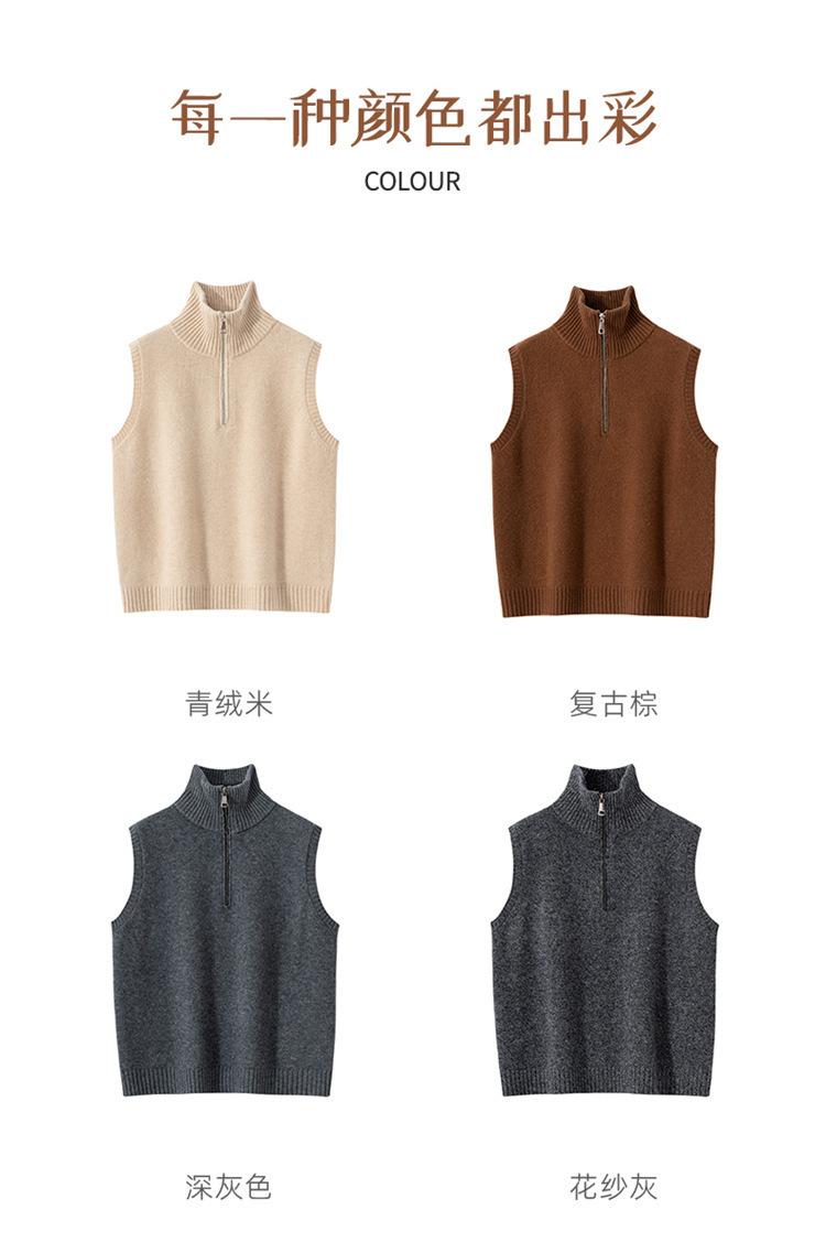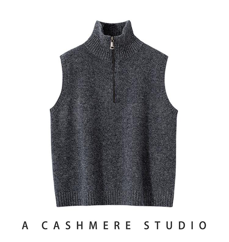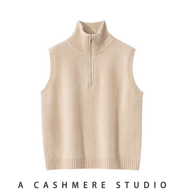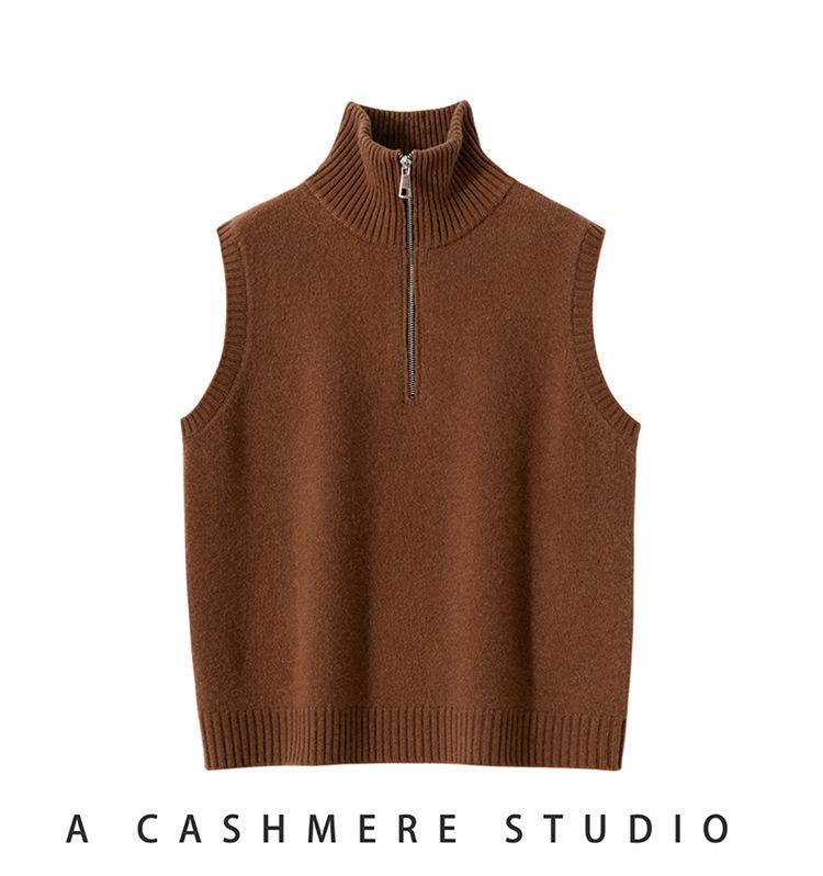 2025 Otoño/Invierno Nuevo Chaleco de Punto de Cachemira para Mujer Sin Mangas Cuello Alto Cierre de Cremallera Color Sólido Cálido Moda Versátil Holgado