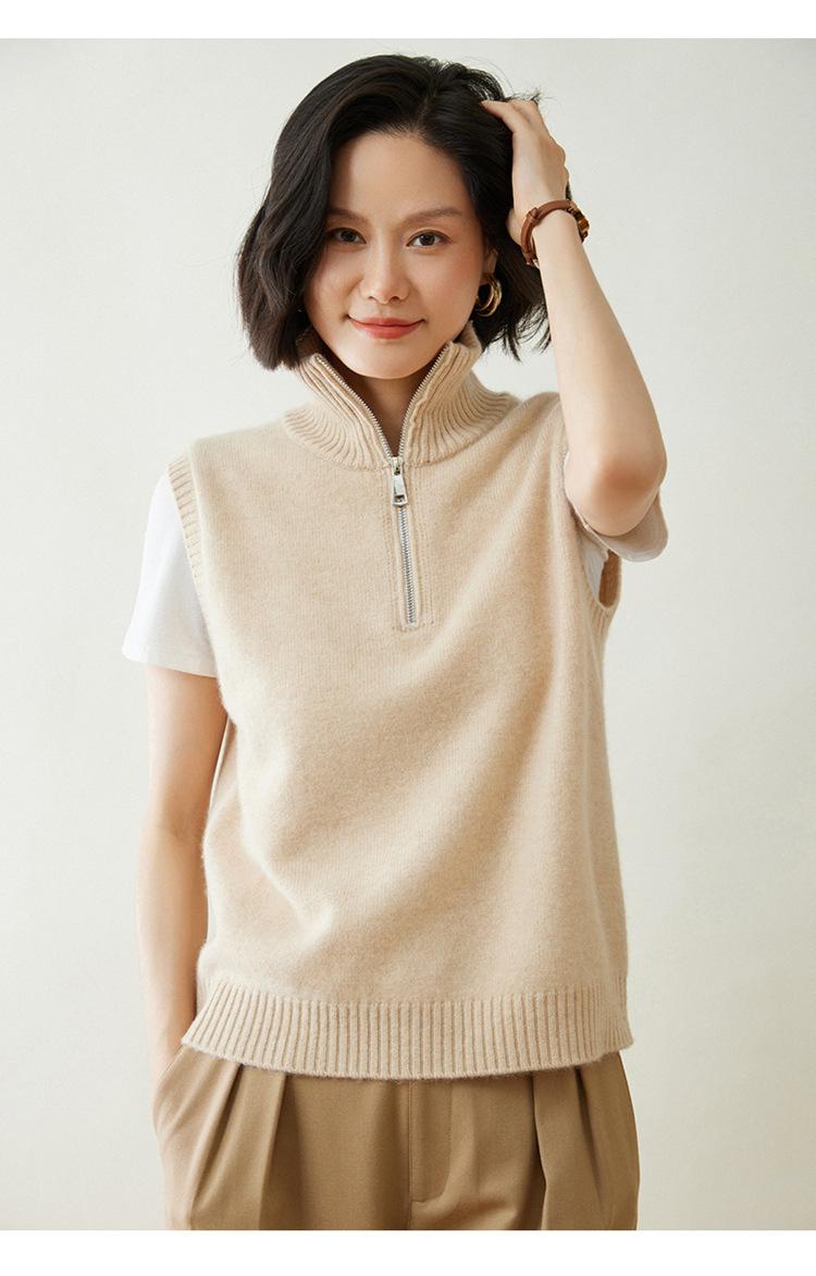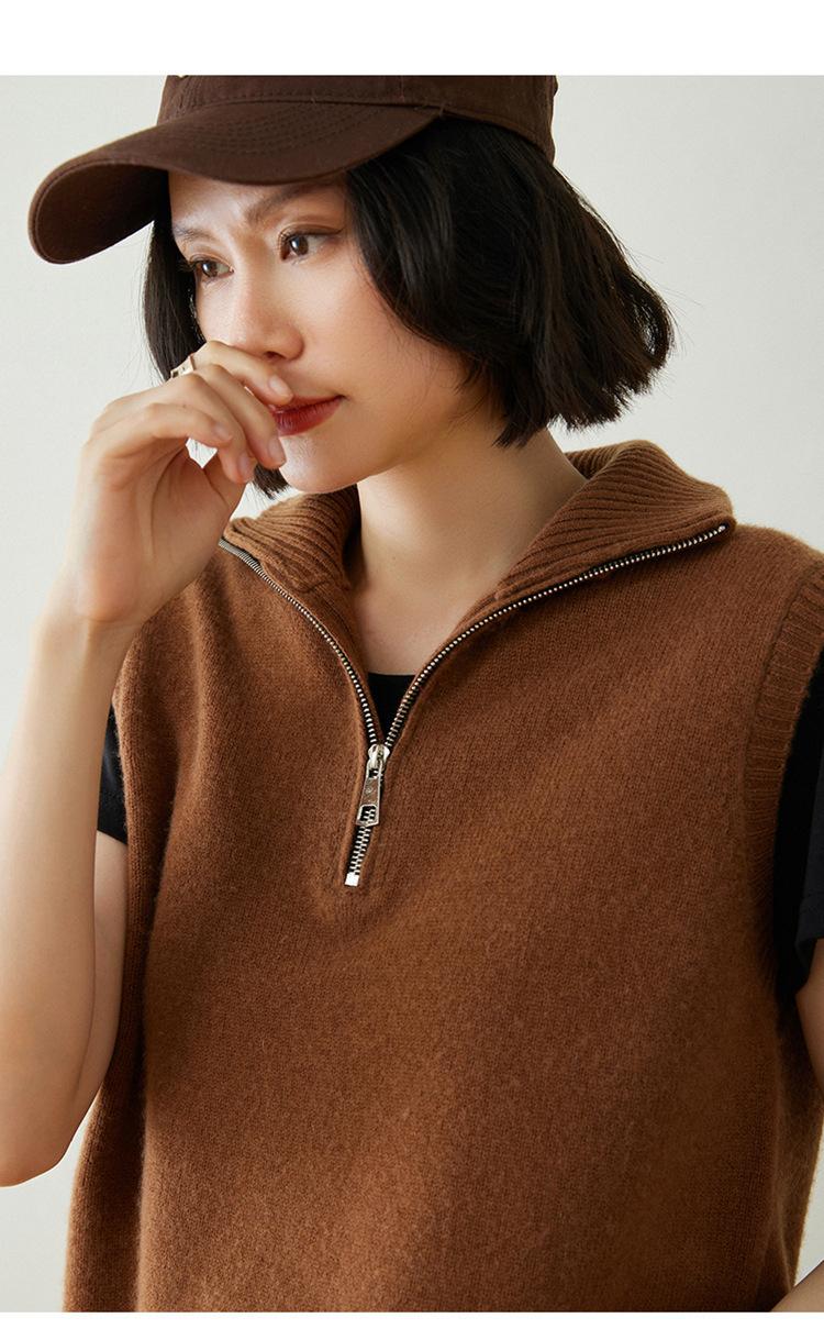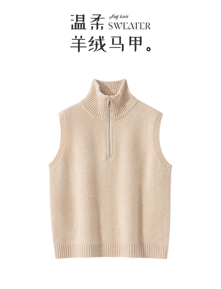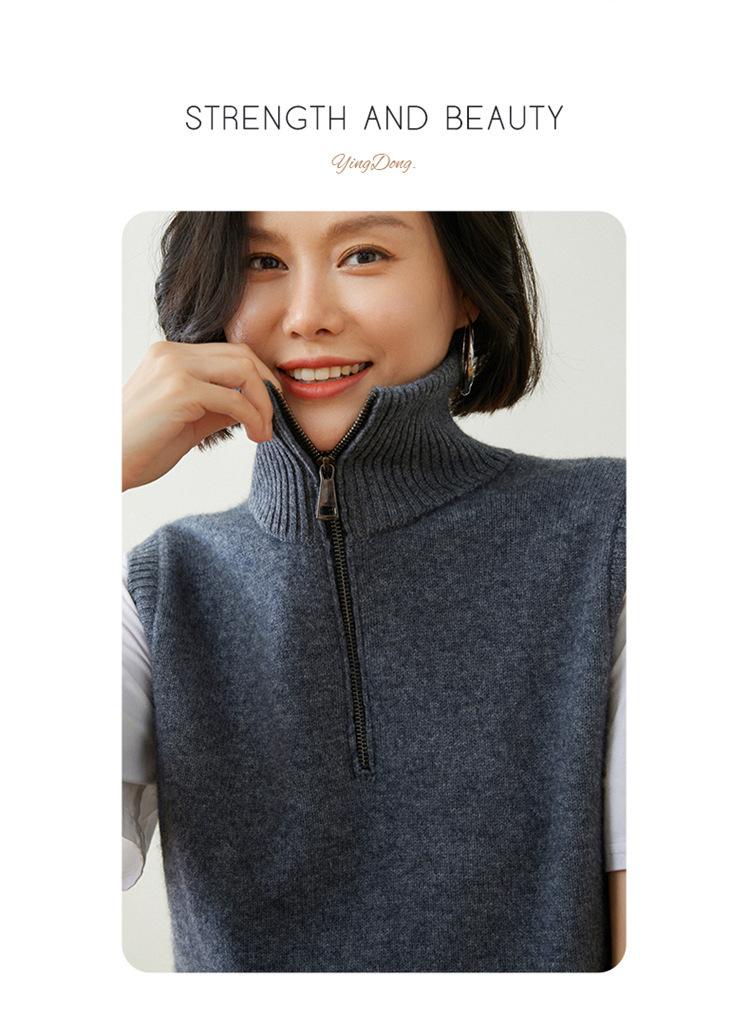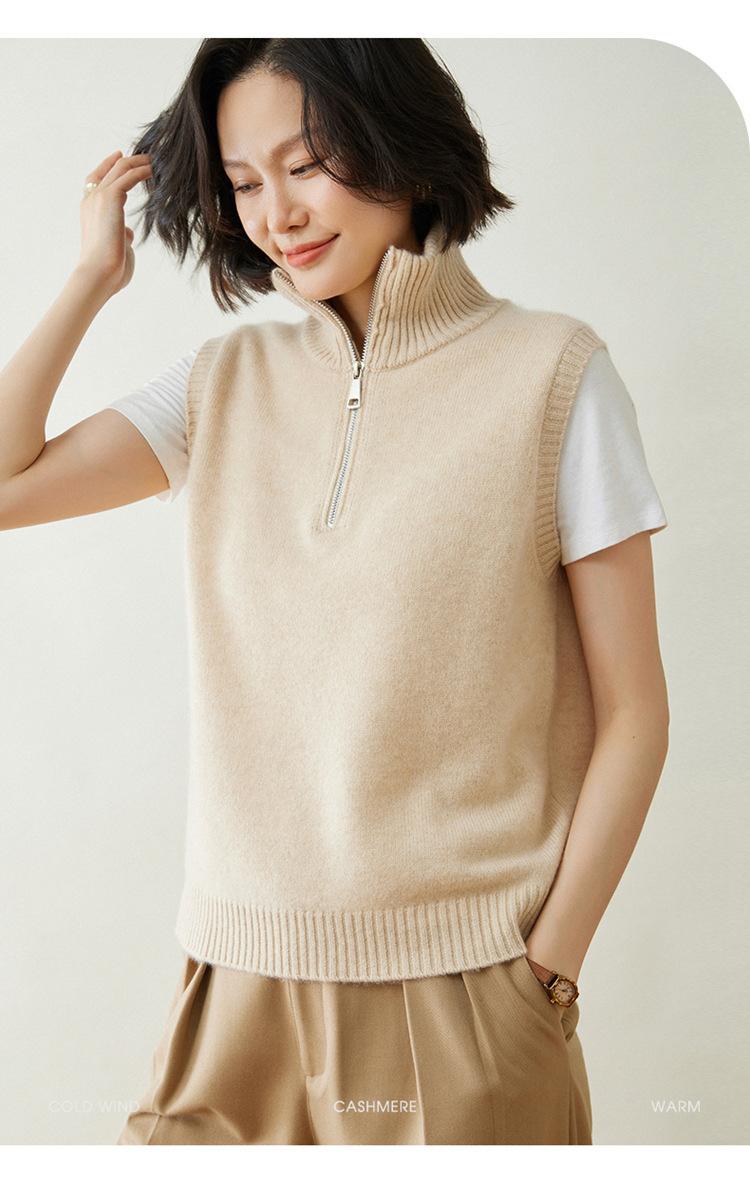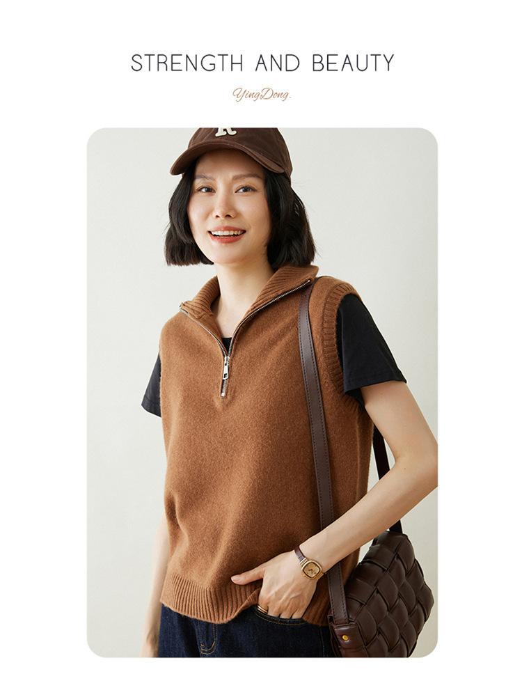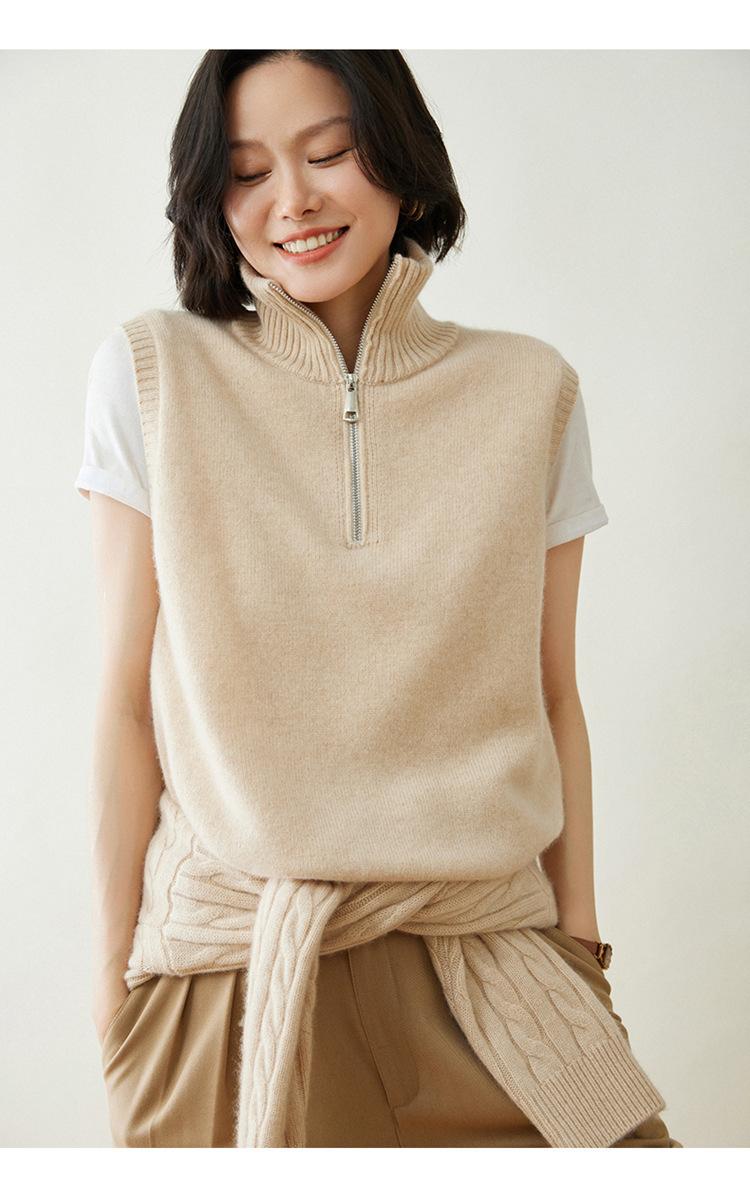 2025 Otoño/Invierno Nuevo Chaleco de Punto de Cachemira para Mujer Sin Mangas Cuello Alto Cierre de Cremallera Color Sólido Cálido Moda Versátil Holgado