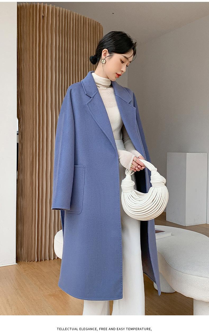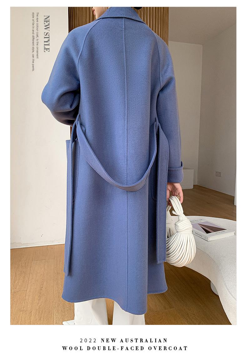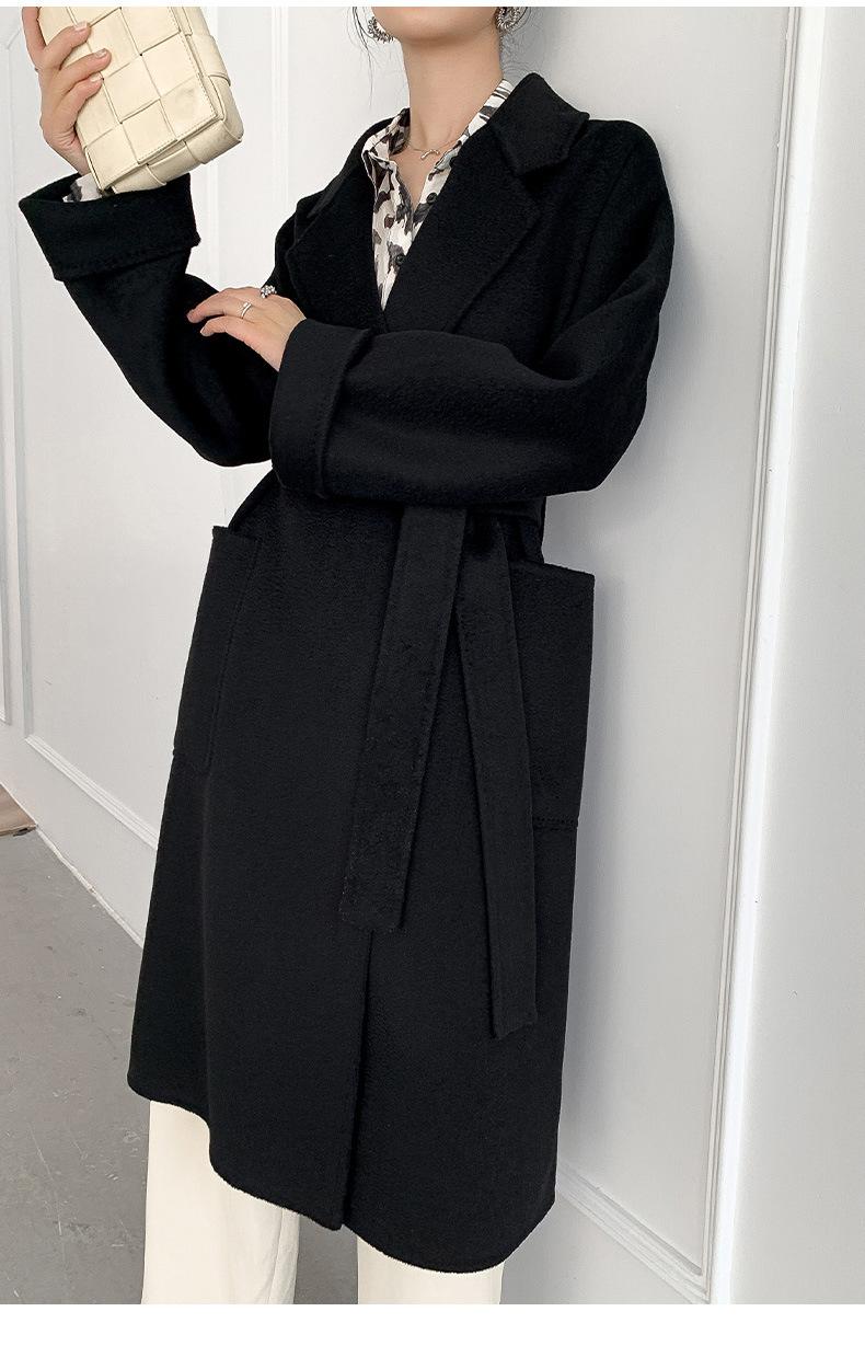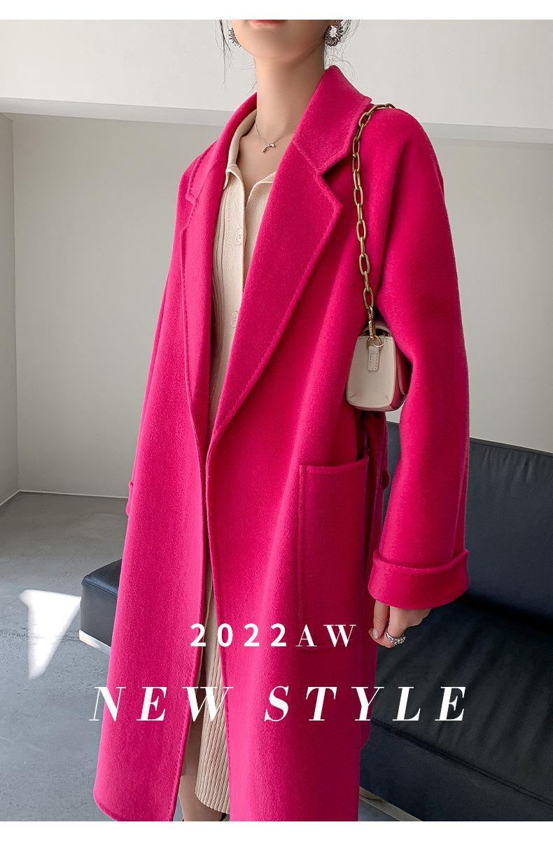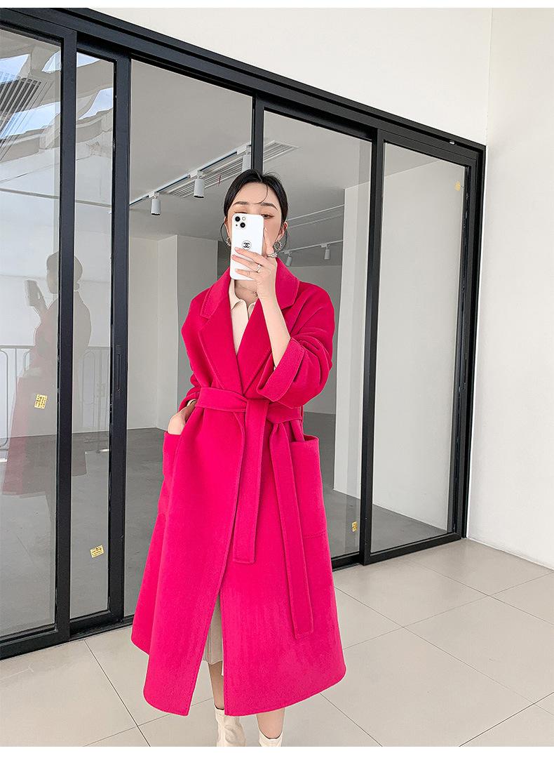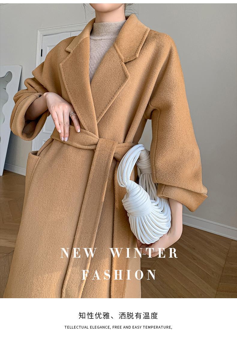Otoño e Invierno Nuevo Abrigo de Tweed de Doble Cara de Lana Pura para Mujer Solapa Grande Largo Medio Estilo Coreano Moda con Cordones Abrigo Grueso