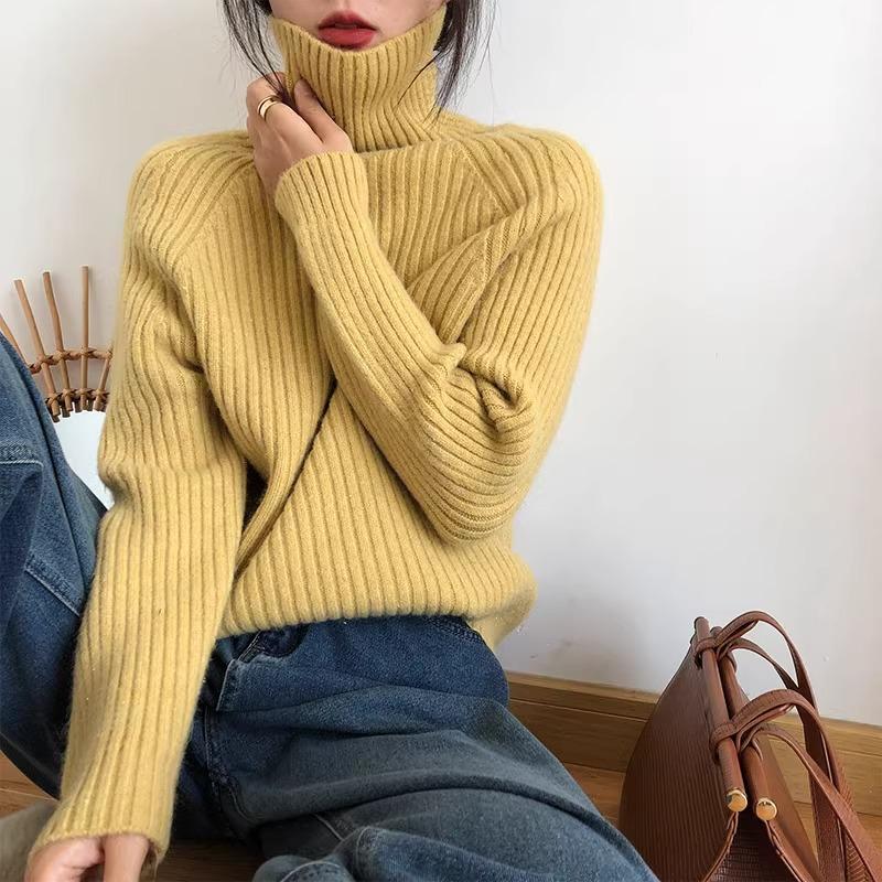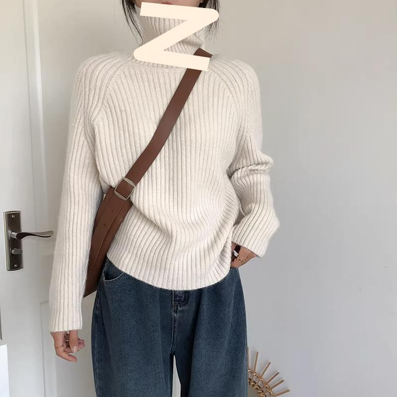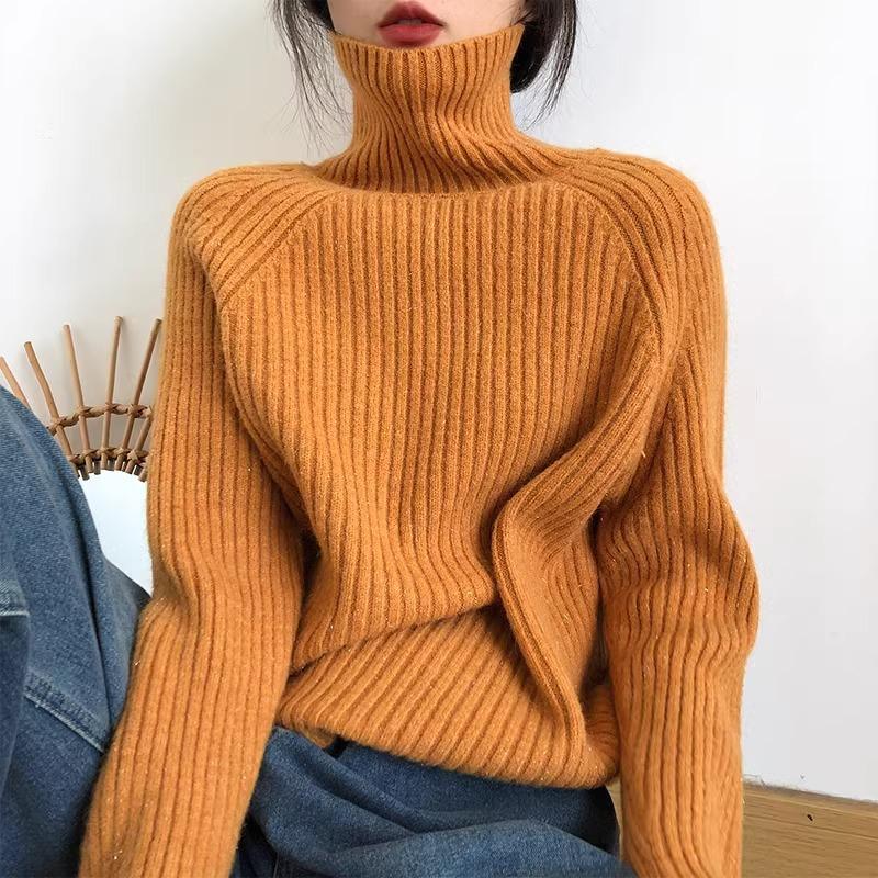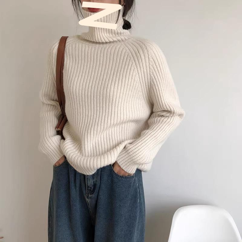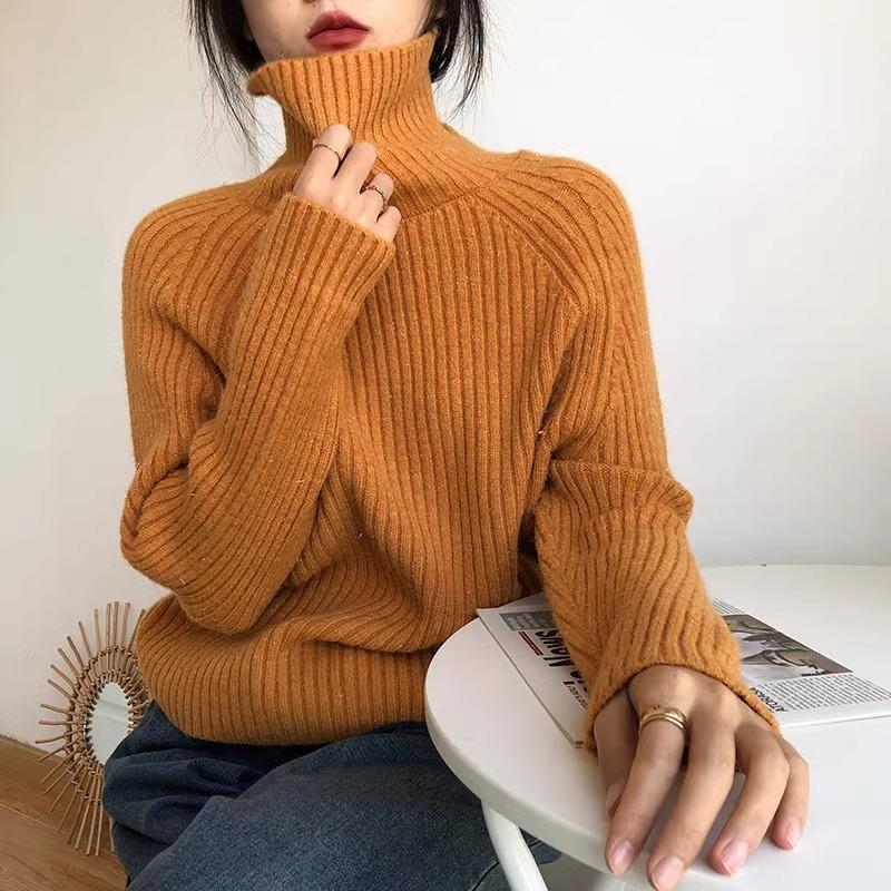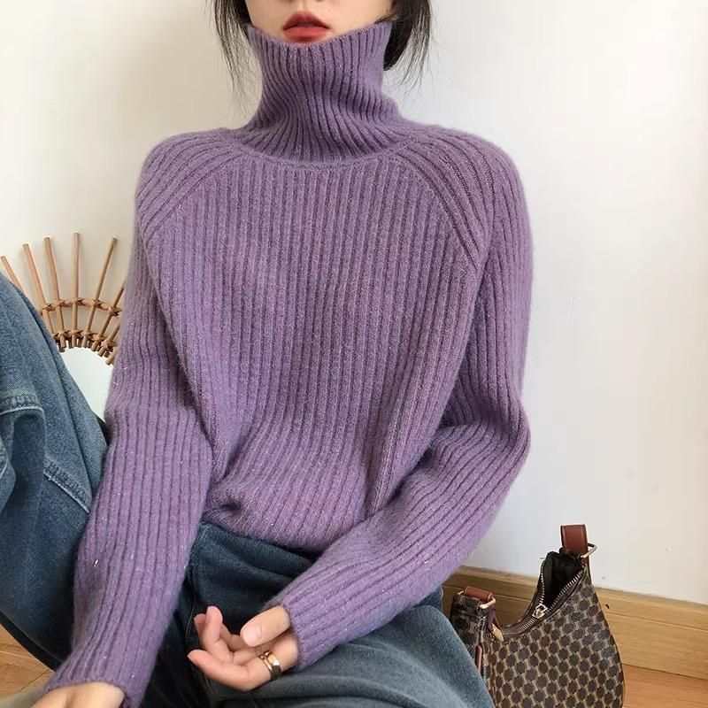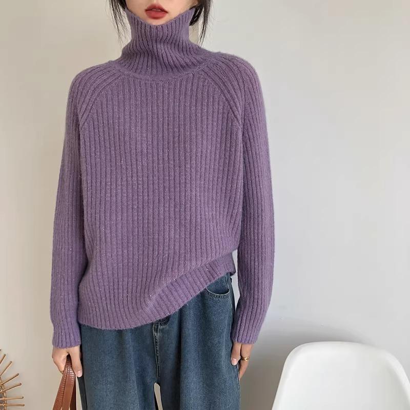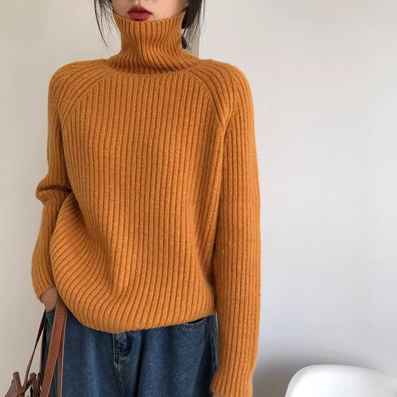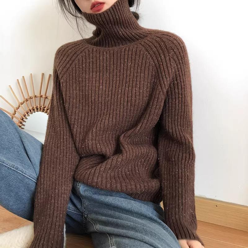 Suéter de Cuello Alto Grueso Cálido con Brillo Fino Estilo Coreano para Mujer Otoño/Invierno Top de Punto Estilo Suave y Flojo de Alta Gama