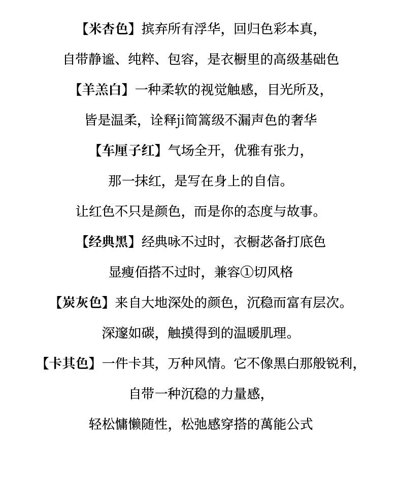 Rice apricot color, Lamb White, Cherry red, Classic black, charcoal gray, Khaki