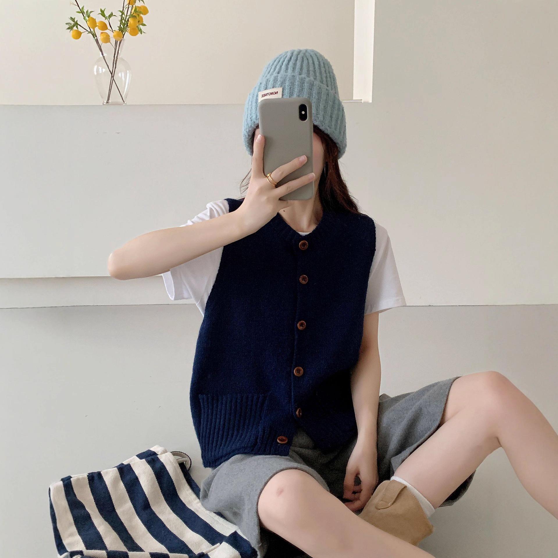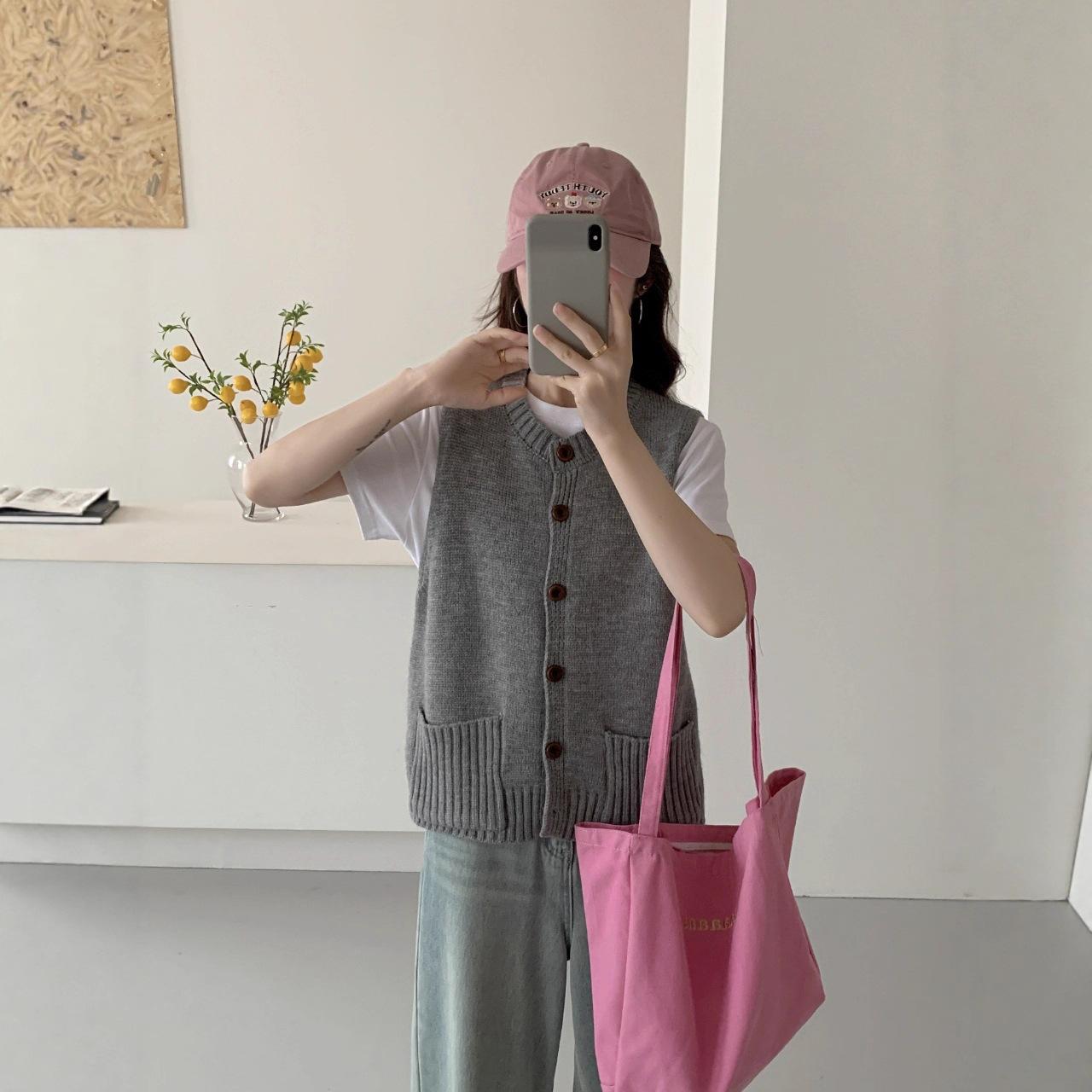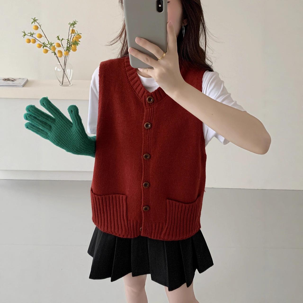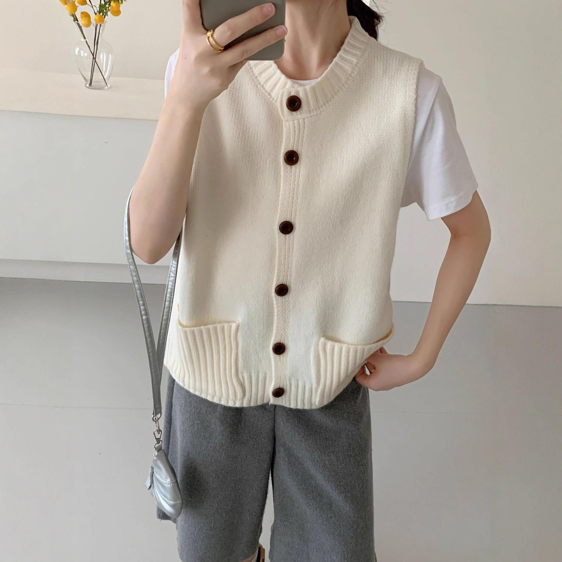Estilo Dulce Cuello Redondo Bolsillo Chaleco de Punto Cárdigan para Mujer Otoño Invierno Capas Suave Sin Mangas Calentador de Hombros Chaleco Suéter
