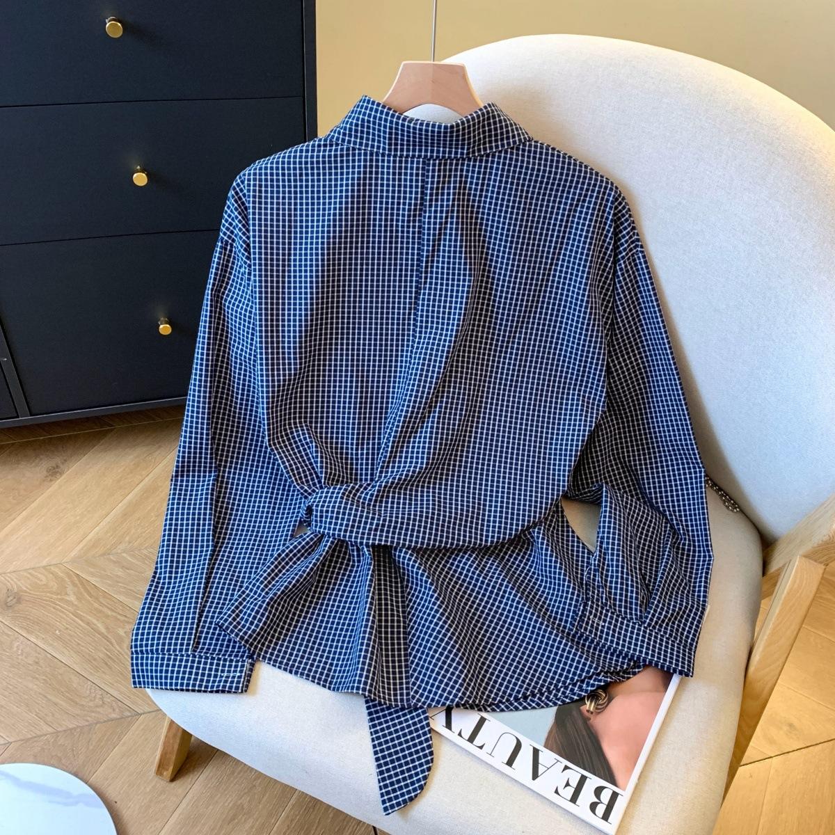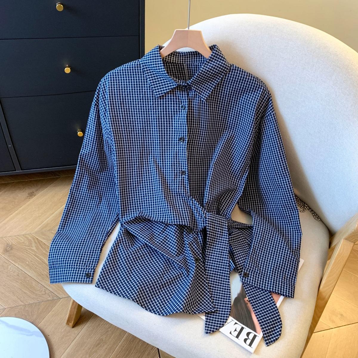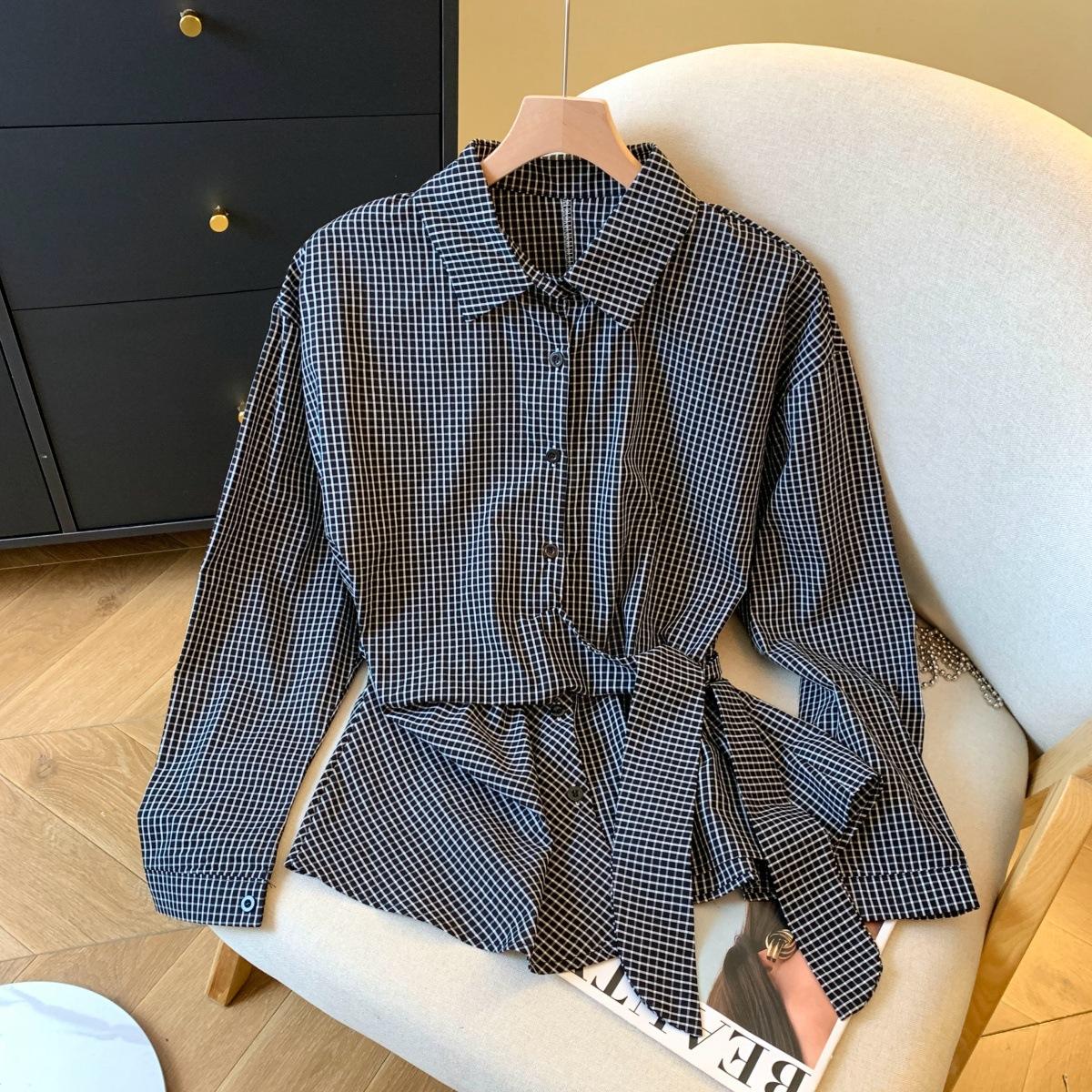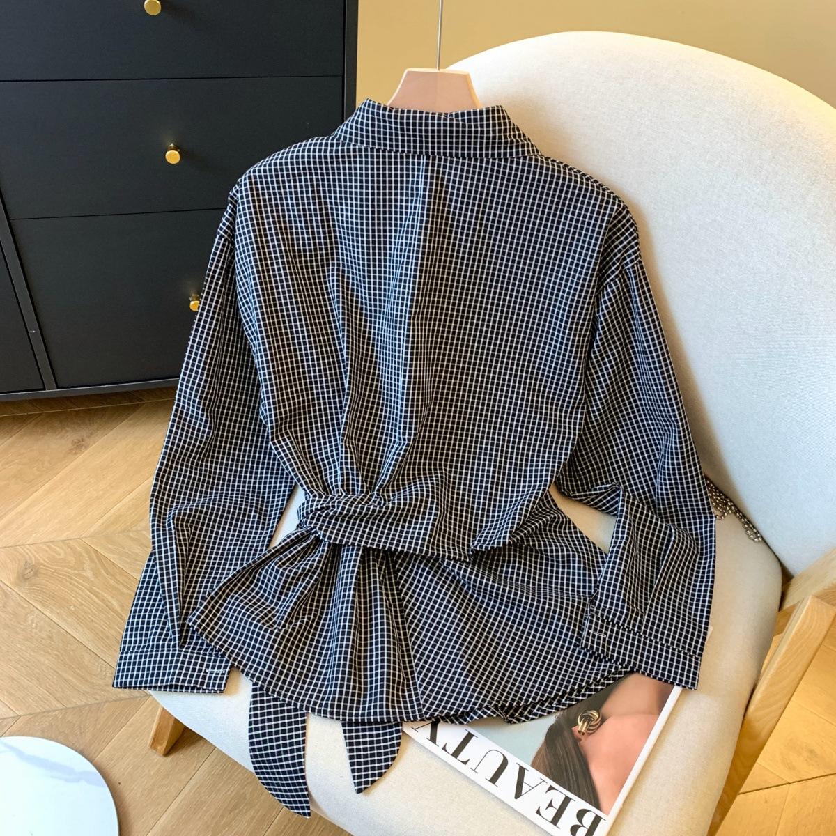 Foto Real Camisa de Cuadros Retro a la Moda Mujer 2025 Otoño Nueva Cuello Polo Diseño con Lazo Recogido en la Cintura Top de Manga Larga